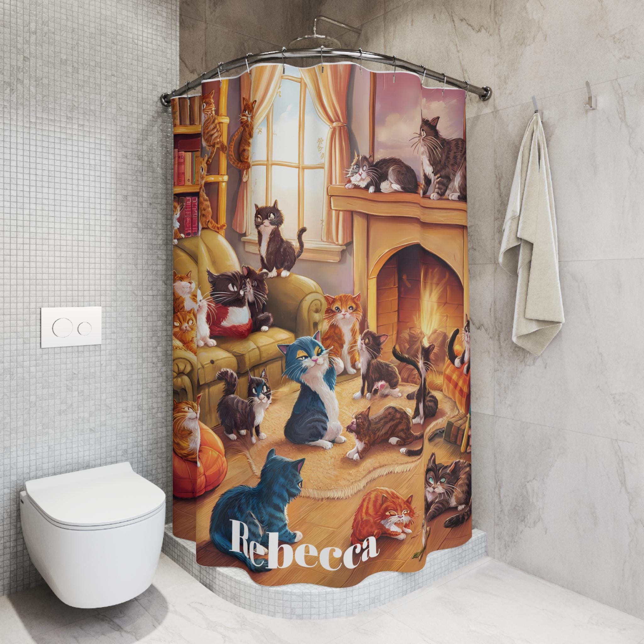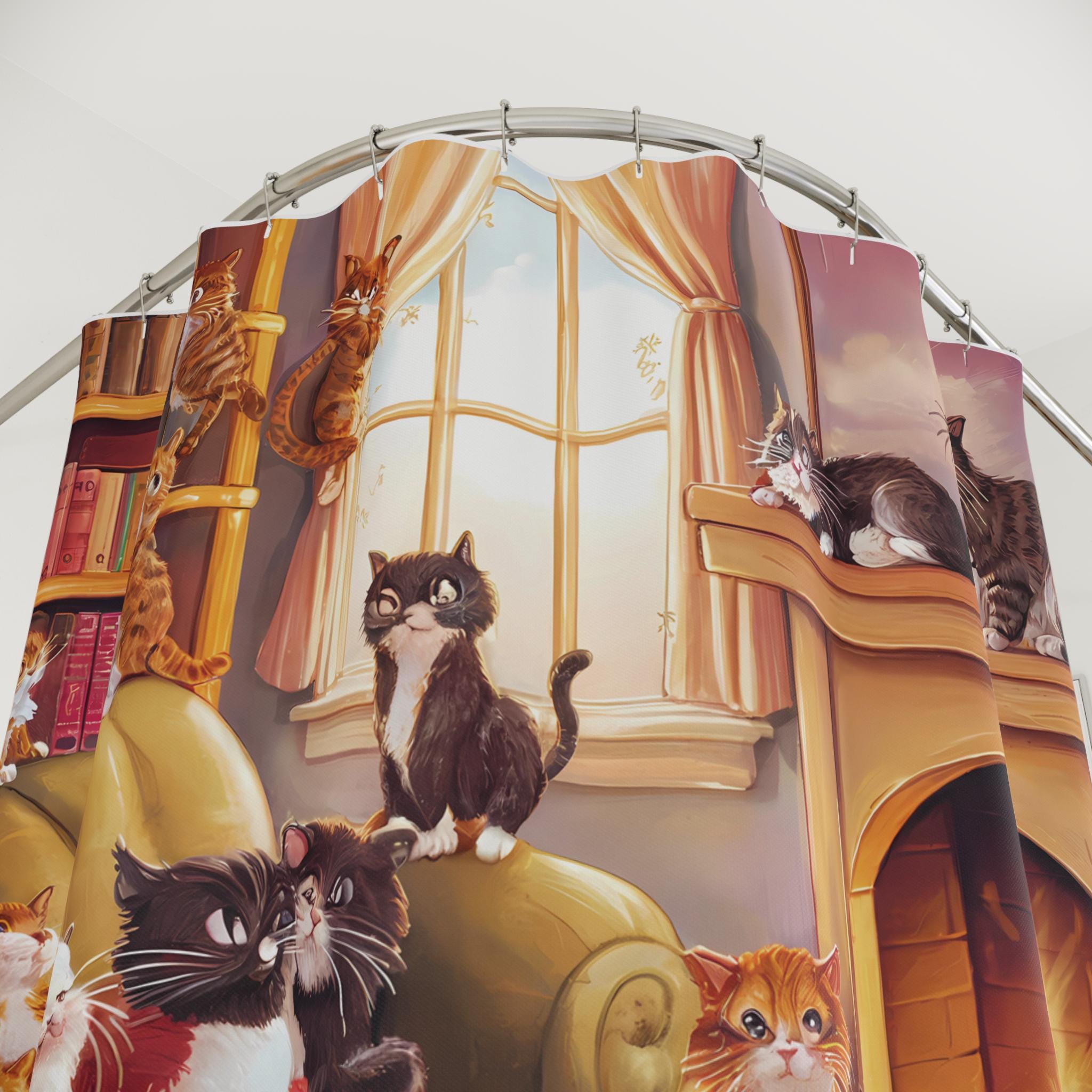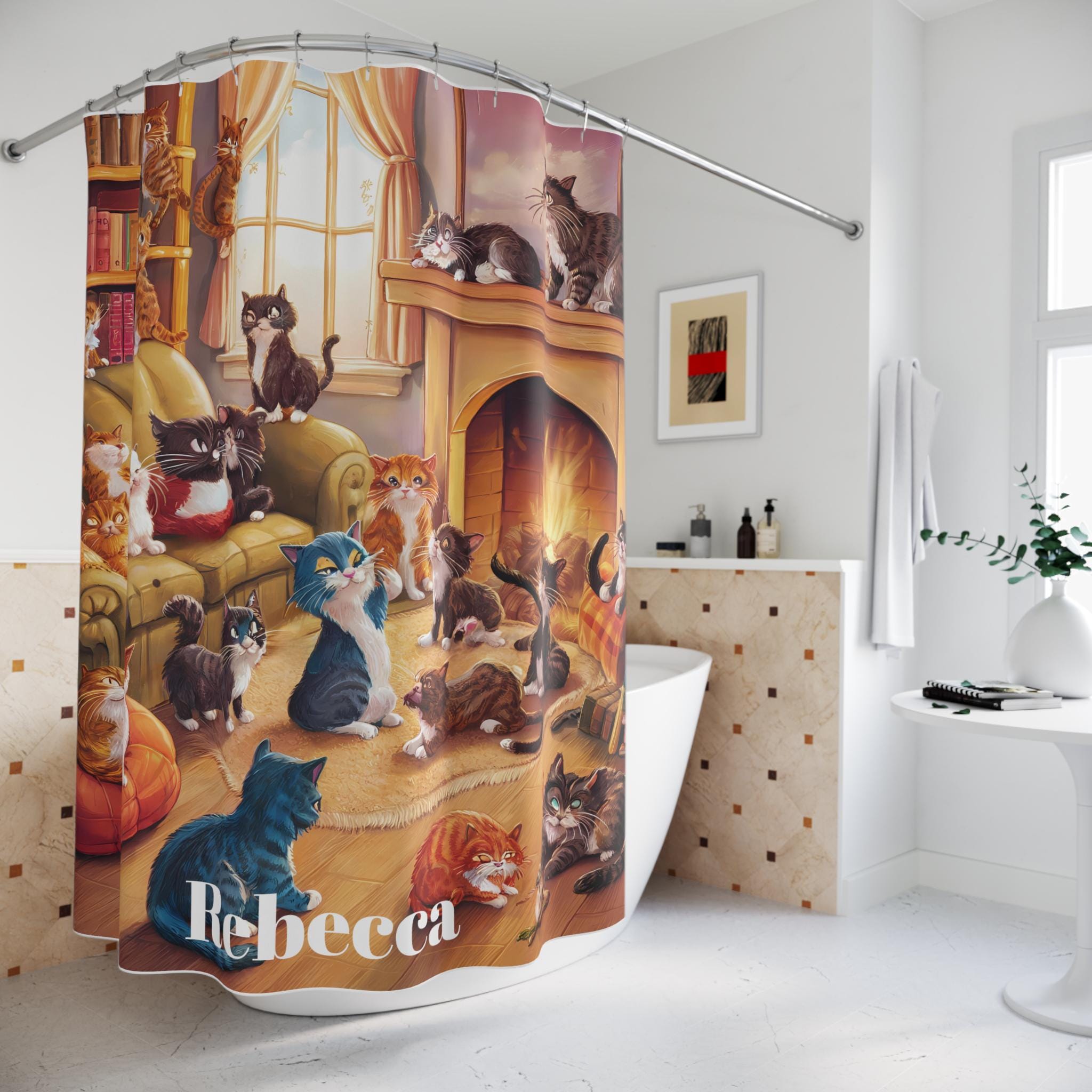 Transform your bathroom into a whimsical retreat with our delightful shower curtain. This charming piece features a playful scene full of feline friends, bringing warmth and joy to your daily routine. It’s perfect for cat lovers and adds a touch of cheer to any bathroom decor. Ideal for anyone looking to brighten their space, this shower curtain makes an excellent gift for holidays like Christmas, birthdays, or even housewarming parties. Embrace the cozy atmosphere it creates, making every shower feel like a delightful escape. This product was made with the help of AI.