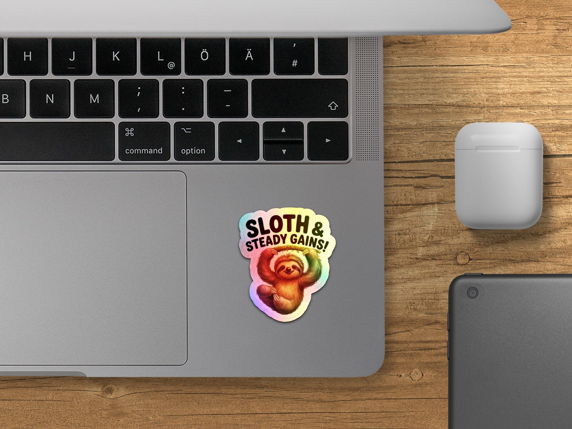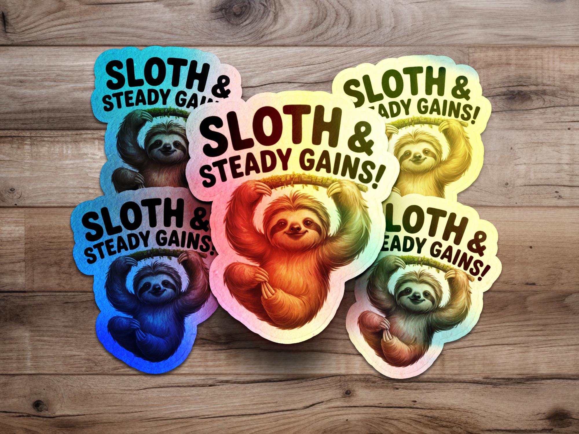 Add some fun motivation to your life with this adorable sloth sticker! Featuring a cute sloth holding a branch with the words "Sloth and Steady Gains!", this sticker is perfect for gym enthusiasts, animal lovers, or anyone who needs a little reminder to keep going.