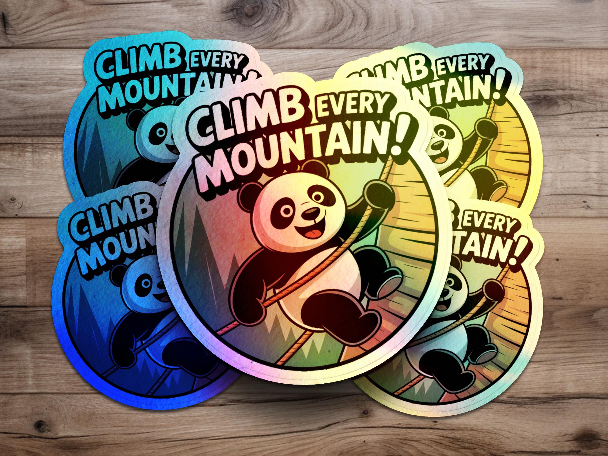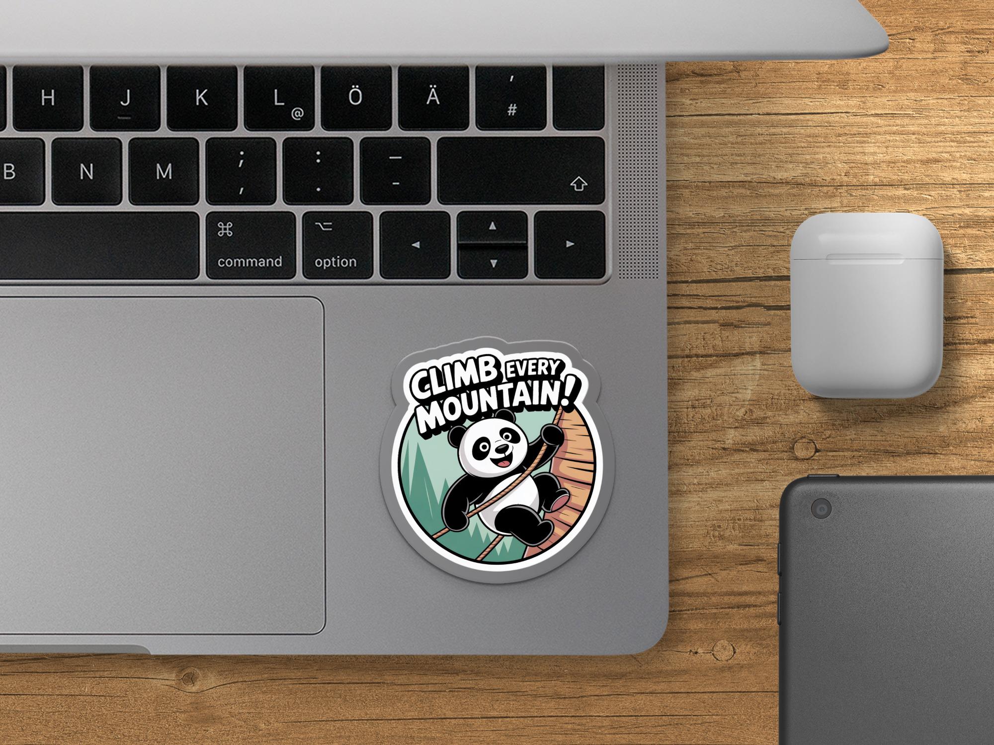 The design showcases a cute panda bear climbing a rope with a determined expression. The sticker prominently displays the motivational phrase "Climb Every Mountain!" The background includes a scenic depiction of mountains and trees, enhancing the adventurous theme. The sticker is designed with a playful, cartoon style, perfect for all ages. It is an ideal gift for adventurers, dreamers, and anyone needing a little encouragement.