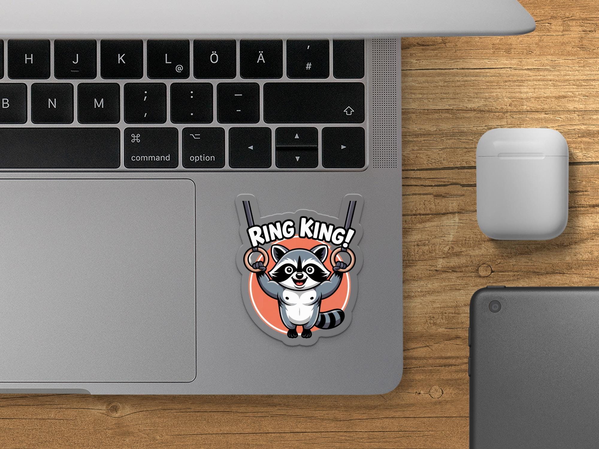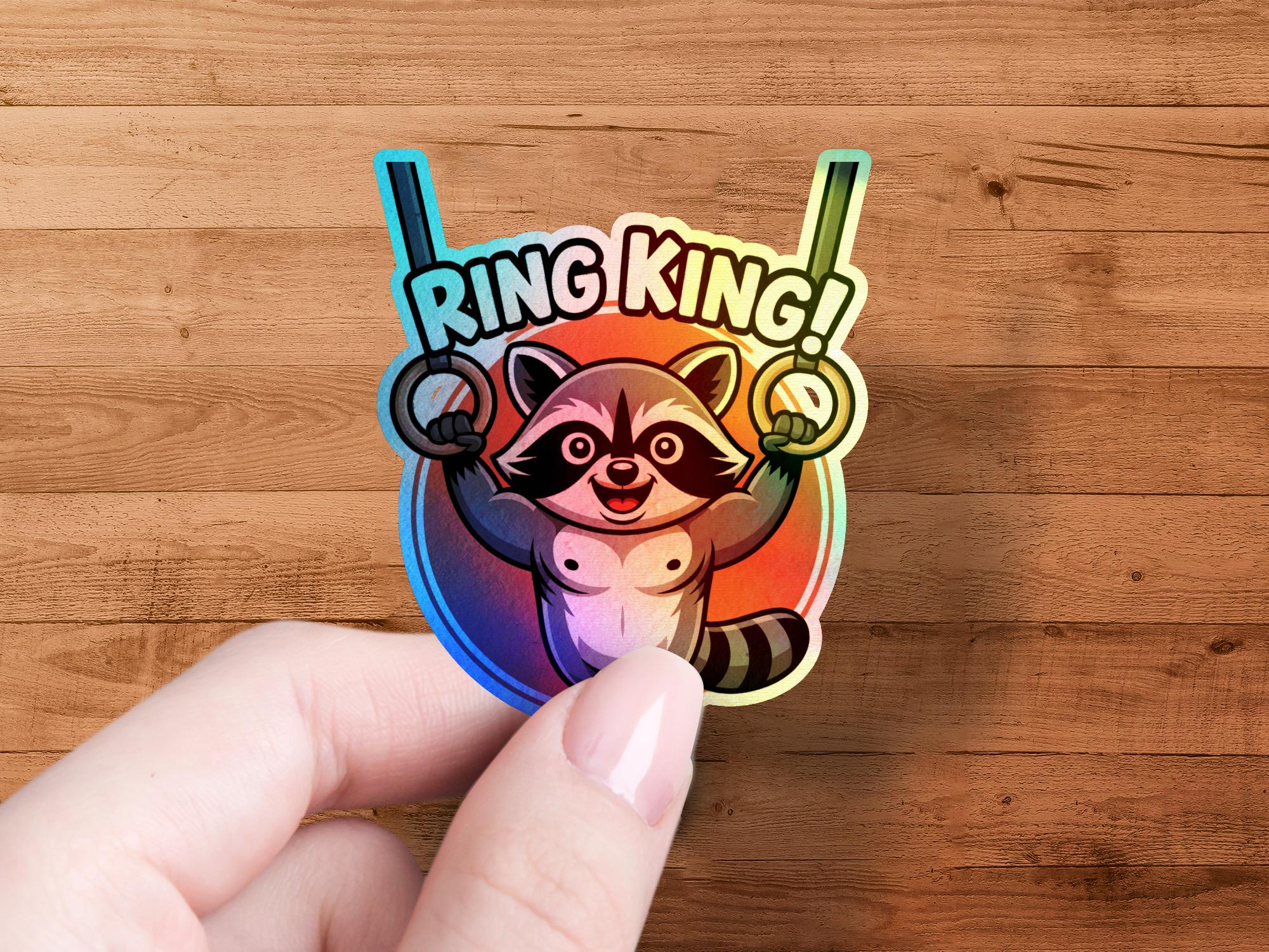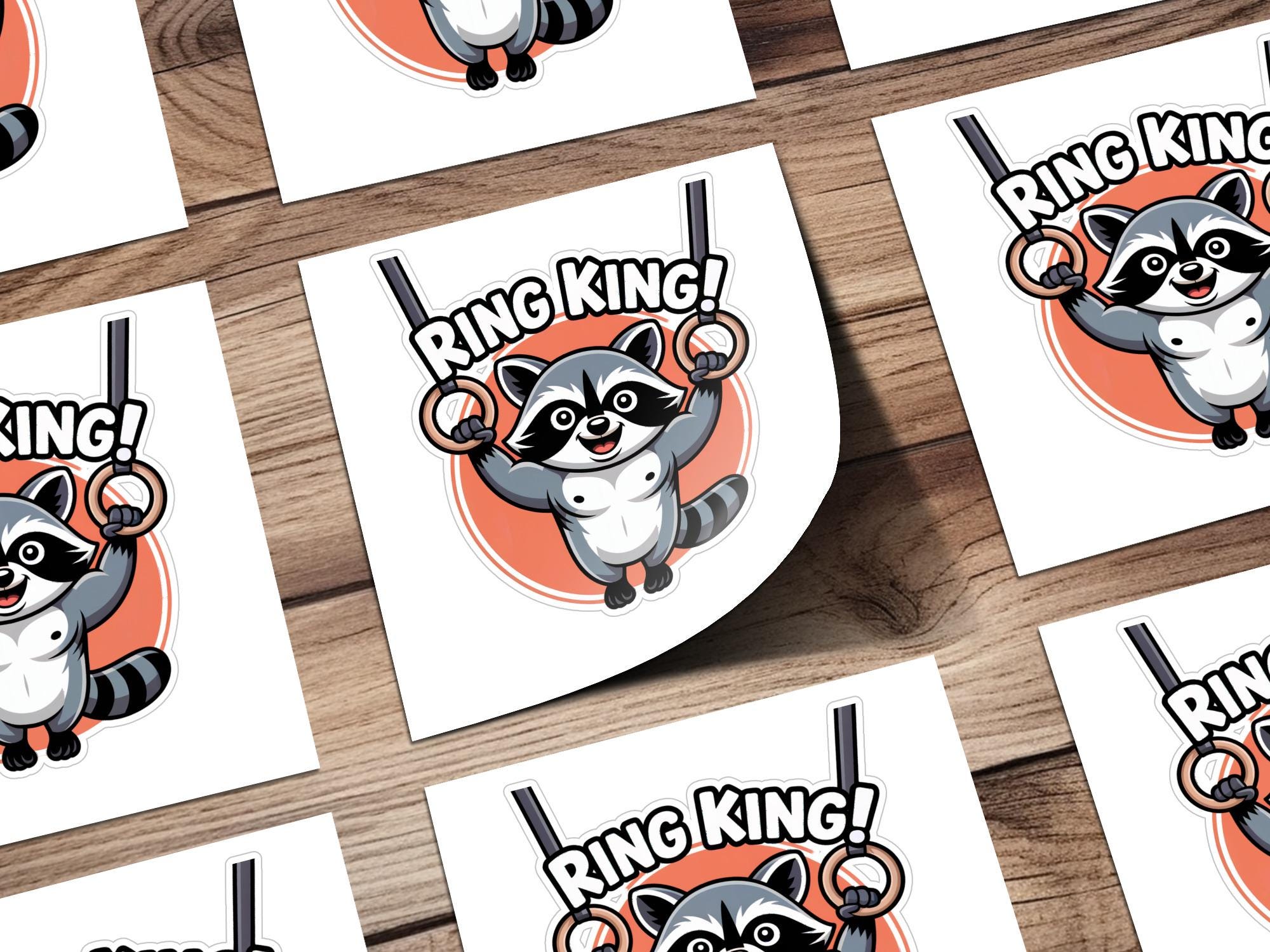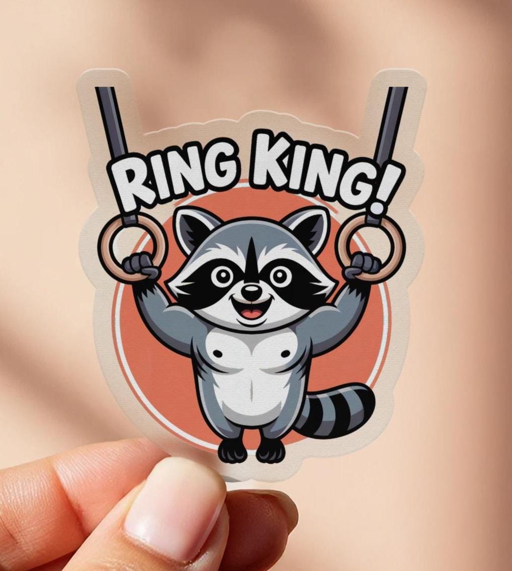 Add a touch of humor and personality to your belongings with this adorable "Ring King" raccoon sticker. This fun decal features a cute cartoon raccoon mastering the gymnastics rings, making it a perfect gift for gymnasts, animal lovers, or anyone who appreciates a good laugh. Stick it on your laptop, water bottle, phone, or any other smooth surface to showcase your unique style.