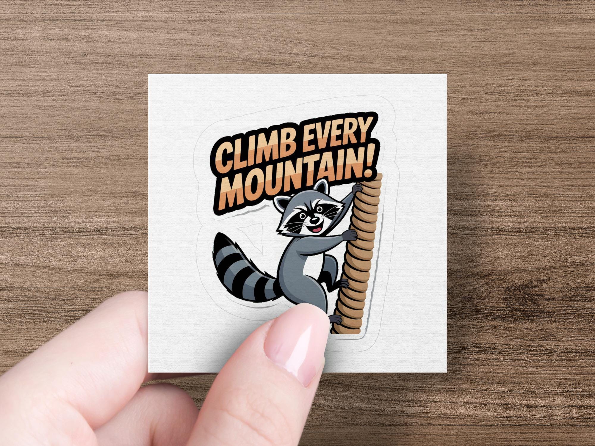 This adorable raccoon sticker features a determined raccoon climbing a rope, accompanied by the inspiring text "Climb Every Mountain!". This sticker is sure to bring a smile to your face and inspire you to reach your goals. It's perfect for decorating laptops, water bottles, notebooks, and more.