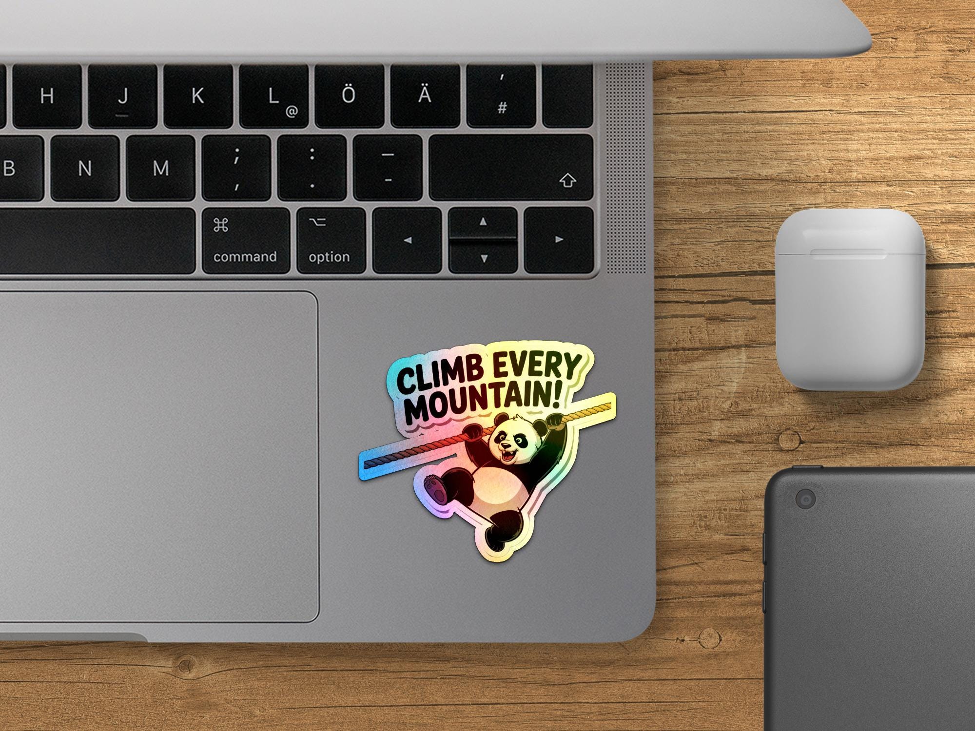 The Climb Every Mountain Panda Sticker showcases a playful design that is sure to bring a smile to your face.