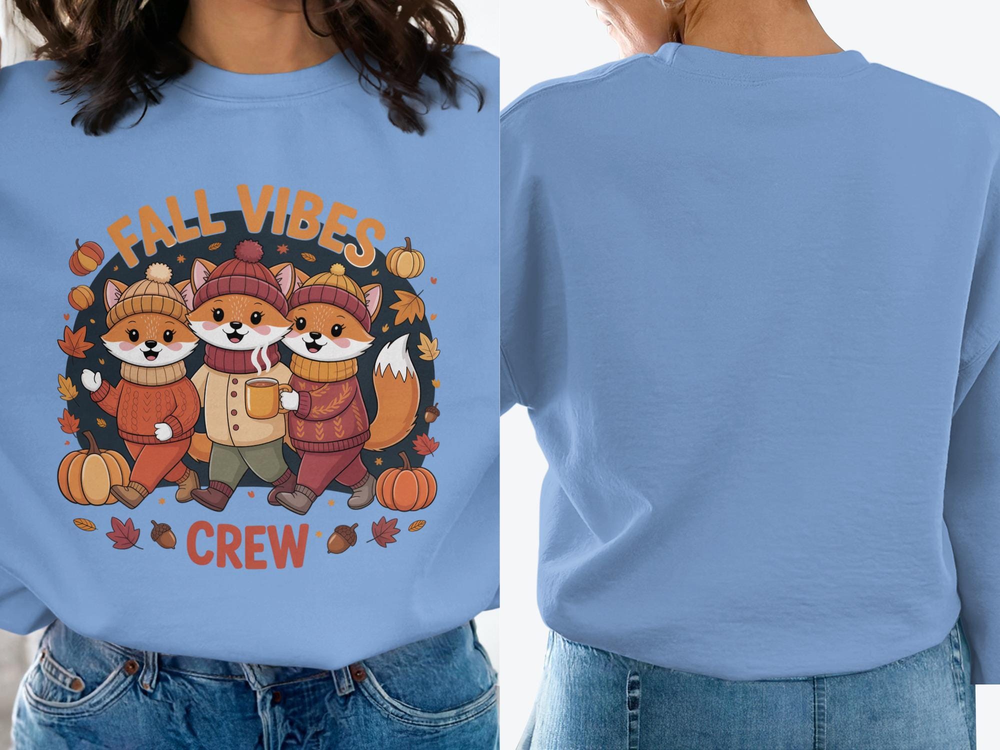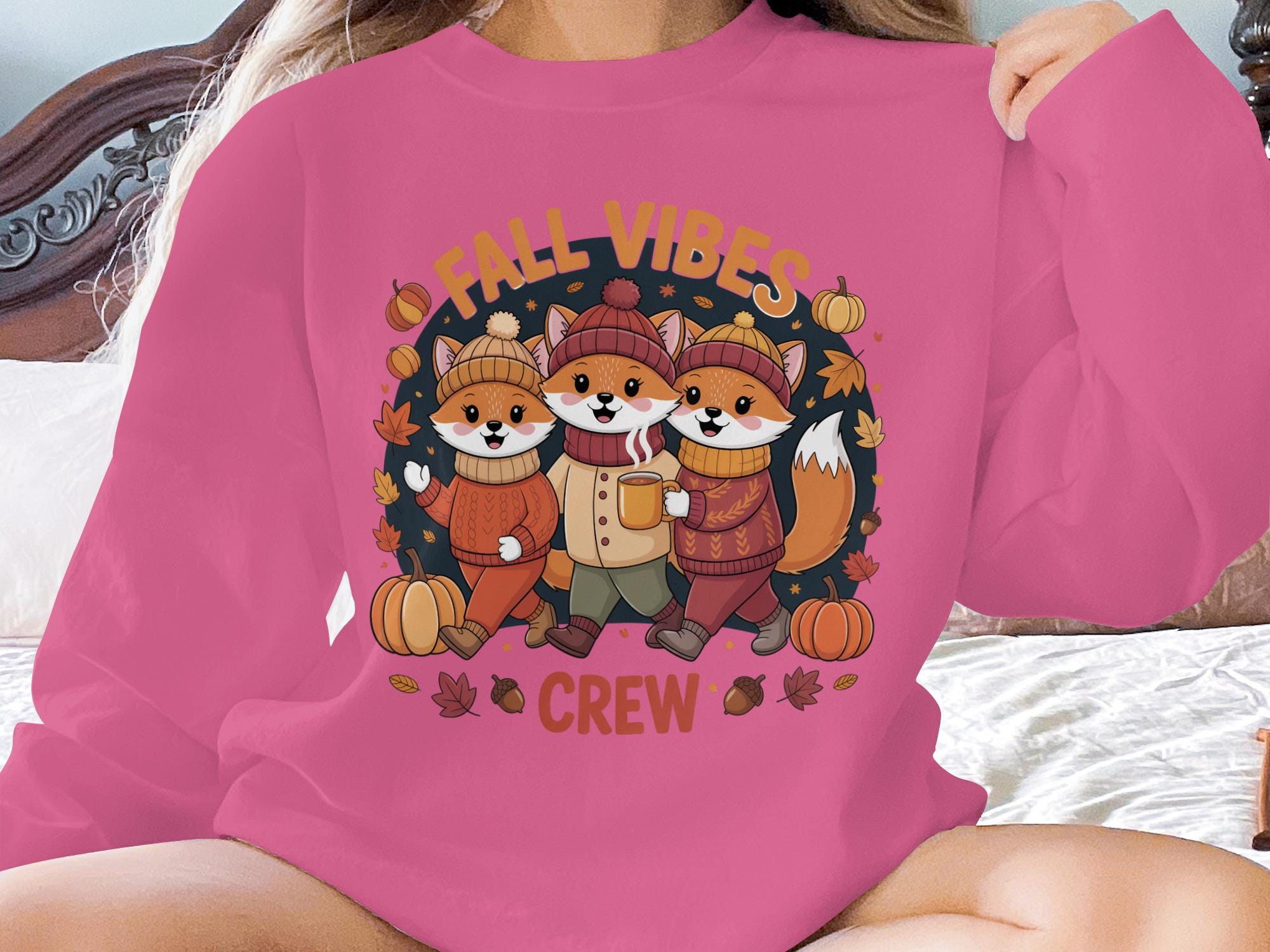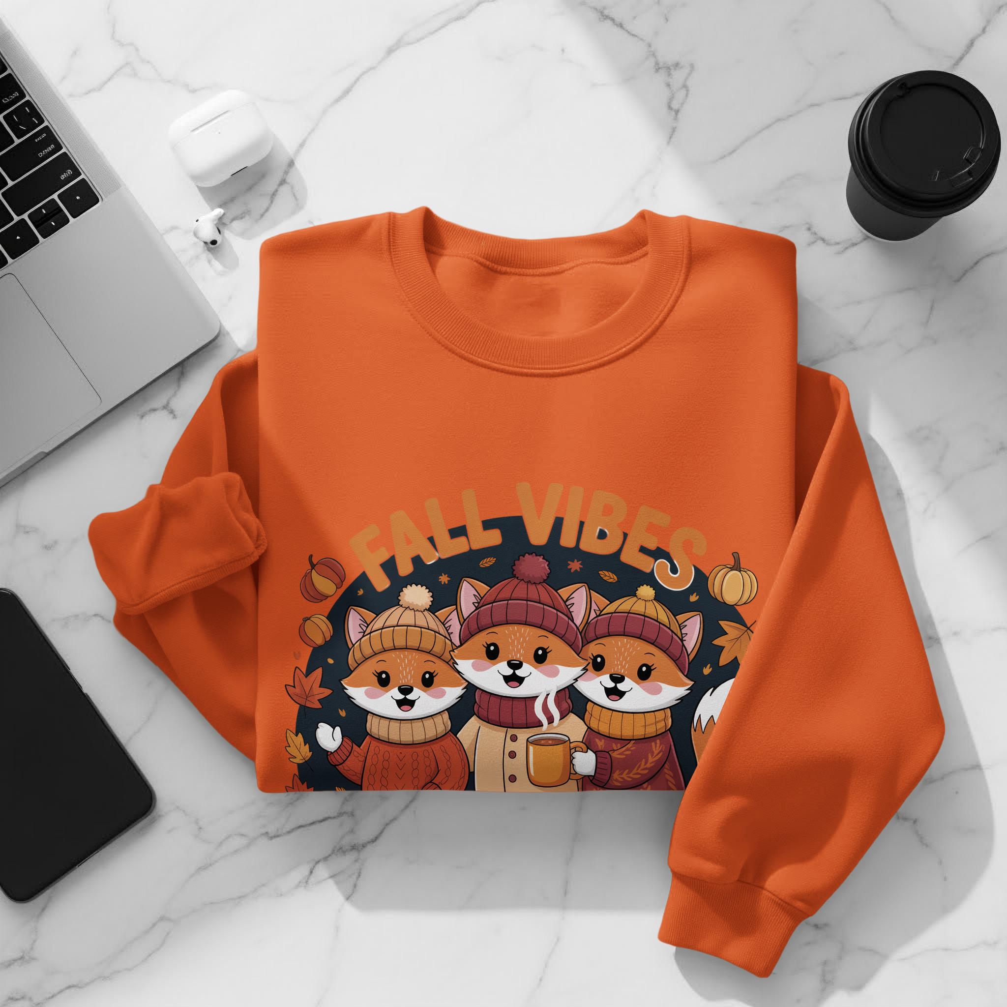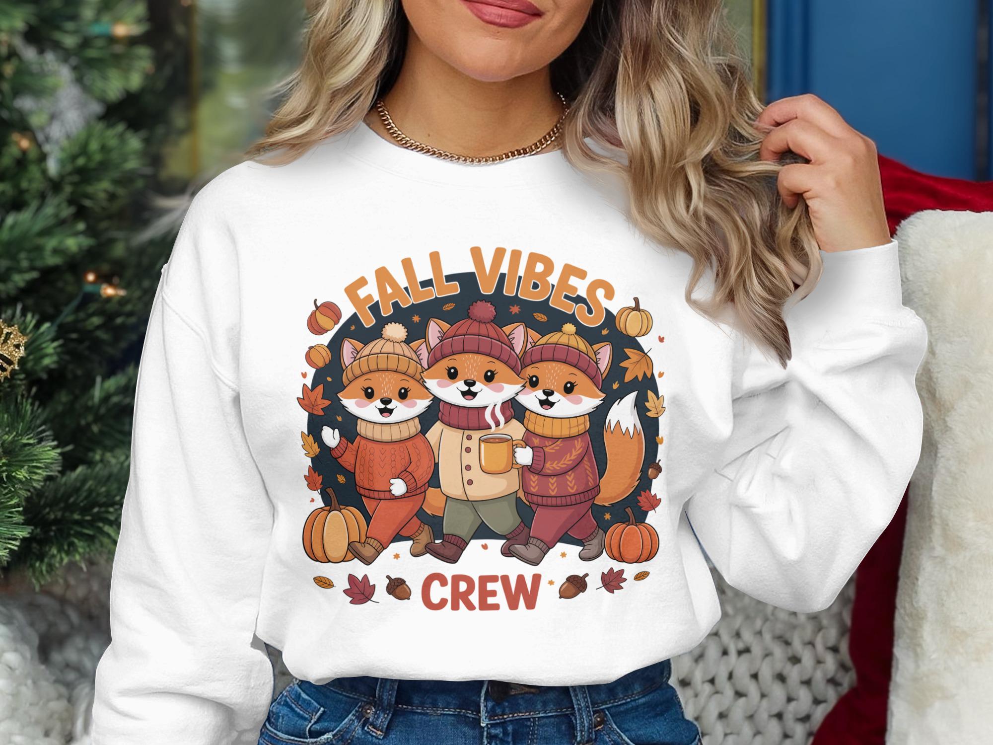 Embrace the autumn spirit with our Fall Vibes Crew Sweatshirt featuring adorable foxes, pumpkins, leaves, and acorns. Perfect for the cozy season, this hoodie will keep you warm and stylish. This image was made with the help of AI. Love it Guarantee: If you don't love the product, return it for a full refund.