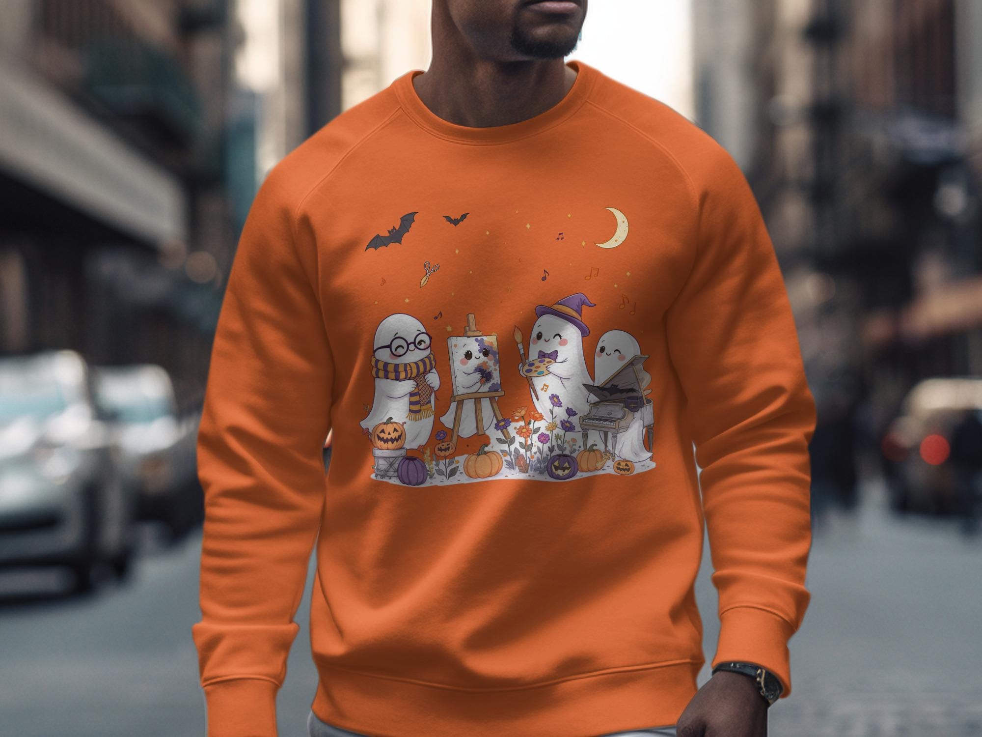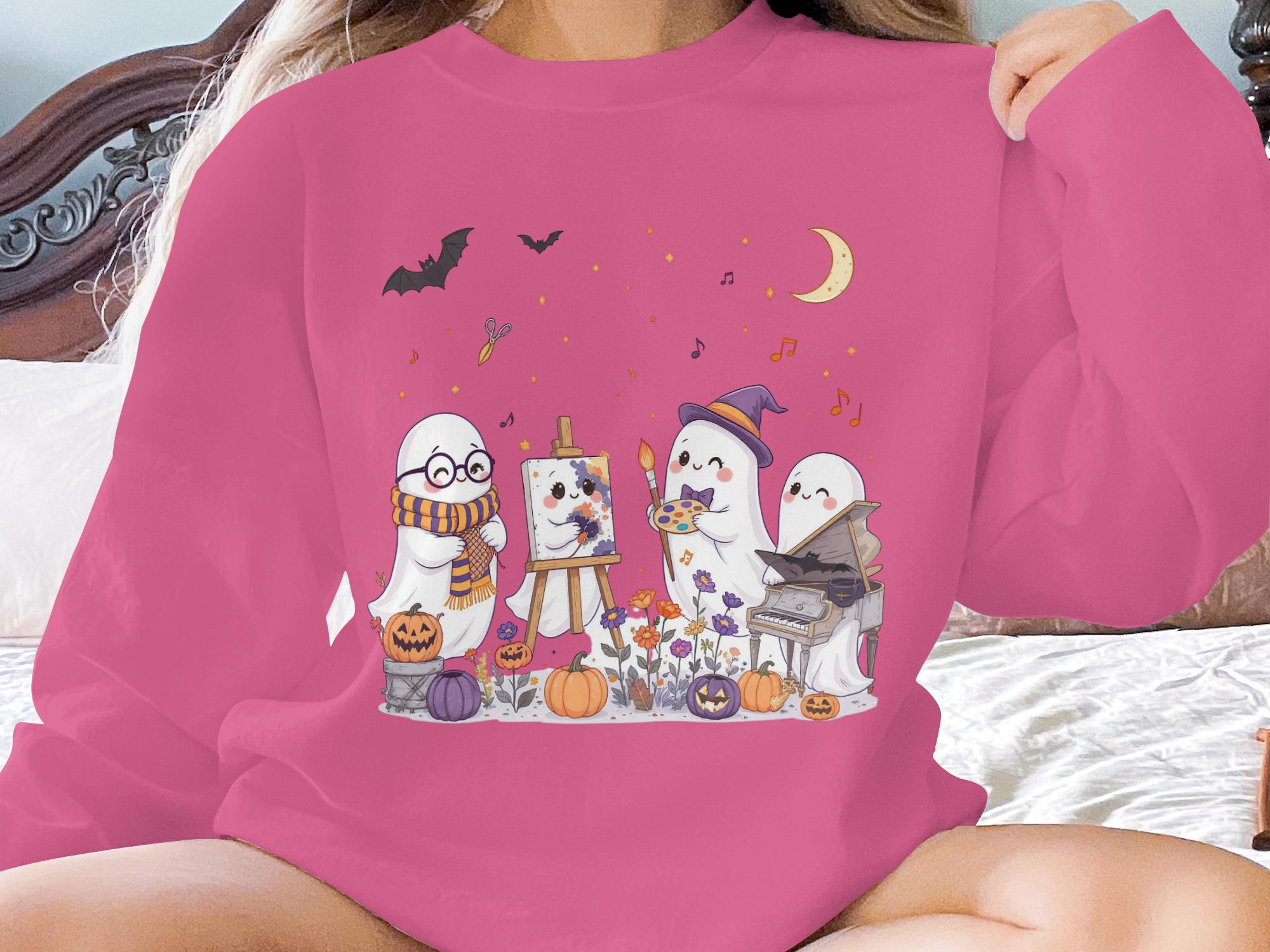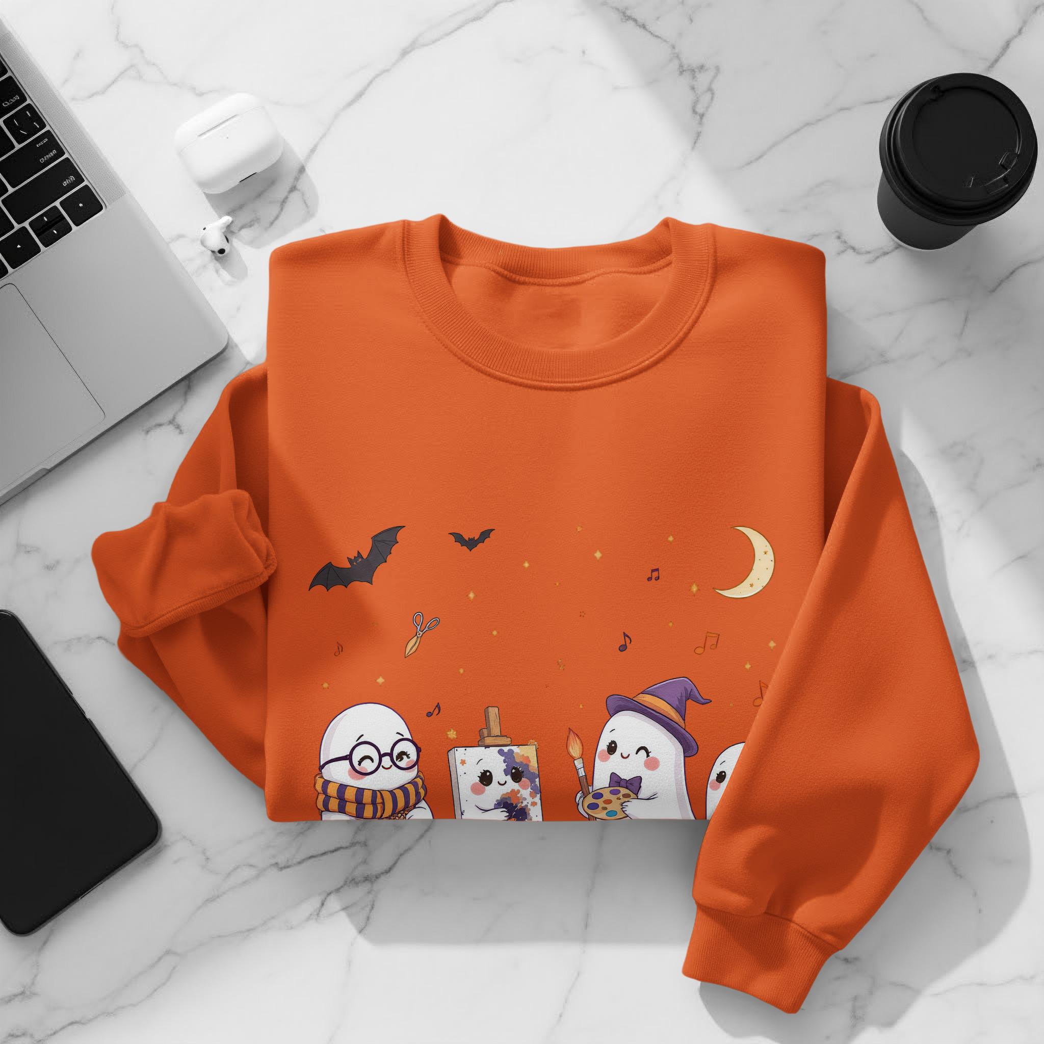 Cute Halloween Ghosts Sweatshirt, Ghosts Playing Halloween Music Painting Pumpkins, Whimsical Halloween Party Theme, Cozy Sweatshirt