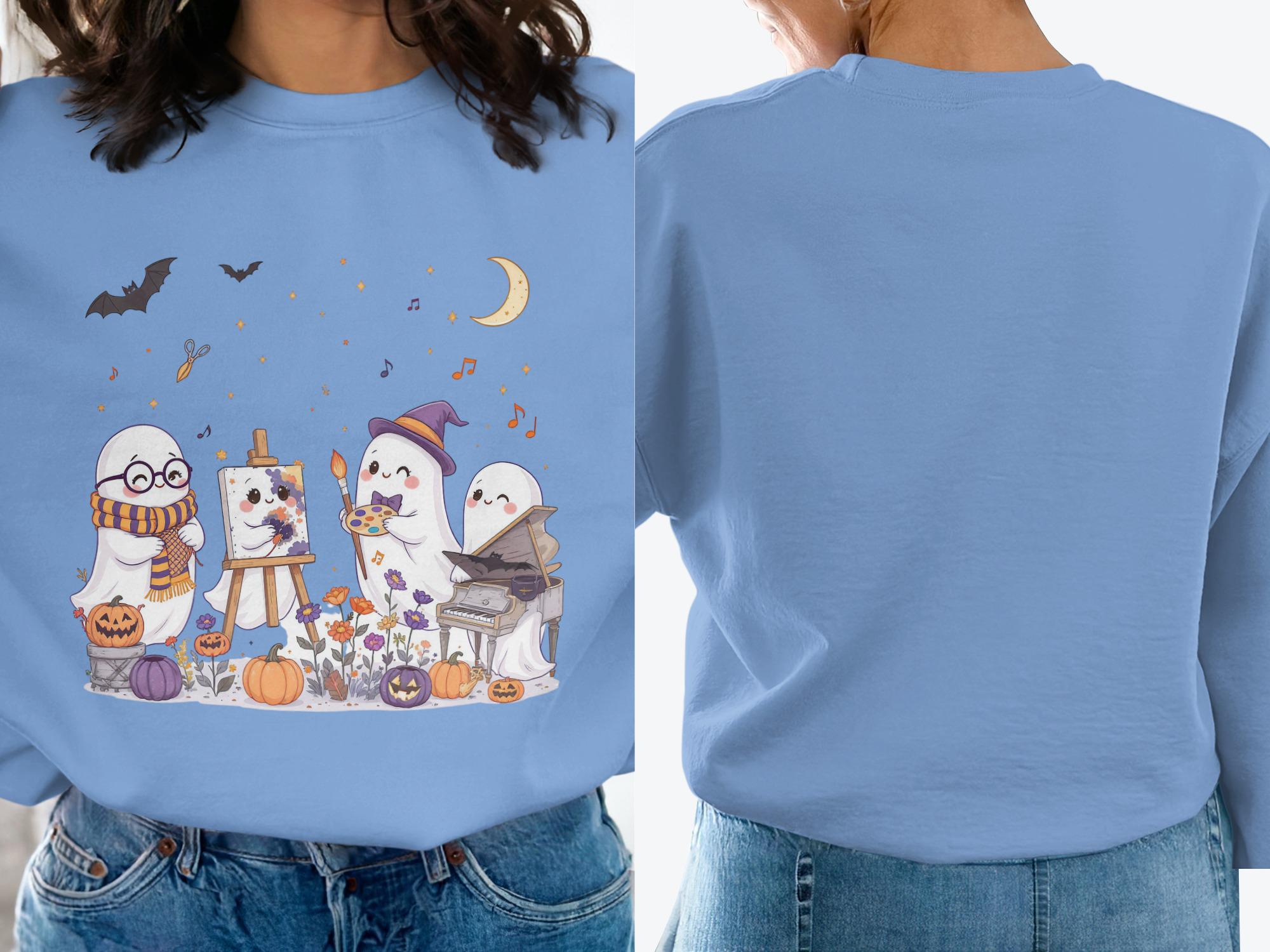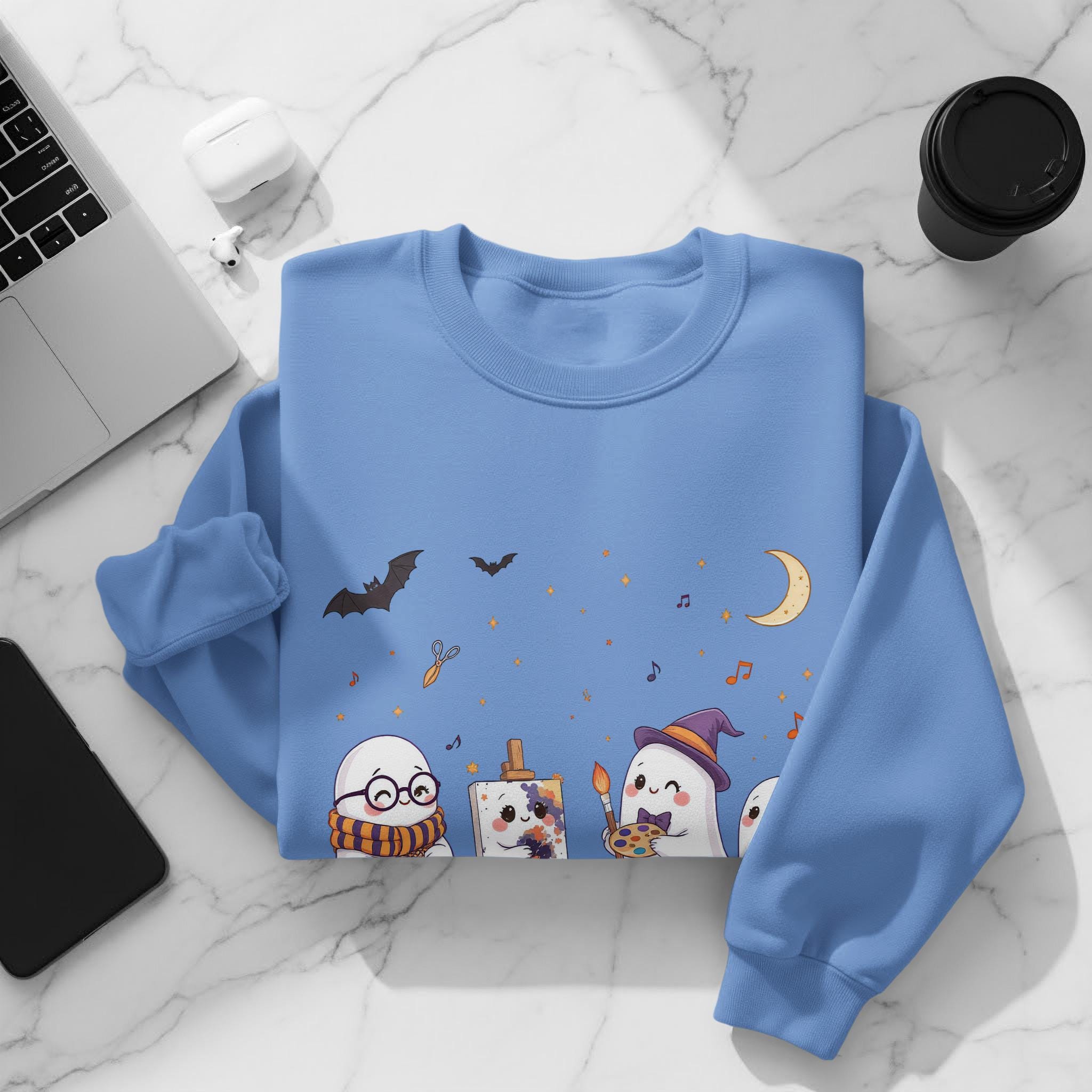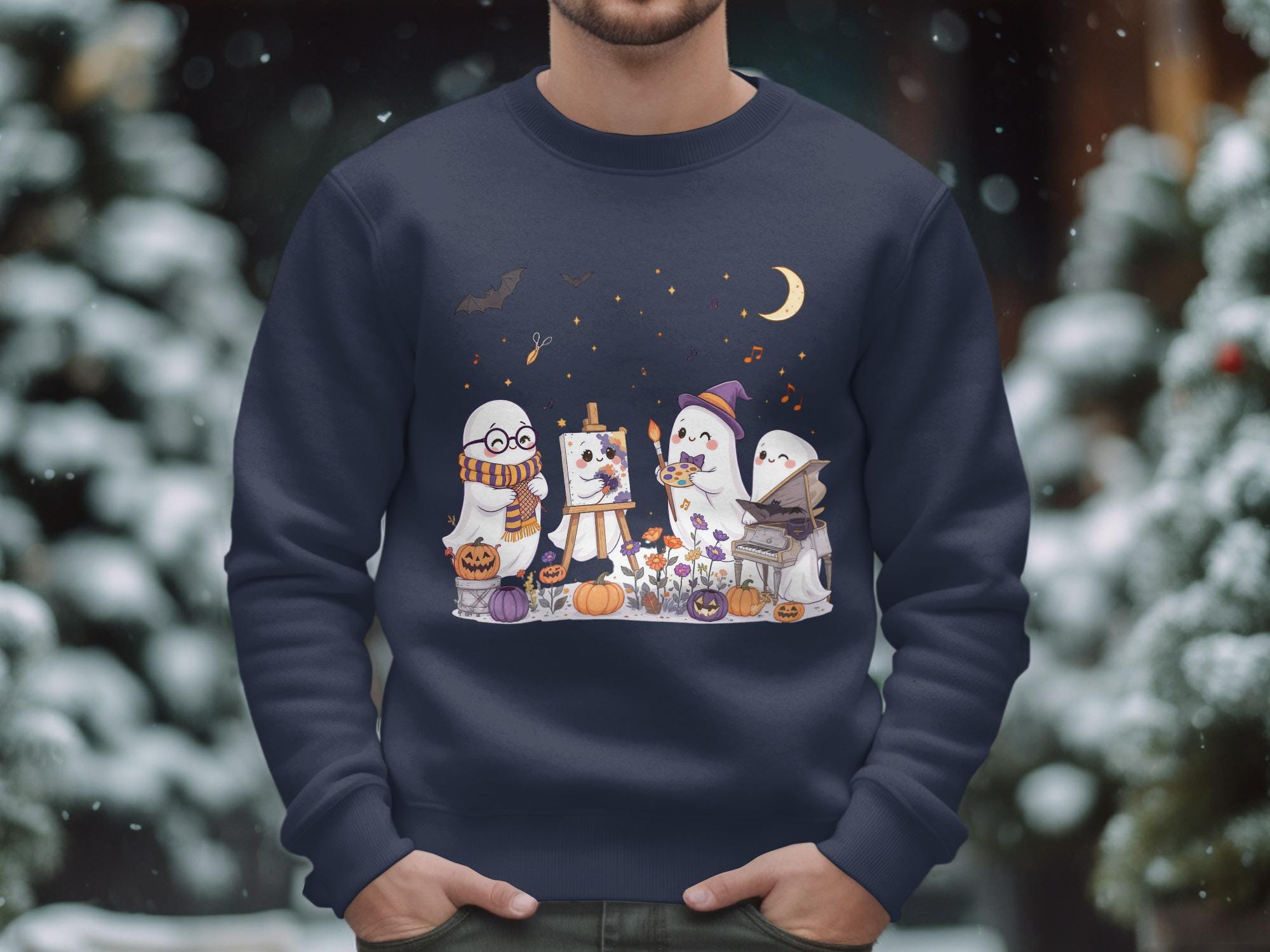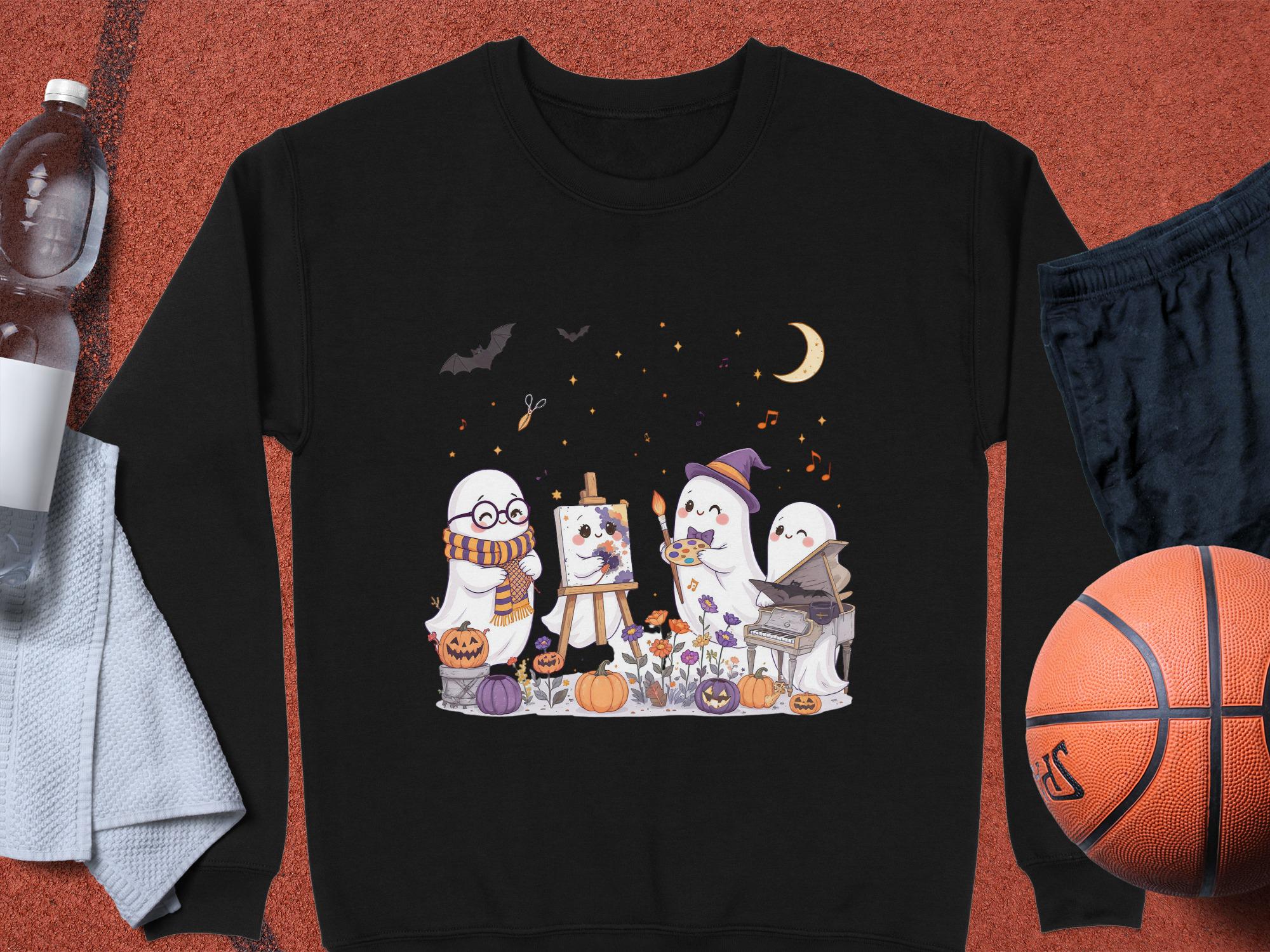 Cute Halloween Ghosts Sweatshirt, Ghosts Playing Halloween Music Painting Pumpkins, Whimsical Halloween Party Theme, Cozy Sweatshirt