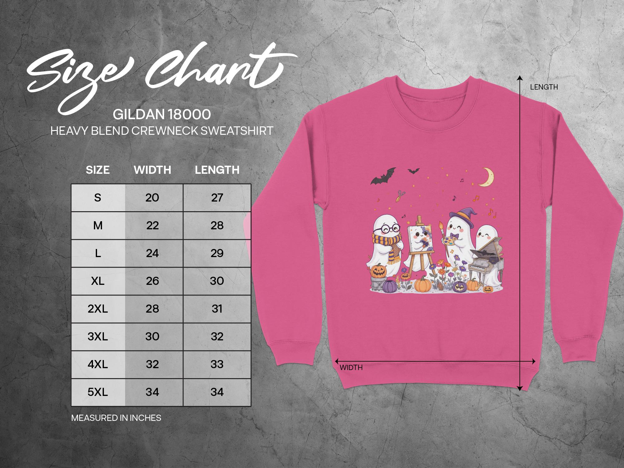 Celebrate Halloween with this adorable sweatshirt featuring cute ghosts playing music, painting pumpkins, and enjoying a whimsical Halloween party. Perfect for adding a touch of spooky fun to your wardrobe. This image was made with the help of AI. Love it Guarantee: If you don't love it, return it for a full refund.