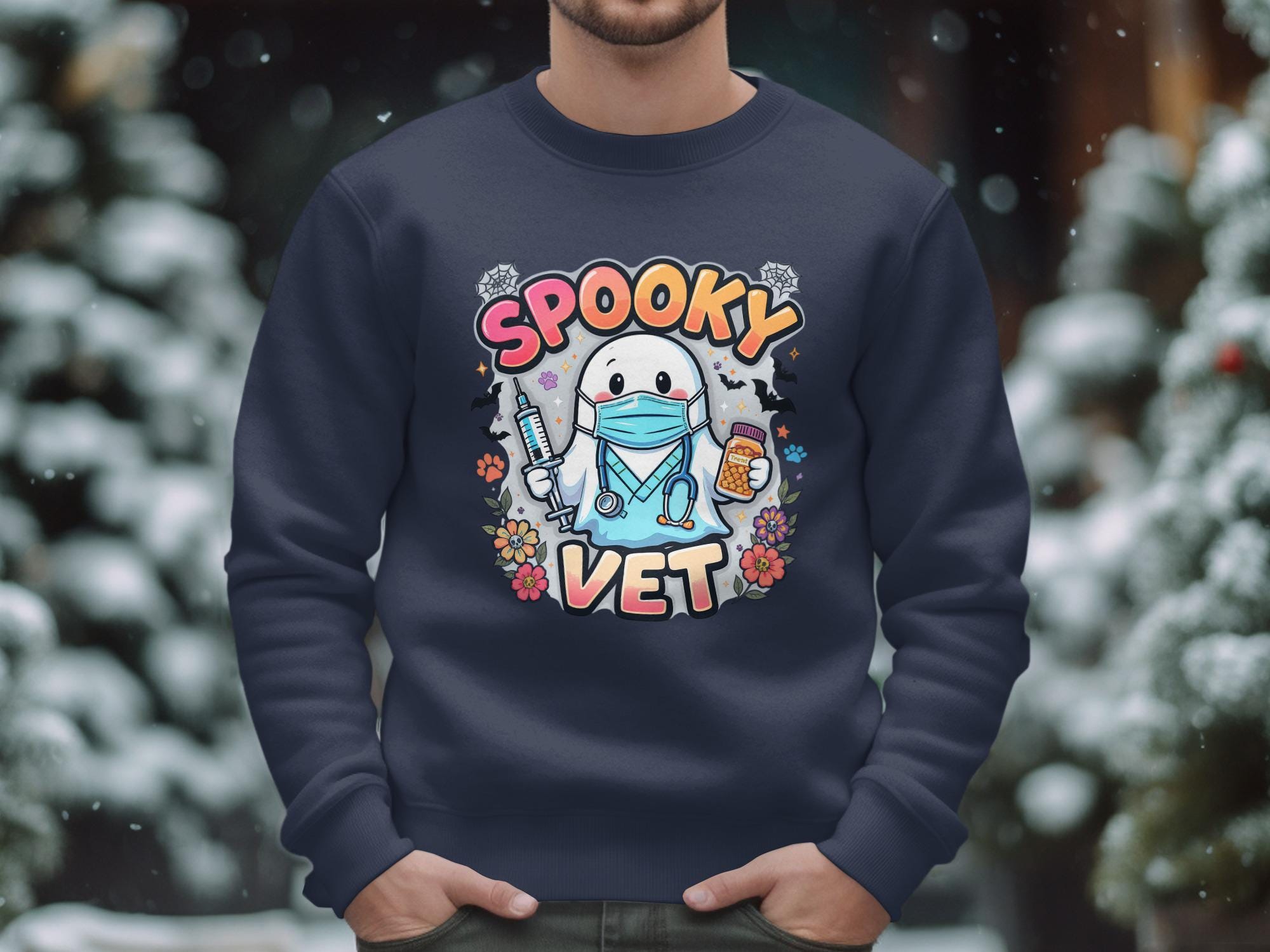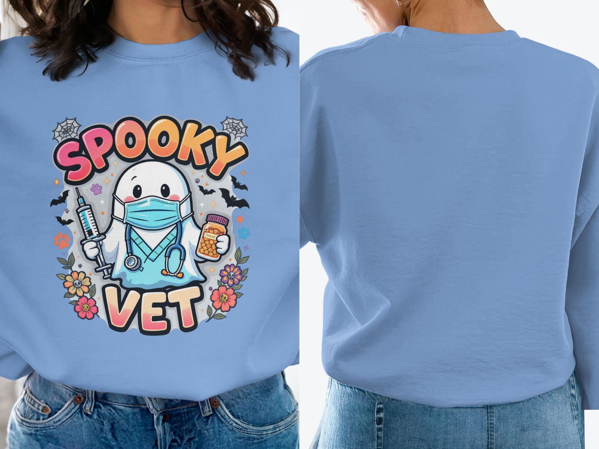 Embrace the spooky fun with our Spooky Vet Sweatshirt, featuring a cute ghost veterinarian surrounded by charming details. This image was made with the help of AI. Perfect for Halloween and beyond, this cozy sweatshirt is ideal for veterinarians or pet lovers. Love it Guarantee: If you don’t love it, return it for a full refund.