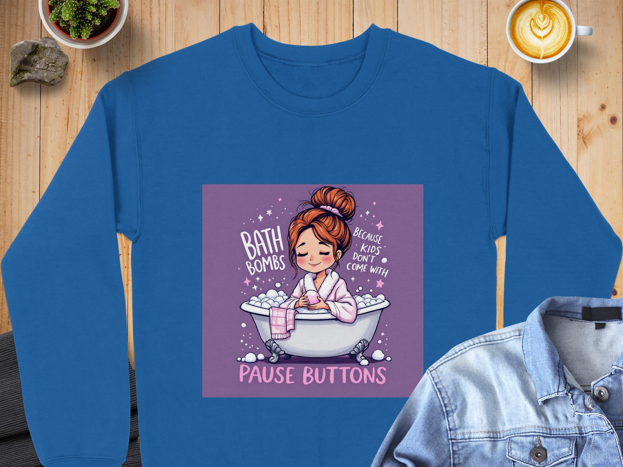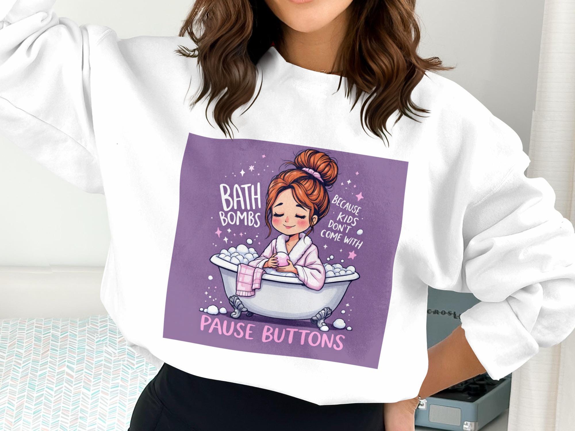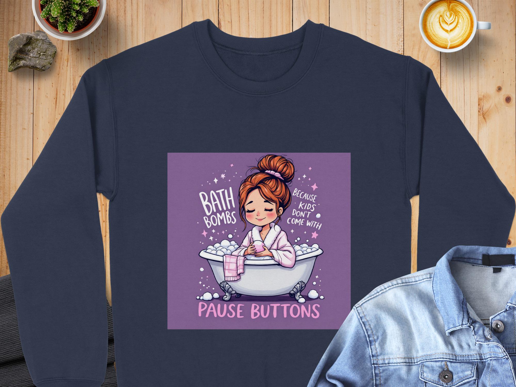 Funny Bath Bombs Sweatshirt, Gift for Moms, Bathing Time Humor, AI Created Design, Kids Pause Buttons, Cozy Relaxation Wear