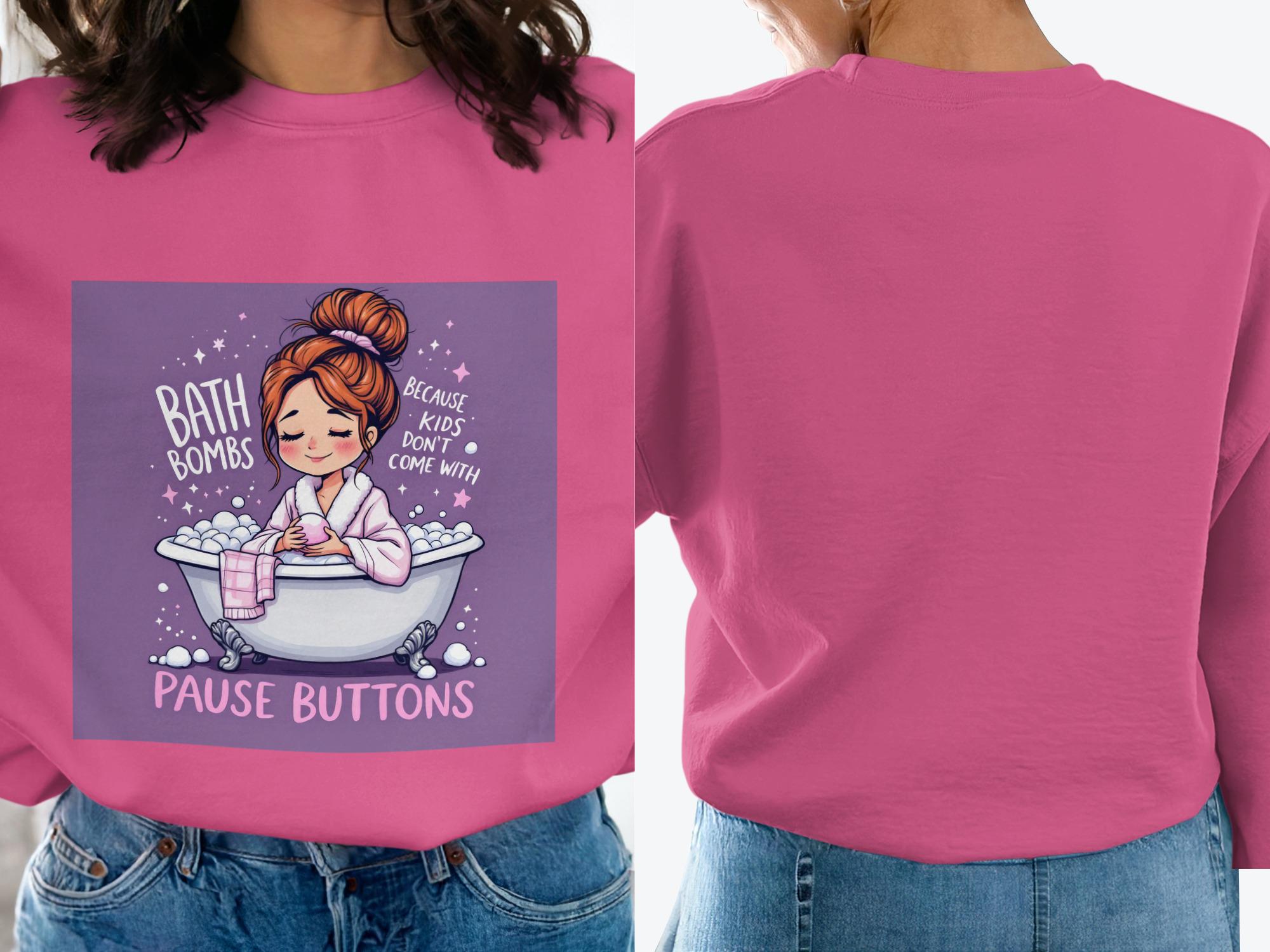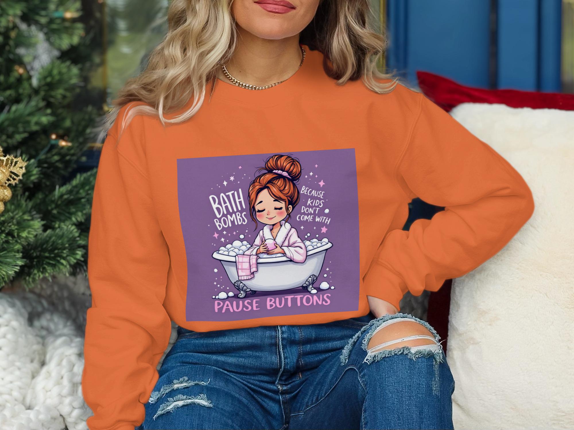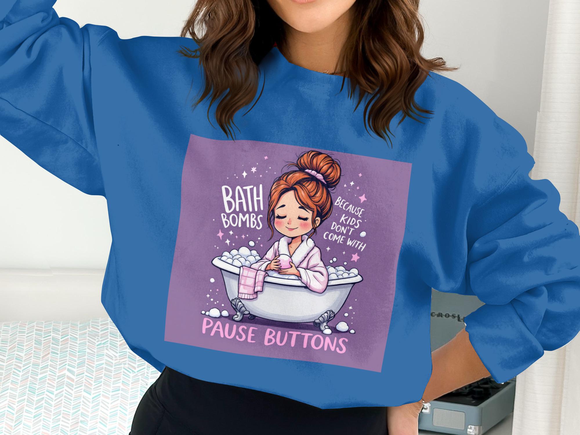 Funny Bath Bombs Sweatshirt, Gift for Moms, Bathing Time Humor, AI Created Design, Kids Pause Buttons, Cozy Relaxation Wear
