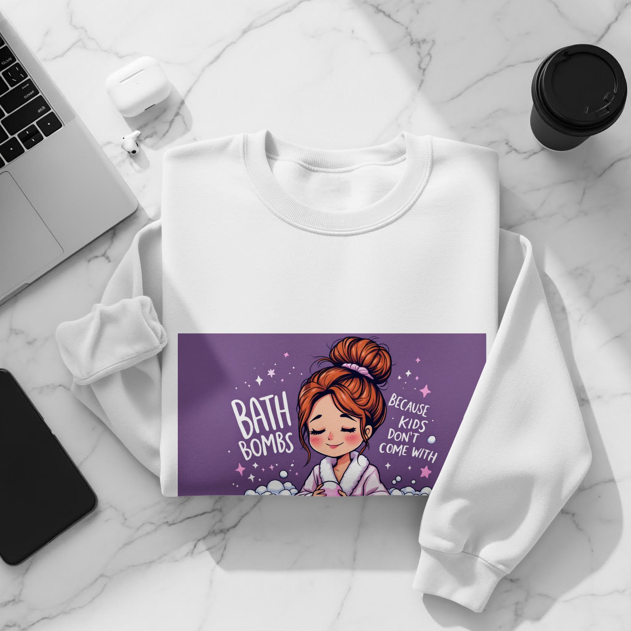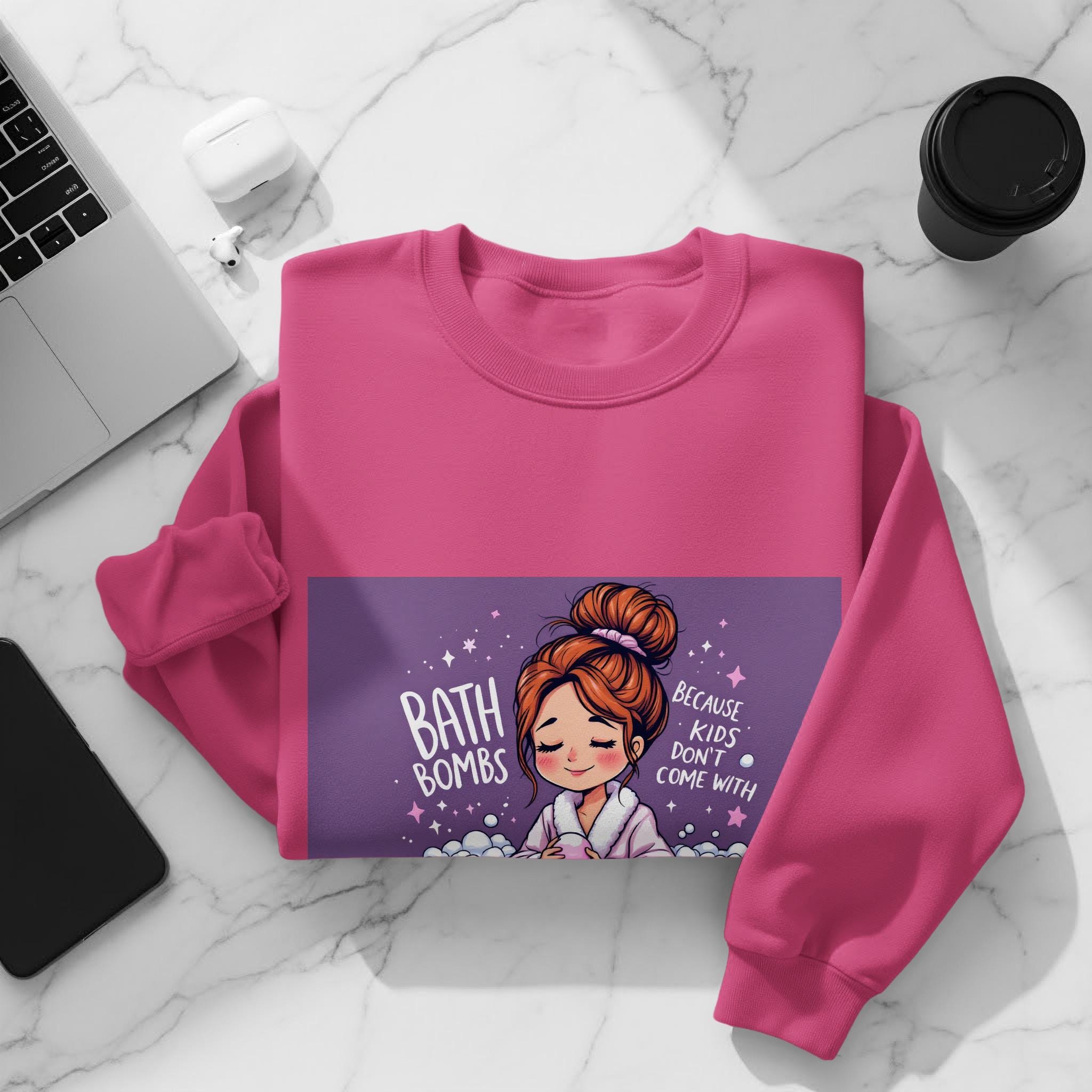 Discover our funny "Bath Bombs Because Kids Don't Come with Pause Buttons" sweatshirt, perfect for relaxing parents. This cozy sweatshirt features an AI-created design, combining humor and warmth. Ideal as a gift for moms who need a break. Love it Guarantee: If you don't love it, return it for a full refund.