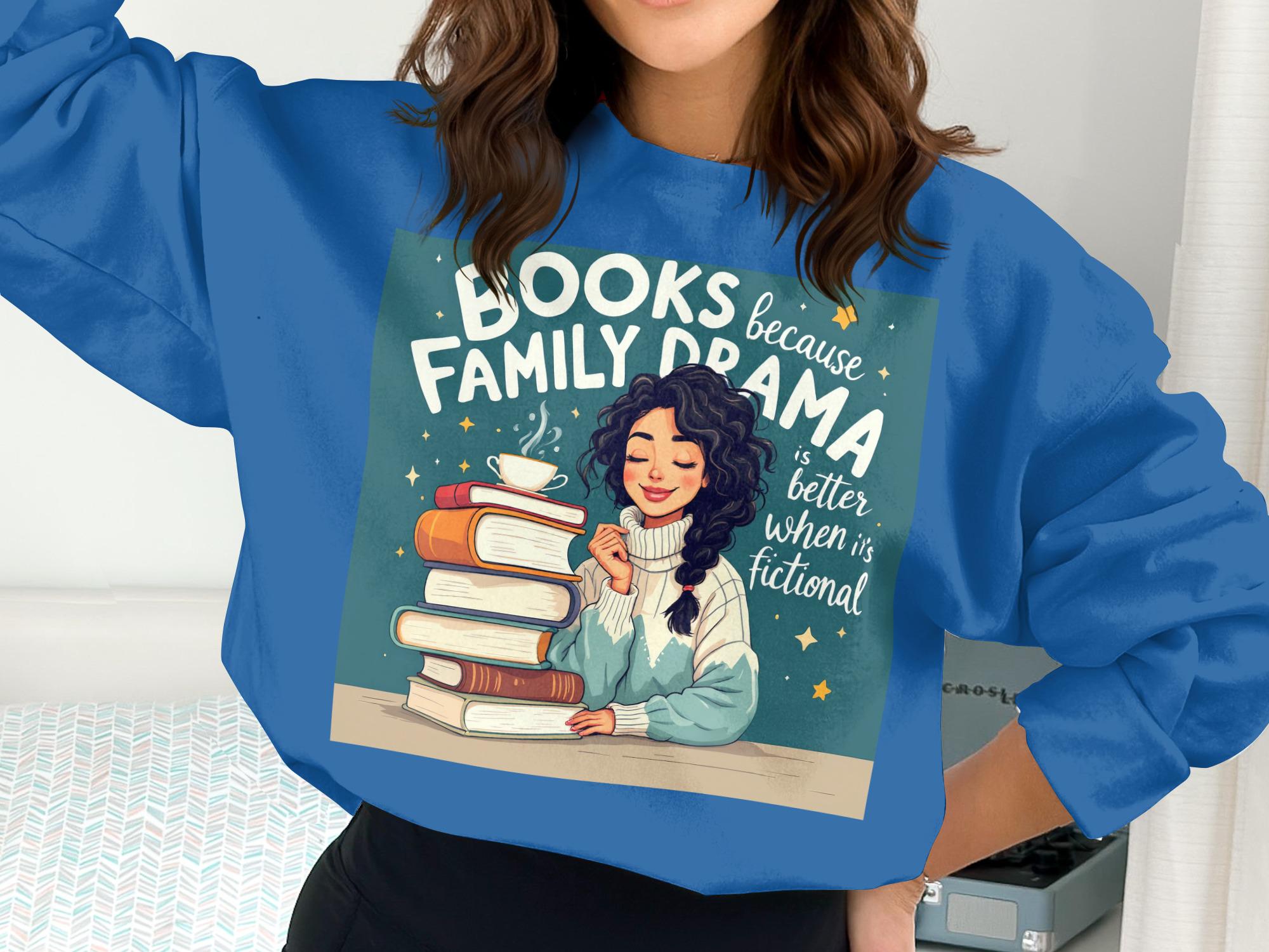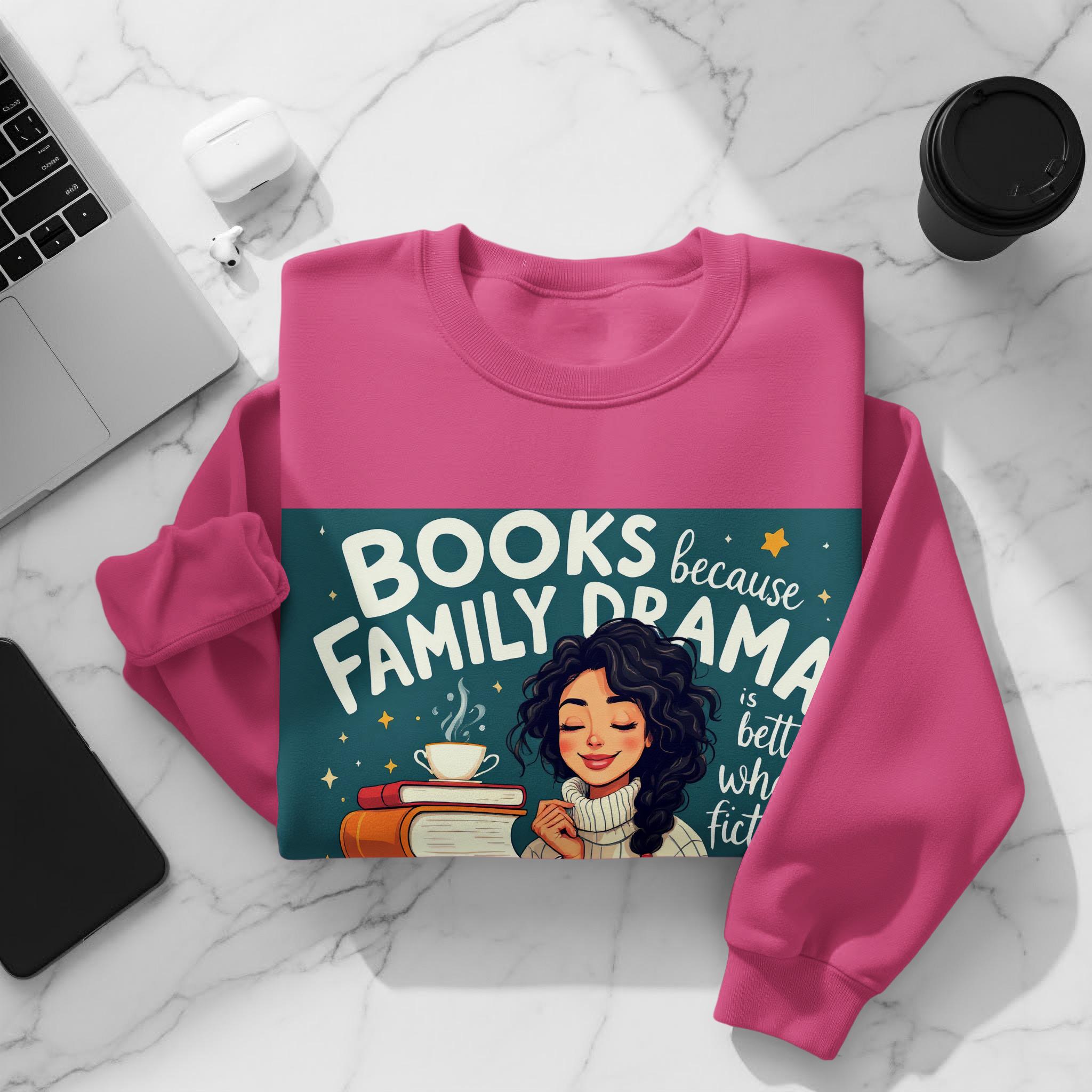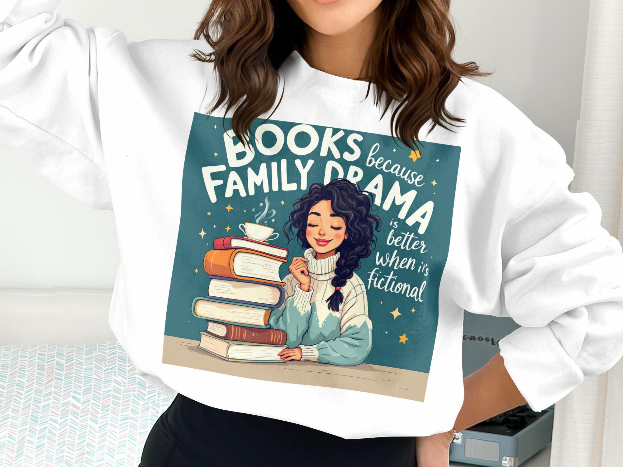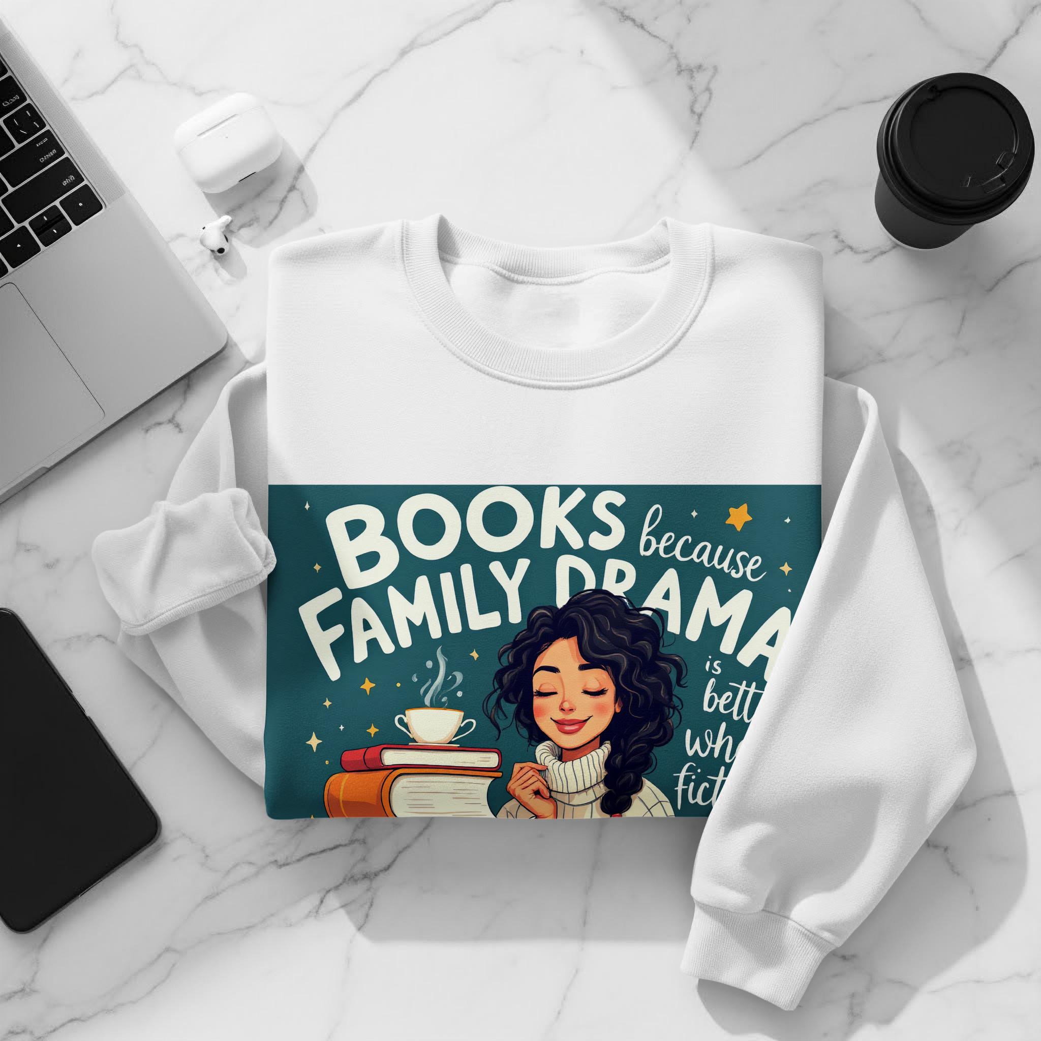 Embrace your love for books with this cozy sweatshirt featuring the phrase "Books Because Family Drama is Better When It's Fictional." This AI-created design makes a perfect gift for book lovers and avid readers. The Love it Guarantee ensures if you do not love the product, you can return it for a full refund.