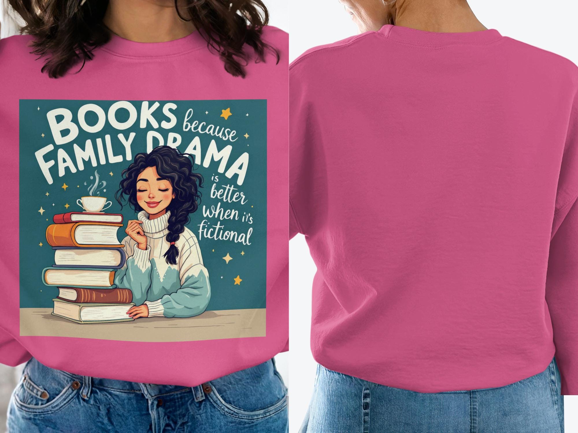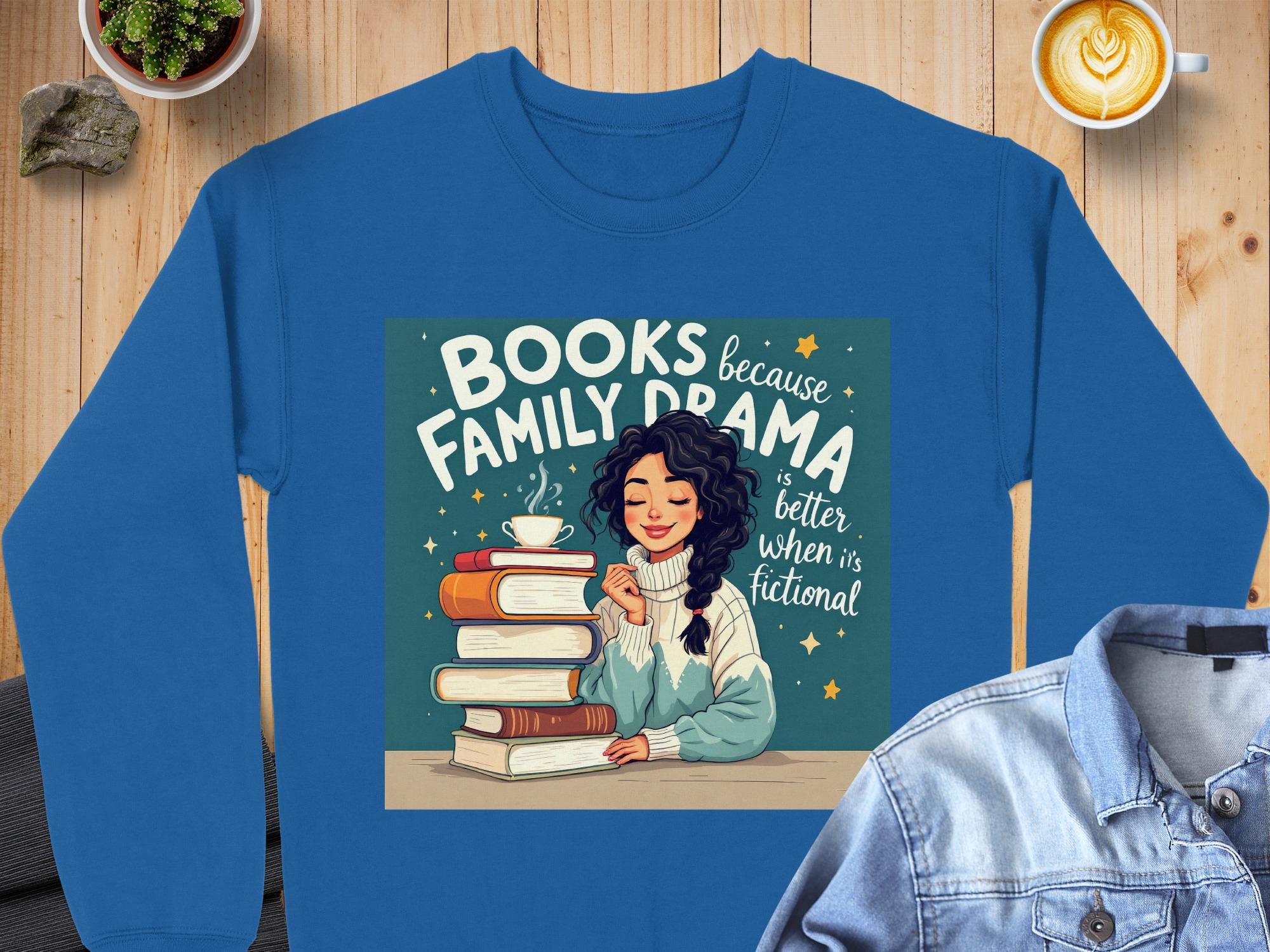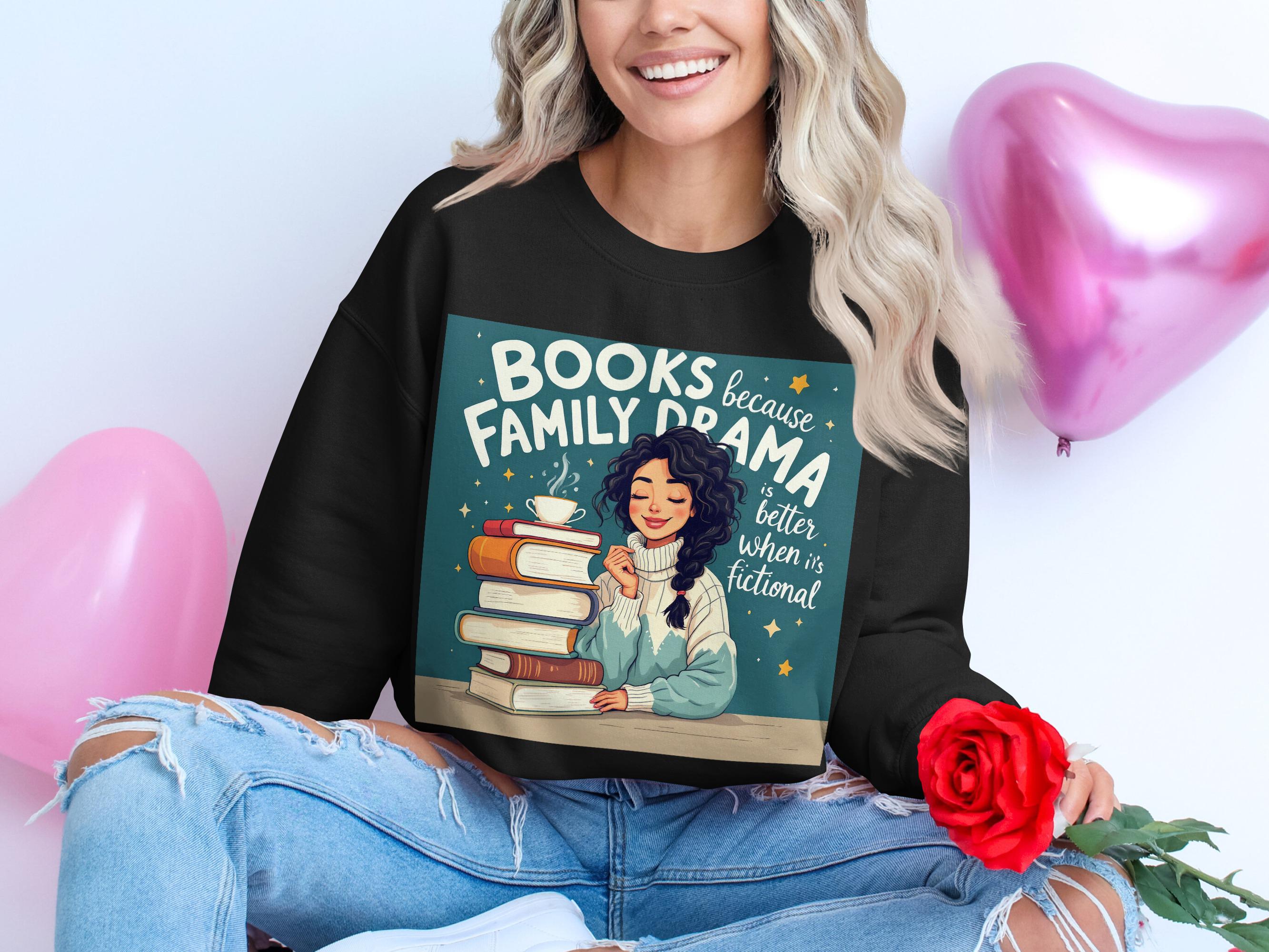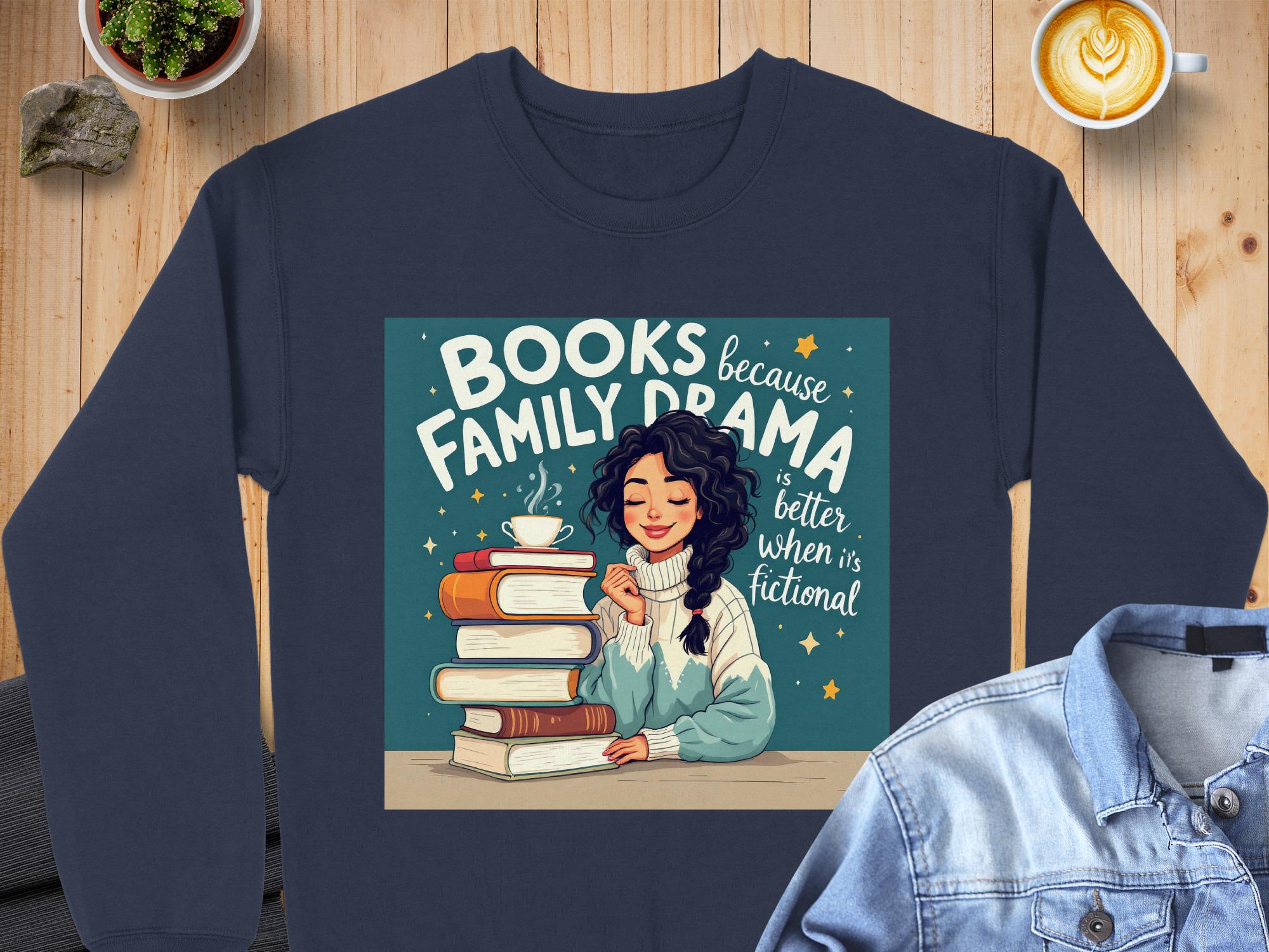 Embrace your love for books with this cozy sweatshirt featuring the phrase "Books Because Family Drama is Better When It's Fictional." This AI-created design makes a perfect gift for book lovers and avid readers. The Love it Guarantee ensures if you do not love the product, you can return it for a full refund.