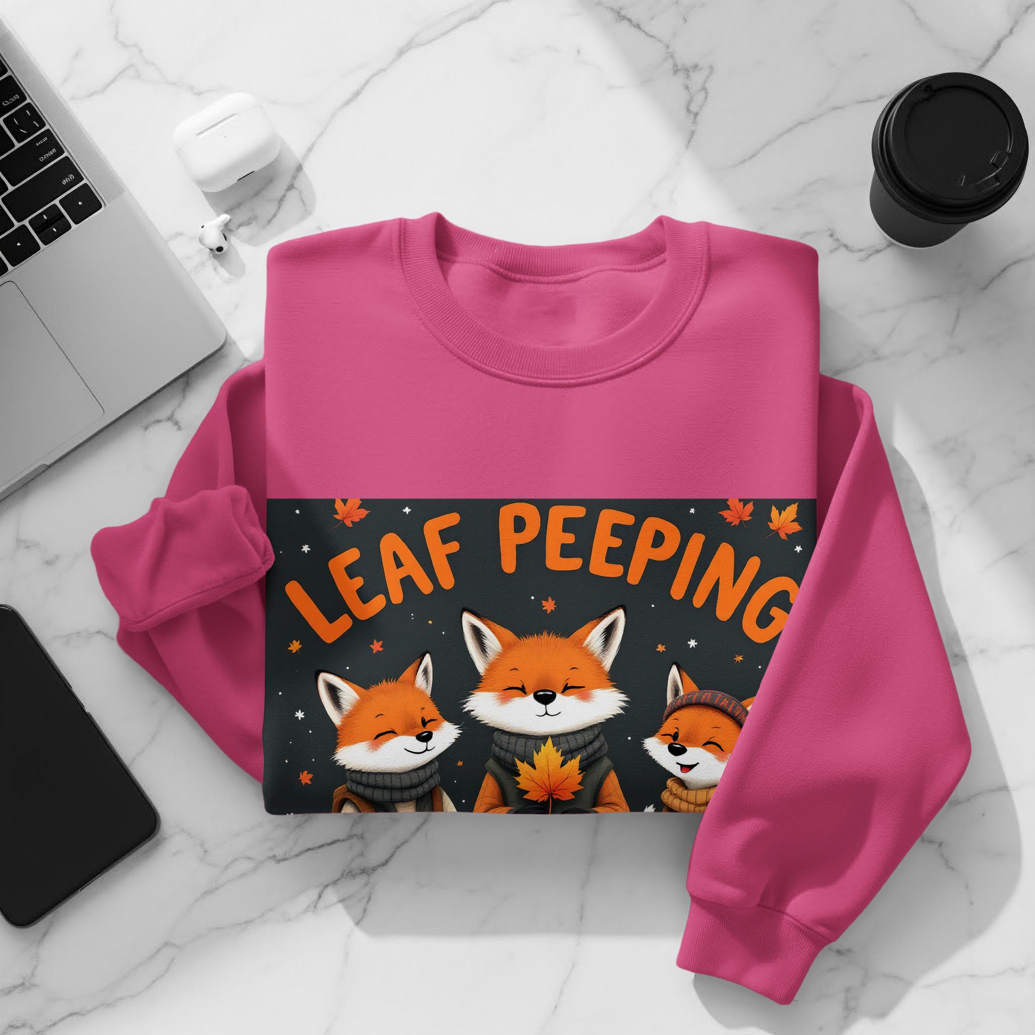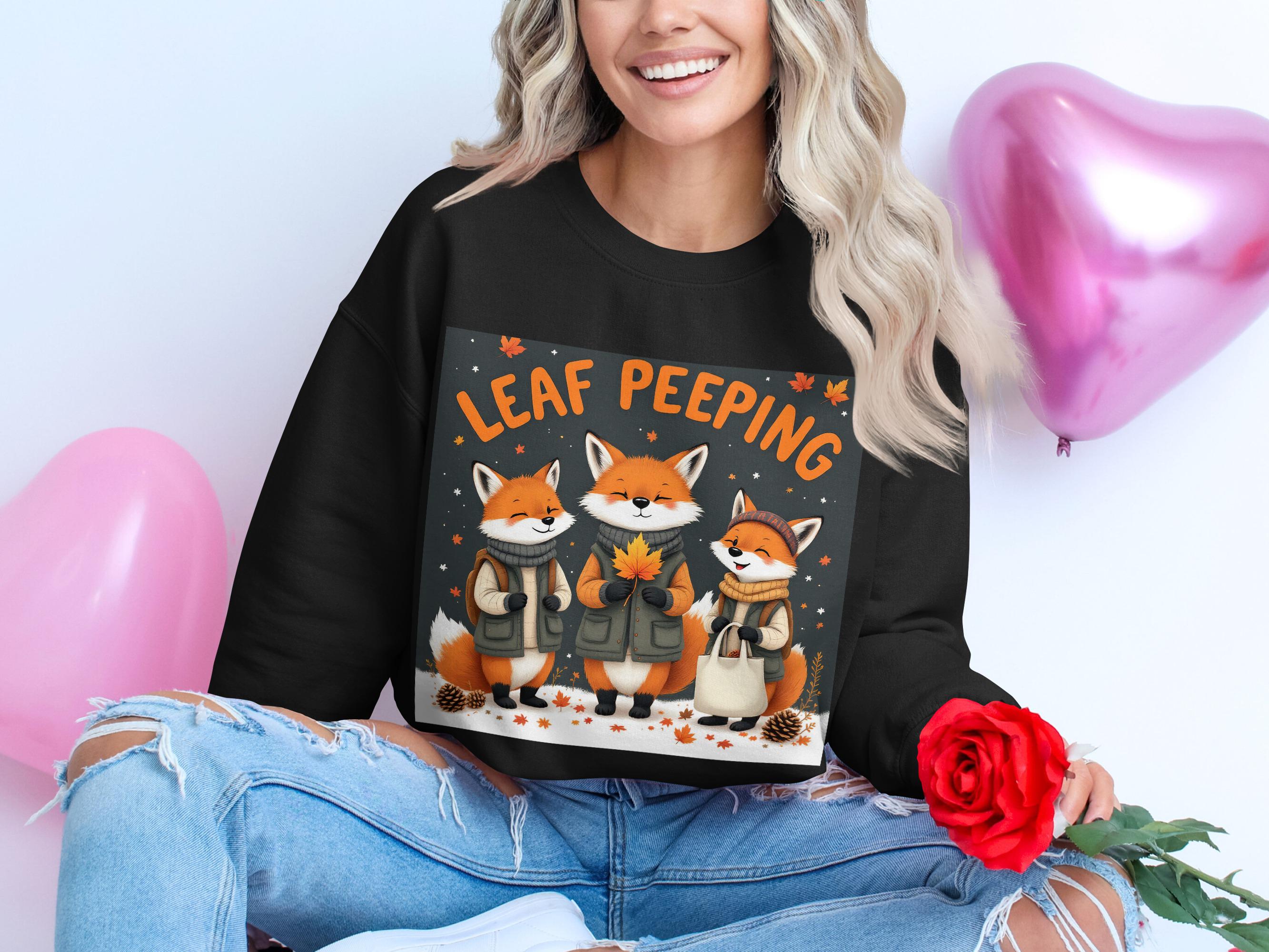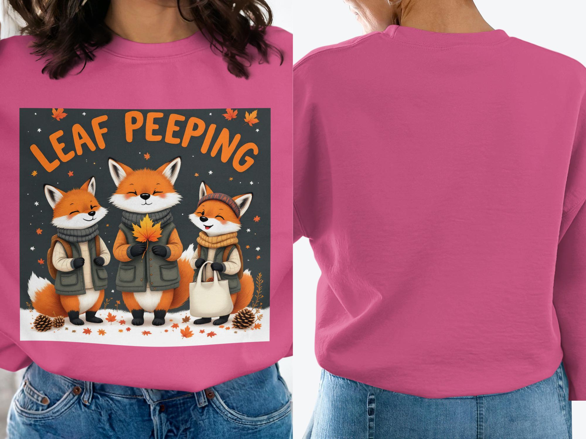 Embrace the fall season with our Leaf Peeping Fox Sweatshirt, featuring a cute fox family enjoying autumn leaves. This cozy outfit is perfect for fall adventures or just lounging at home. Designed with the help of AI, the charming woodland animals and vibrant colors make it a unique addition to your wardrobe. Love it Guarantee: If you don't love this product, you can return it for a full refund.