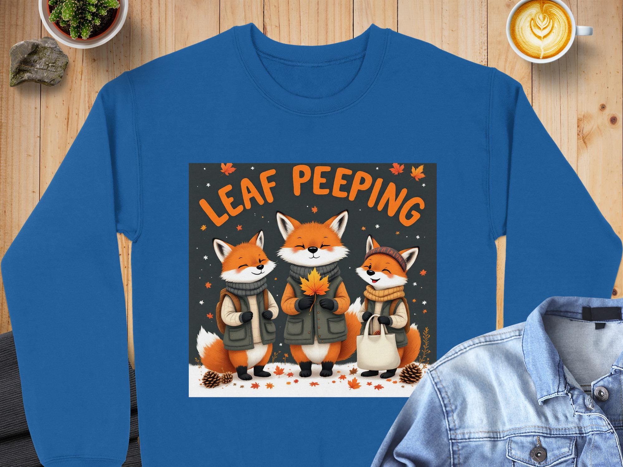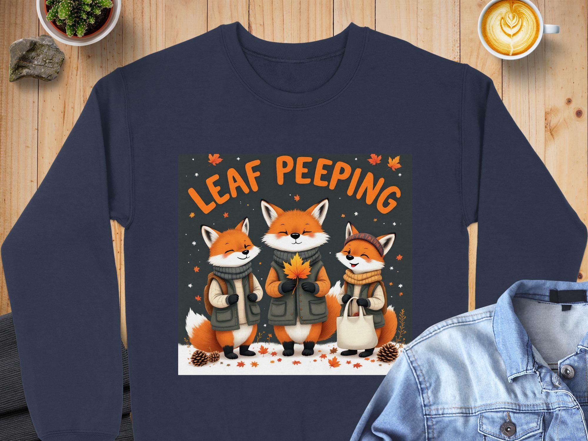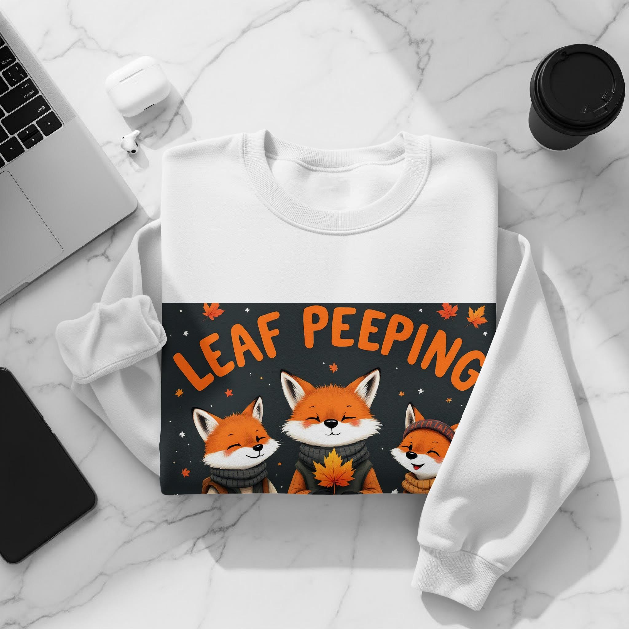 Embrace the fall season with our Leaf Peeping Fox Sweatshirt, featuring a cute fox family enjoying autumn leaves. This cozy outfit is perfect for fall adventures or just lounging at home. Designed with the help of AI, the charming woodland animals and vibrant colors make it a unique addition to your wardrobe. Love it Guarantee: If you don't love this product, you can return it for a full refund.