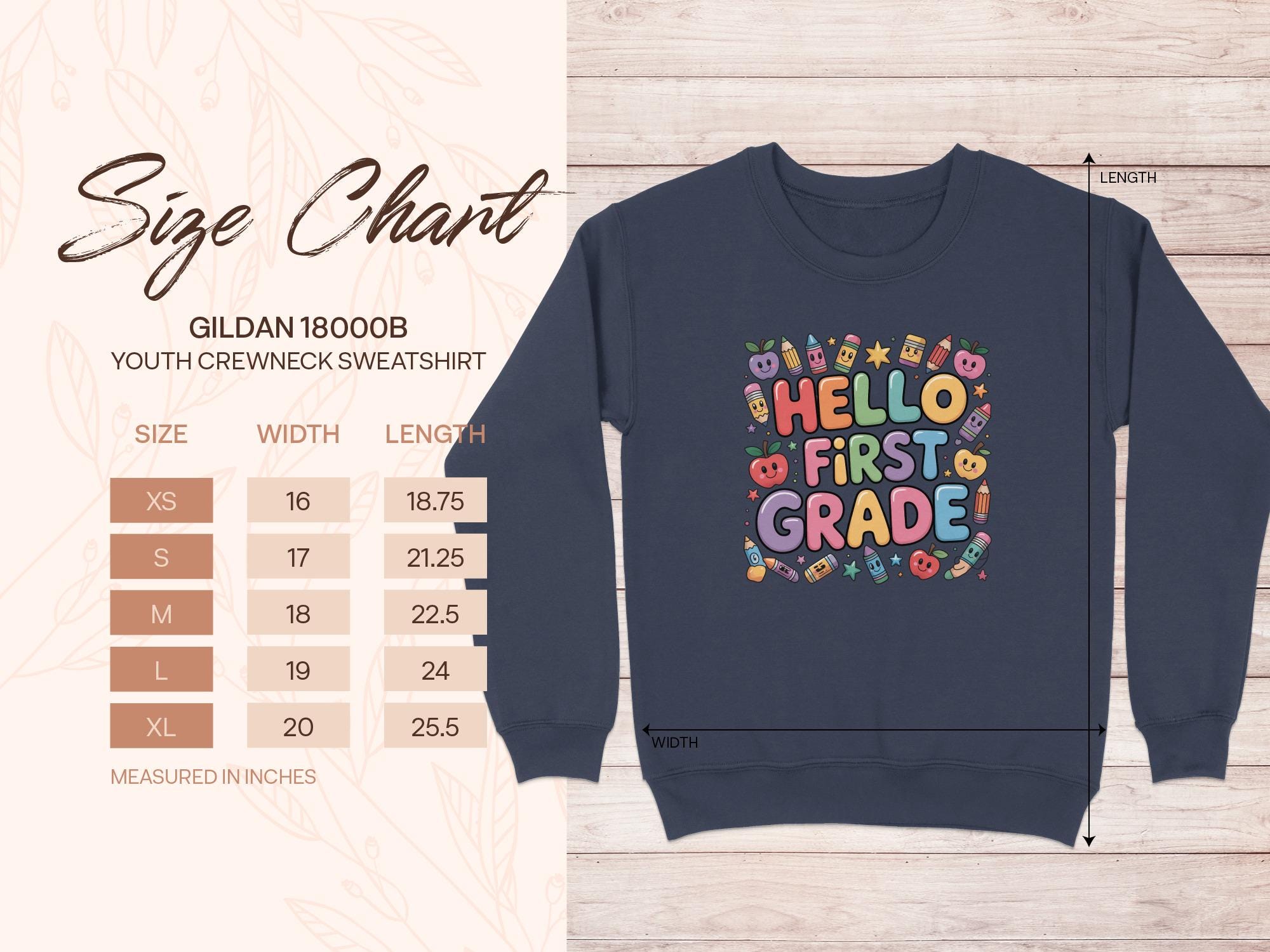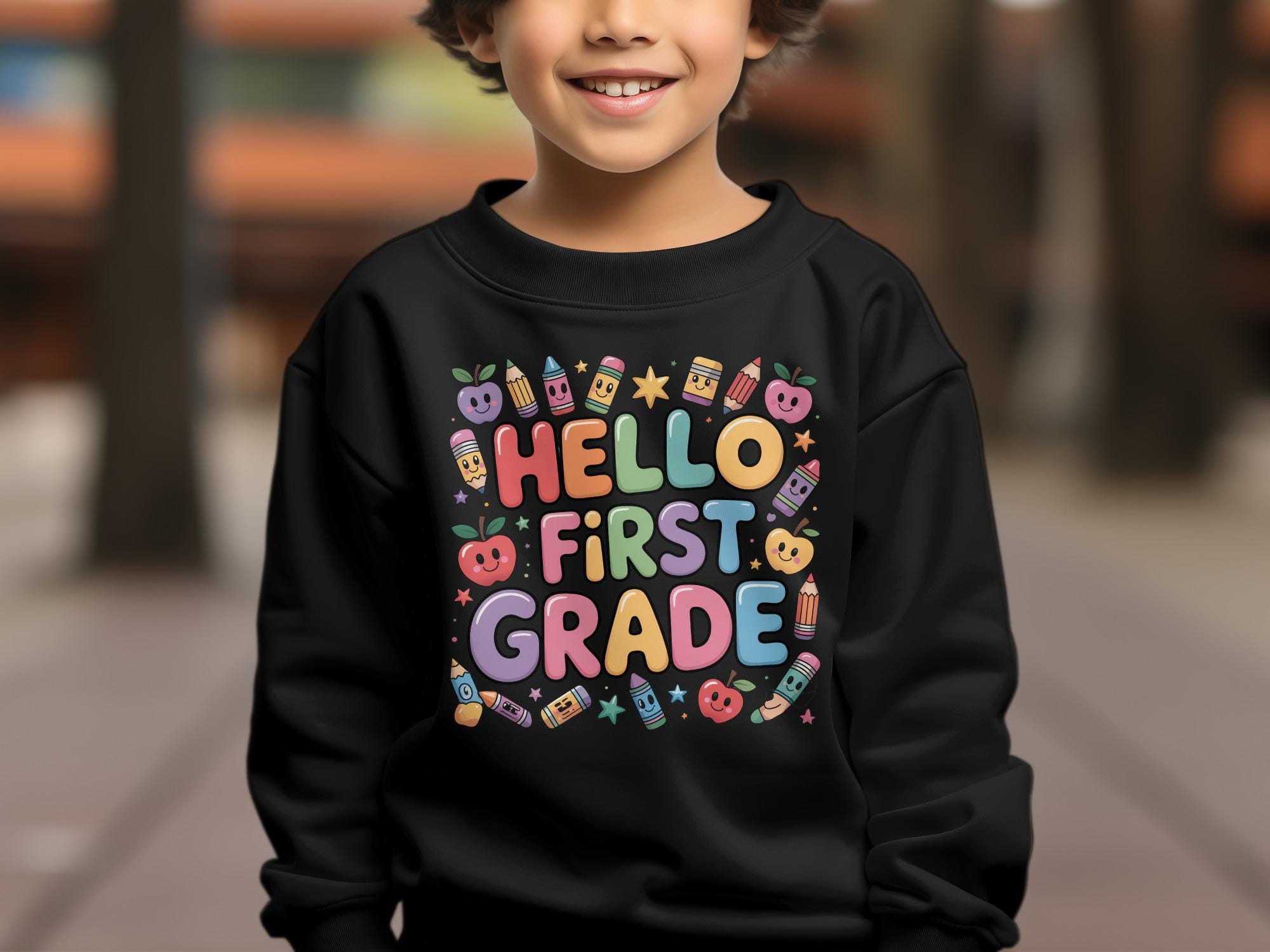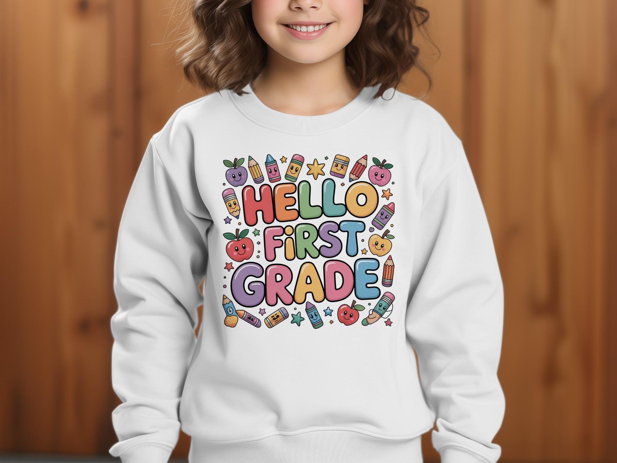 Our "Hello First Grade" sweatshirt features a fun and colorful school-themed design perfect for back to school. It makes an ideal gift for first graders. This design was assisted by AI. We offer our Love it Guarantee - if you don't love your purchase, you can return it for a full refund.