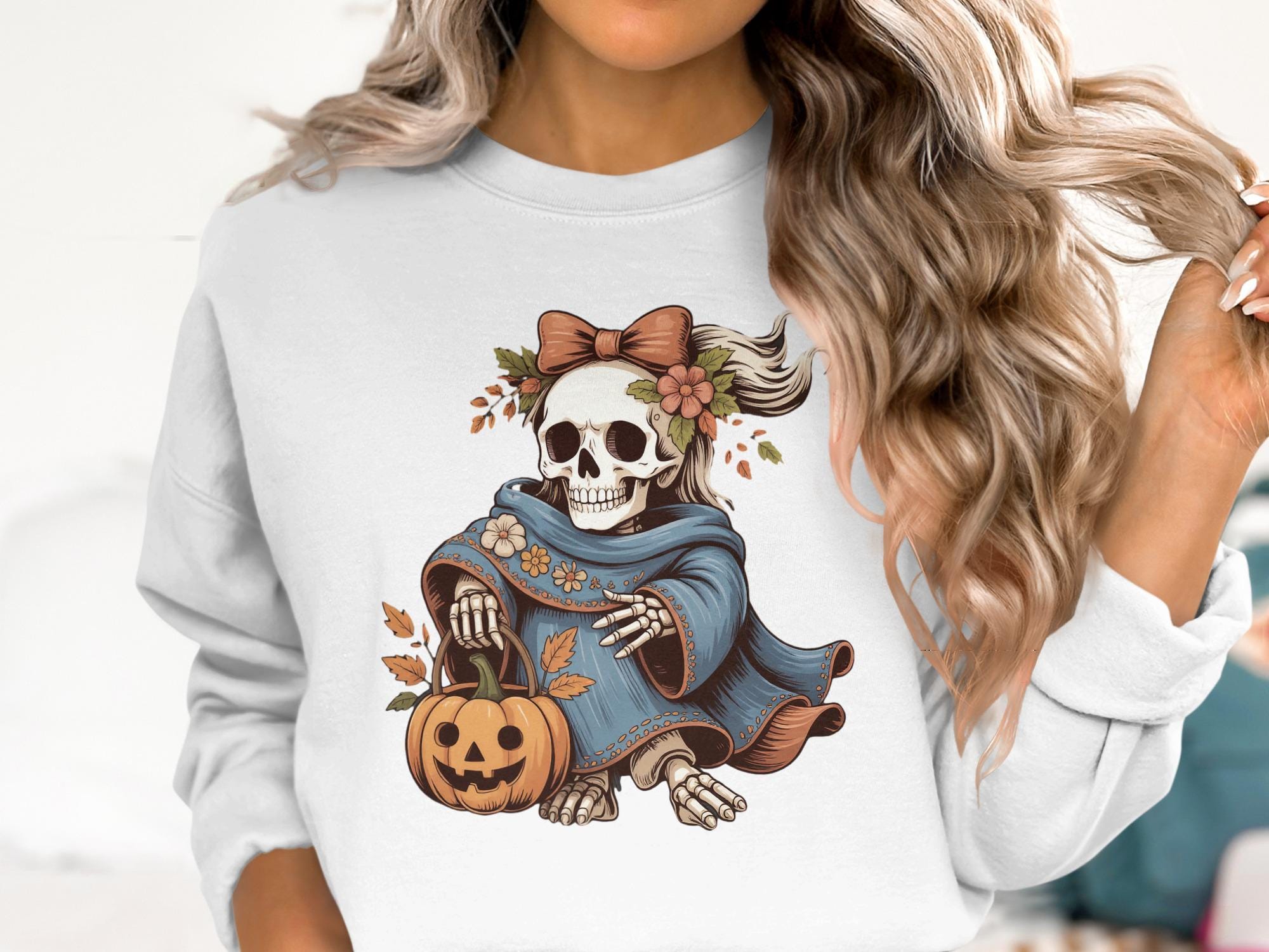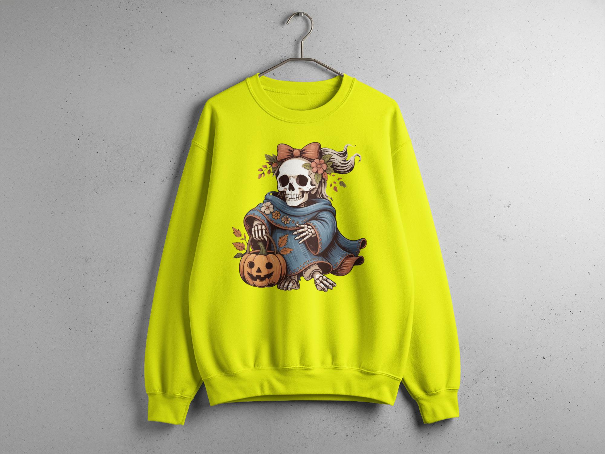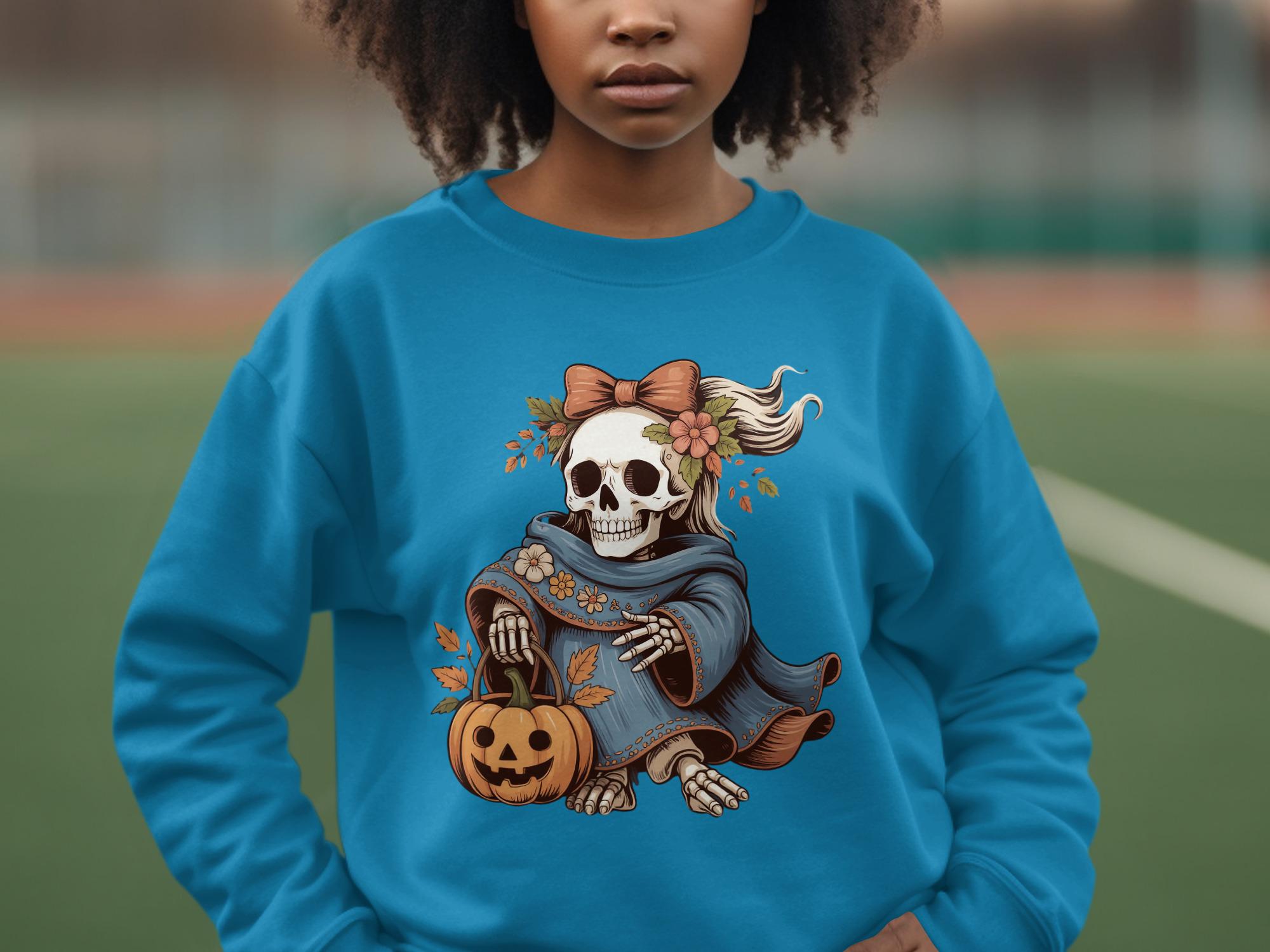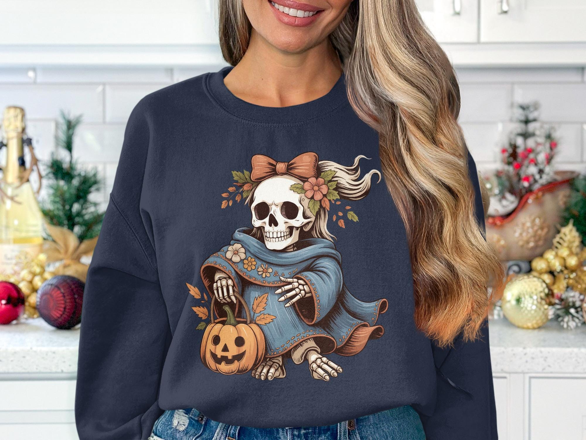 Embrace the spooky season with this Vintage Halloween Skull Sweatshirt featuring a retro spooky skeleton and a cute pumpkin. Perfect for unique fall fashion, this cozy Halloween top is sure to turn heads at any Halloween party or gathering. Ai helped create this image. Enjoy the comfort and style, plus my Love it Guarantee - if you don't love it, you can return it for a full refund.