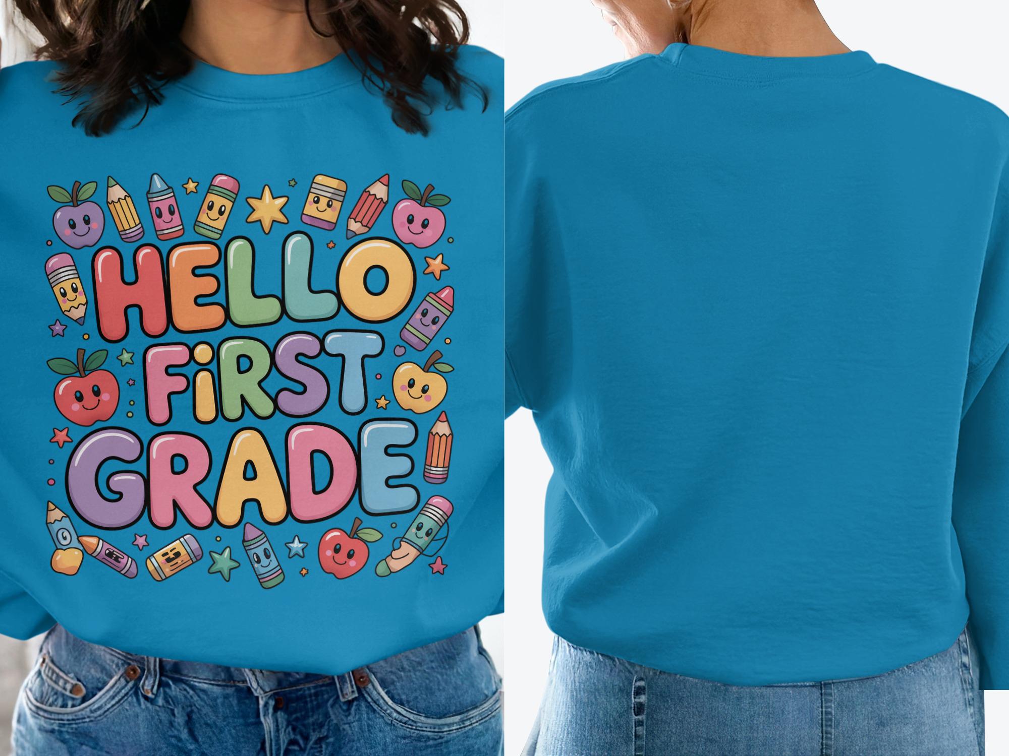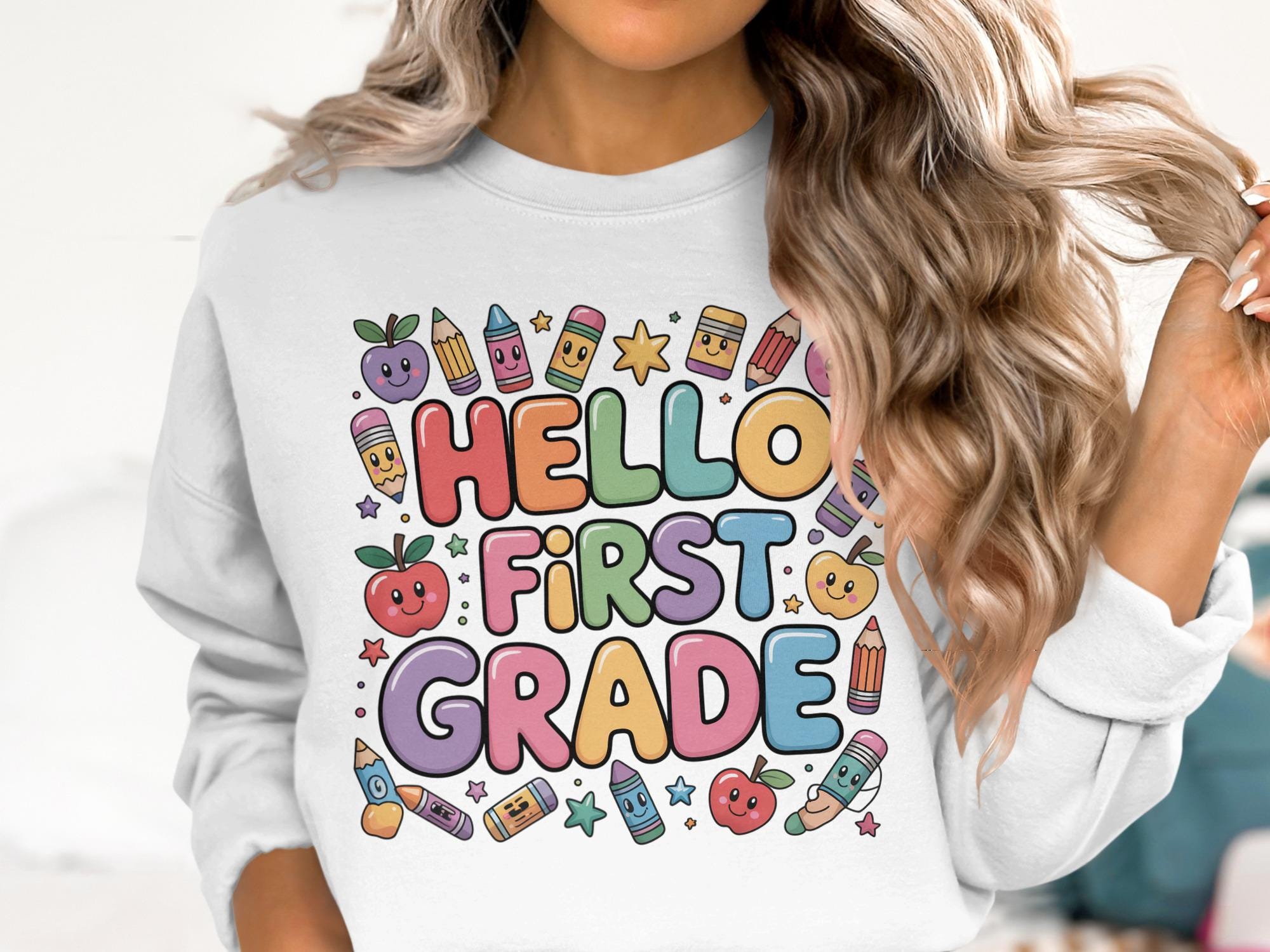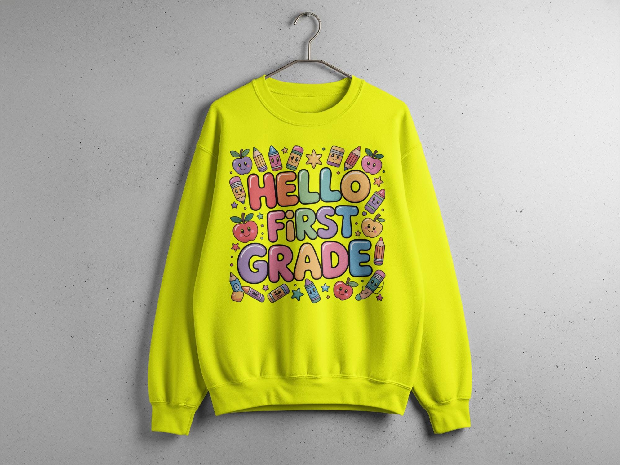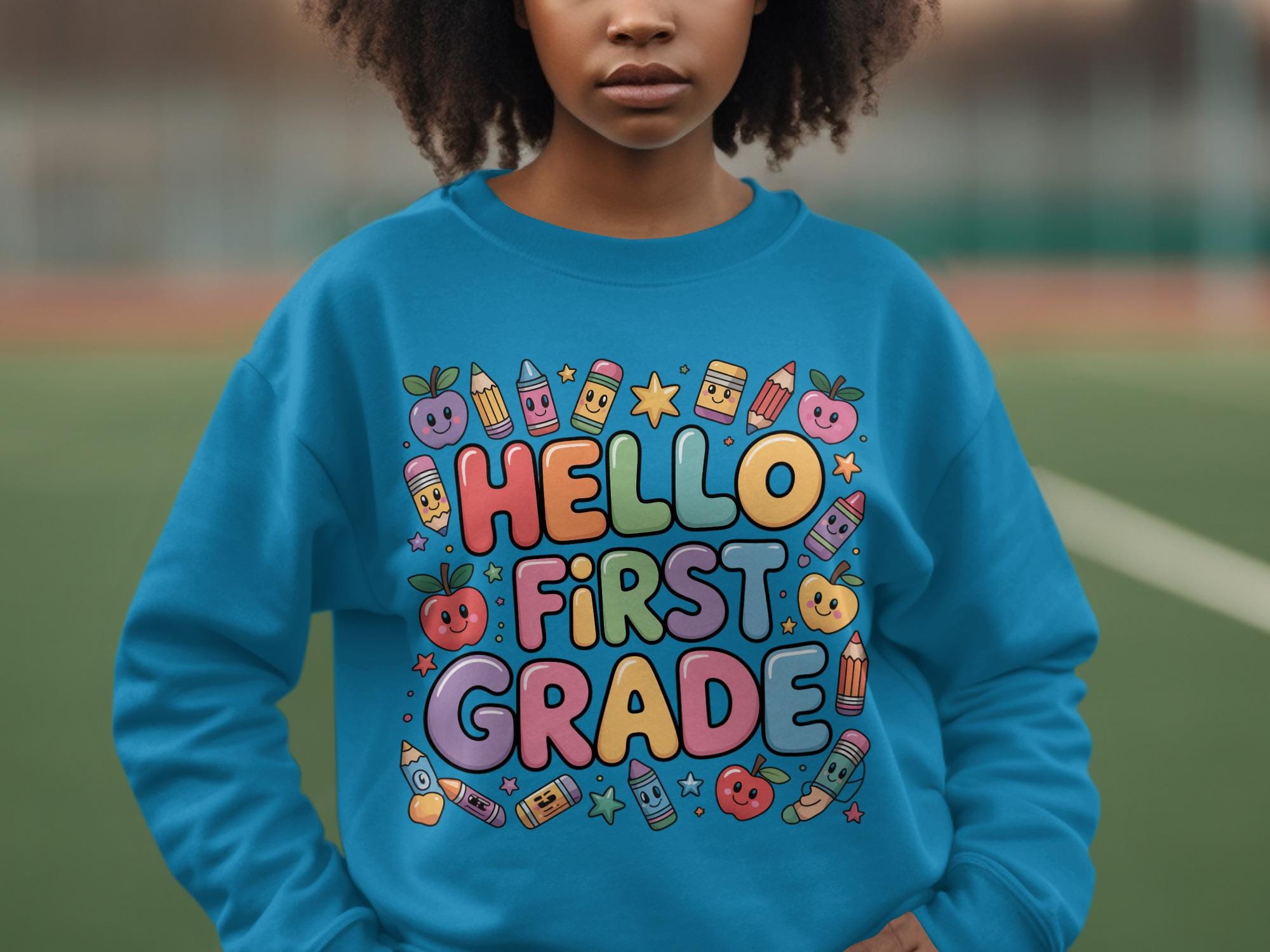 Celebrate the start of first grade with our Hello First Grade sweatshirt, perfect for kids excited about school. Featuring a playful design created with the help of AI, this sweatshirt is not only fun but also comfortable. Our Love it Guarantee ensures that if your child doesn’t love this sweatshirt, you can return it for a full refund.