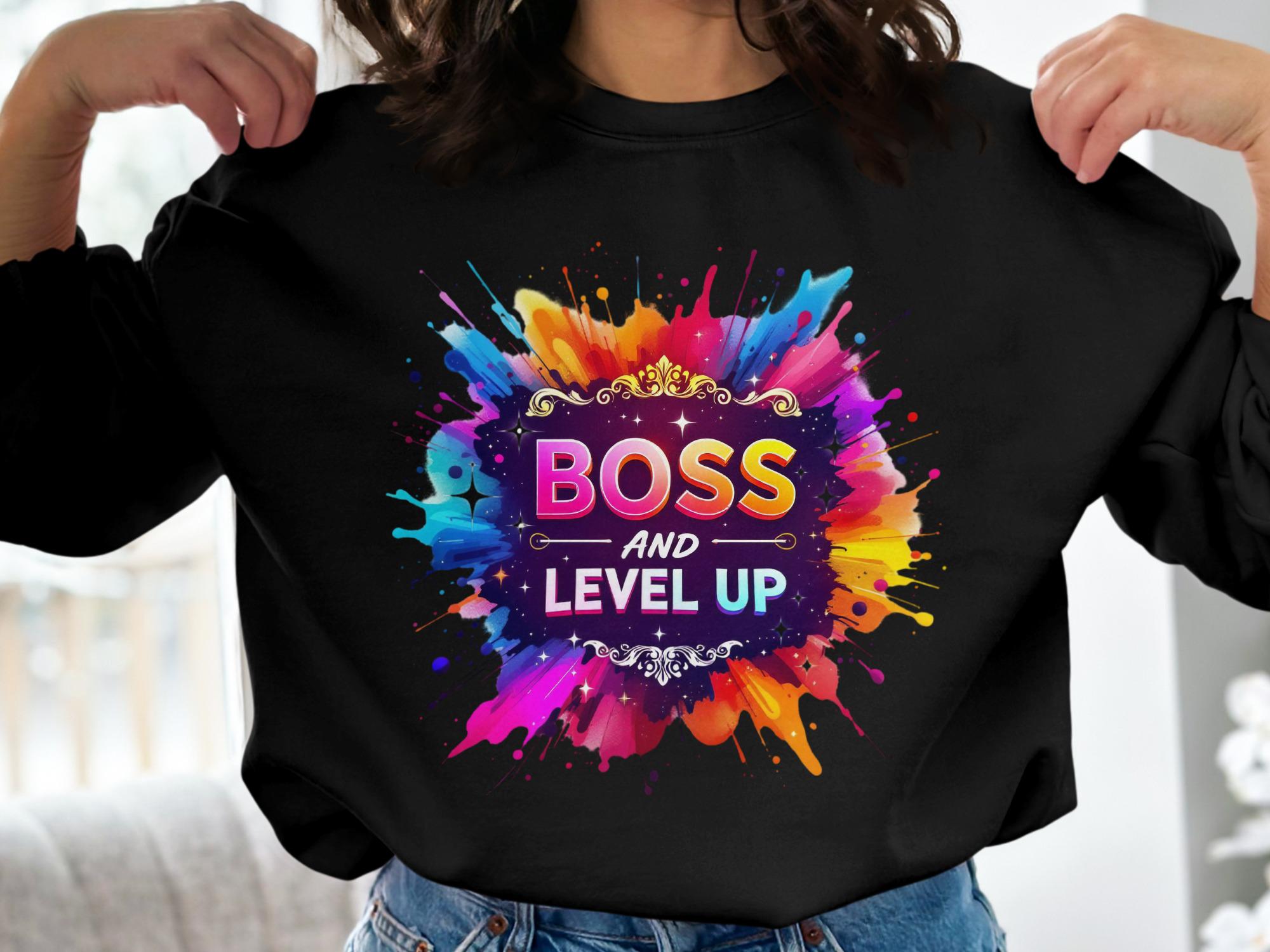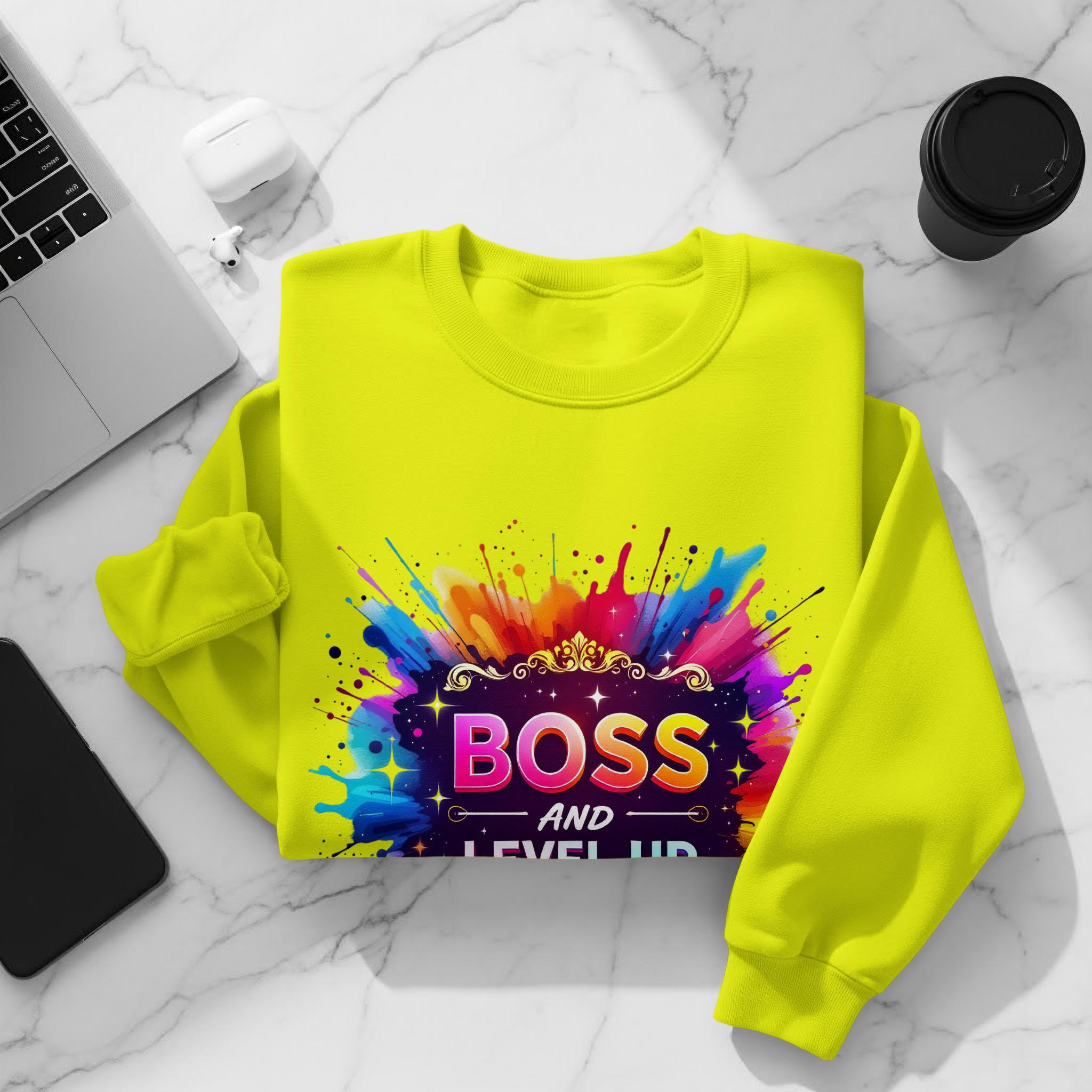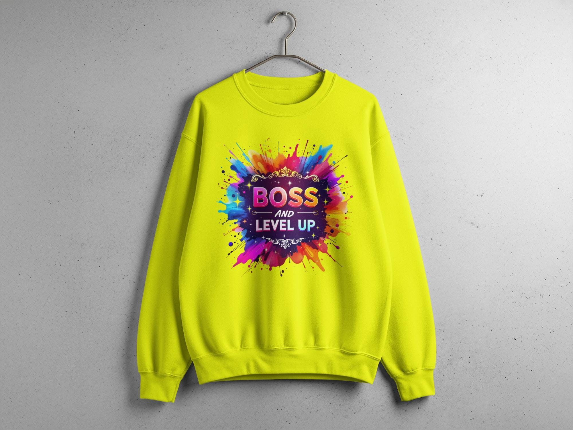 Discover the Boss and Level Up Sweatshirt, featuring a vibrant and colorful graphic design that's perfect for gamers and trendsetters alike. This unisex crewneck is ideal for making a bold statement. Ai helped create this image, ensuring a unique and high-quality design. Plus, with our Love it Guarantee, if you don't love it, you can return it for a full refund.