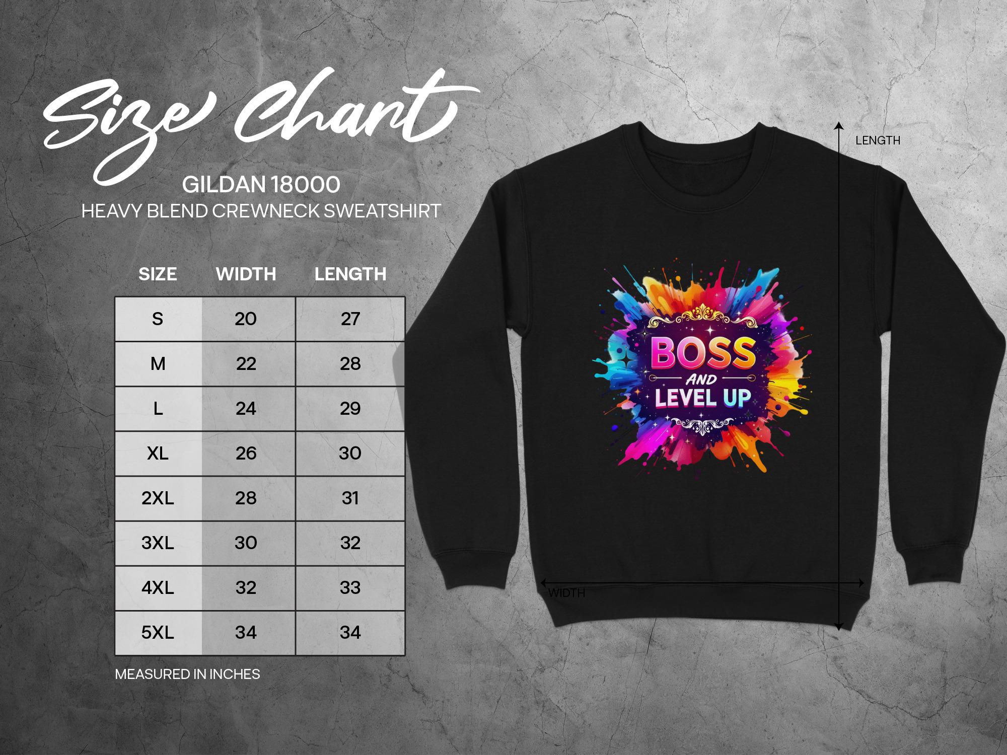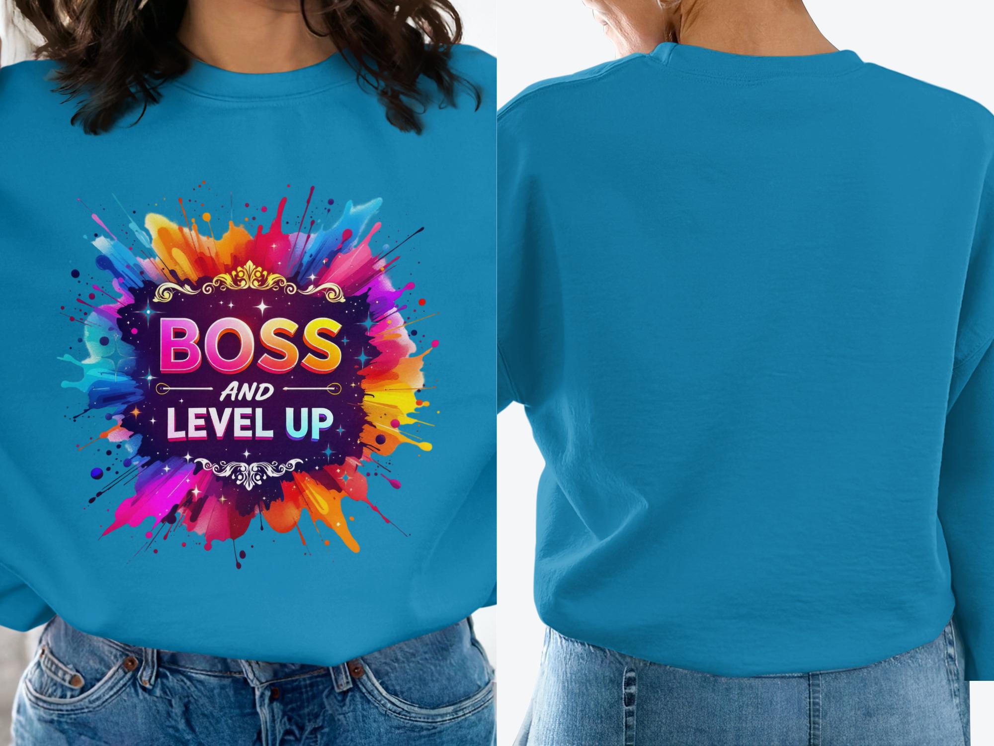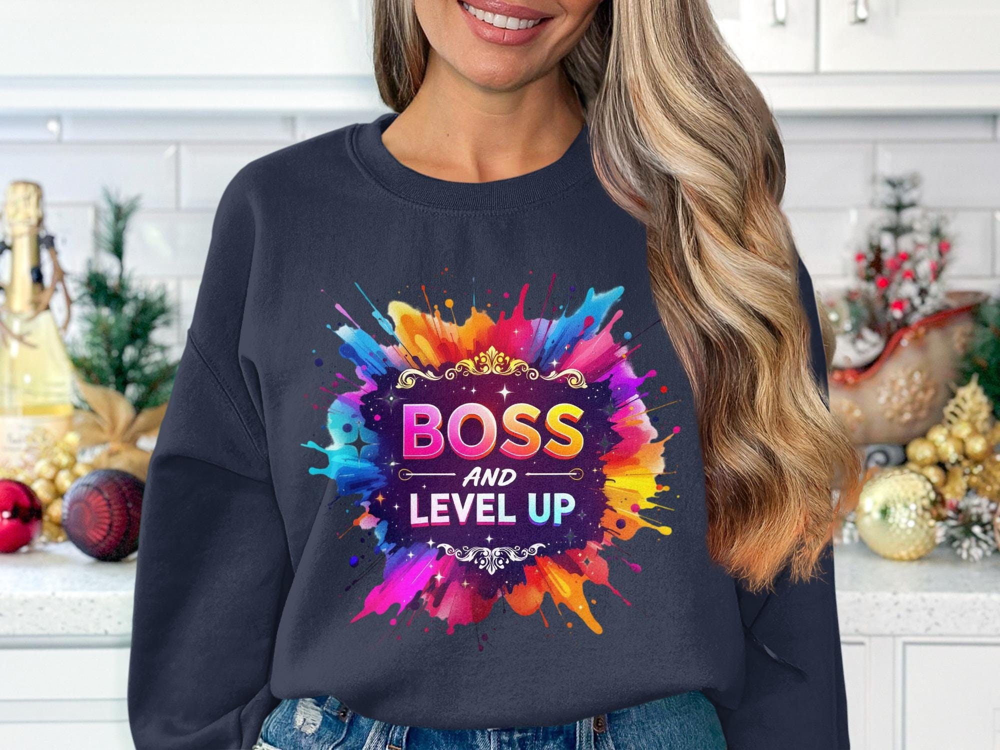 Discover the Boss and Level Up Sweatshirt, featuring a vibrant and colorful graphic design that's perfect for gamers and trendsetters alike. This unisex crewneck is ideal for making a bold statement. Ai helped create this image, ensuring a unique and high-quality design. Plus, with our Love it Guarantee, if you don't love it, you can return it for a full refund.