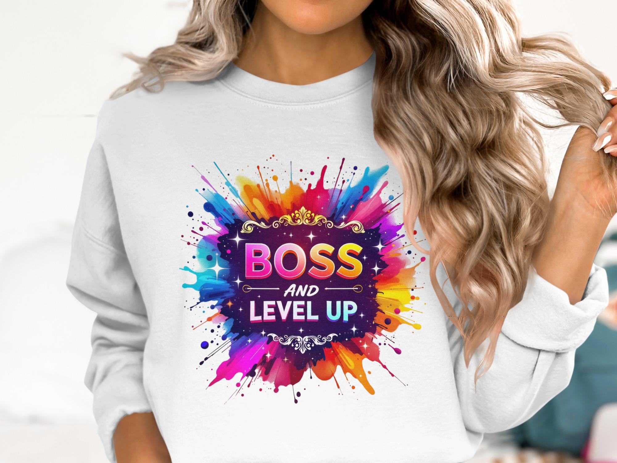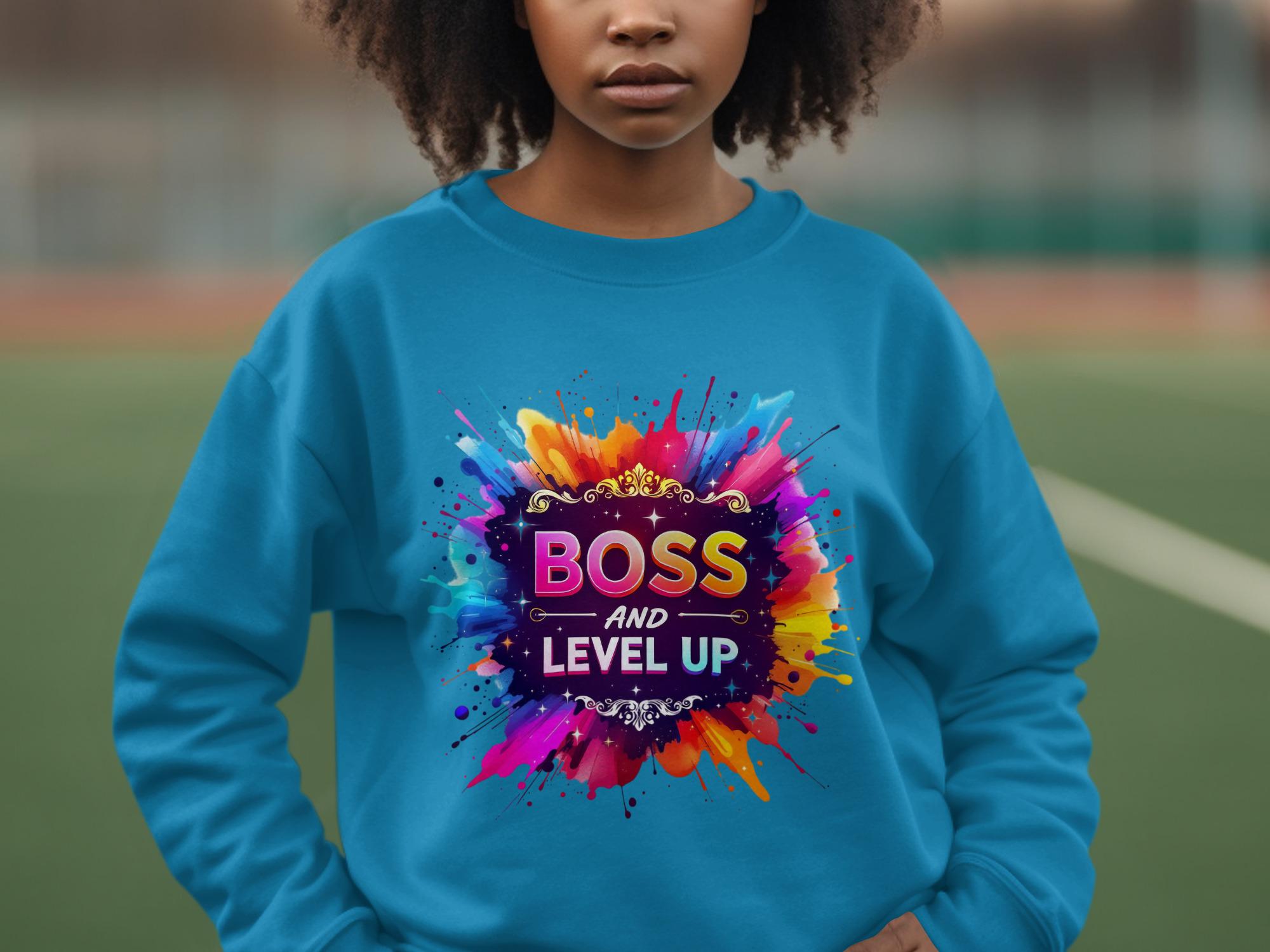 Boss and Level Up Sweatshirt, Colorful Graphic Crewneck, Gamer Gift