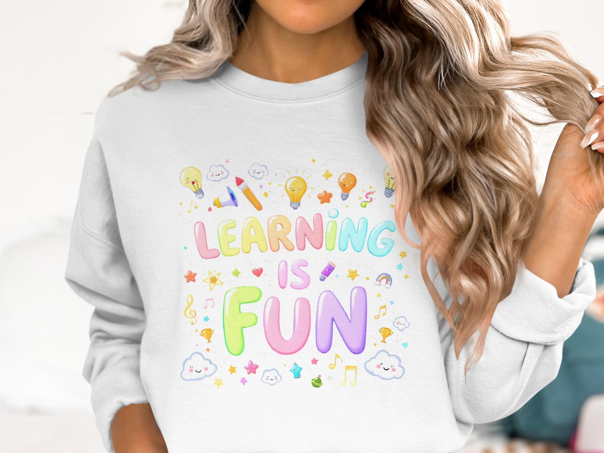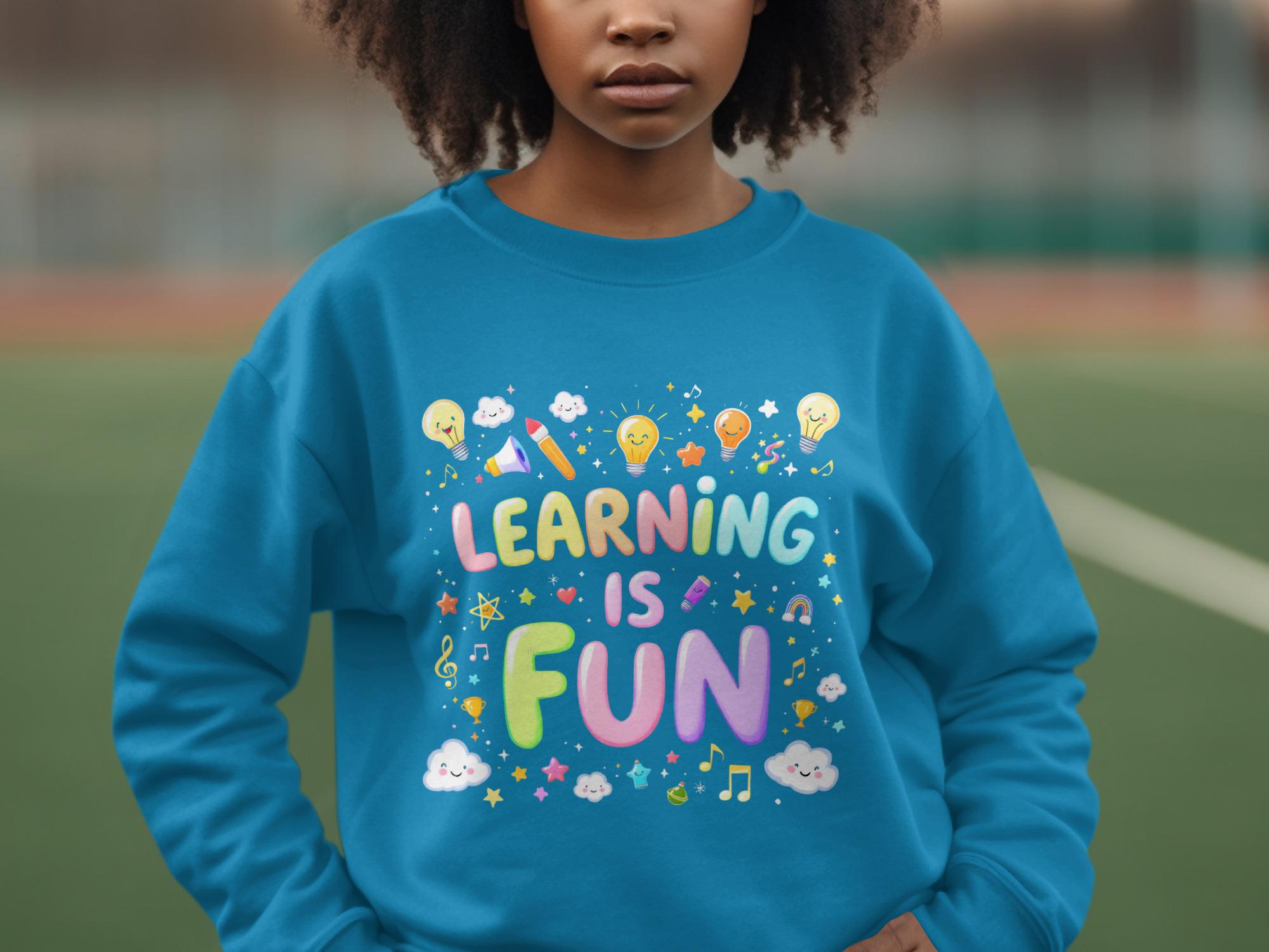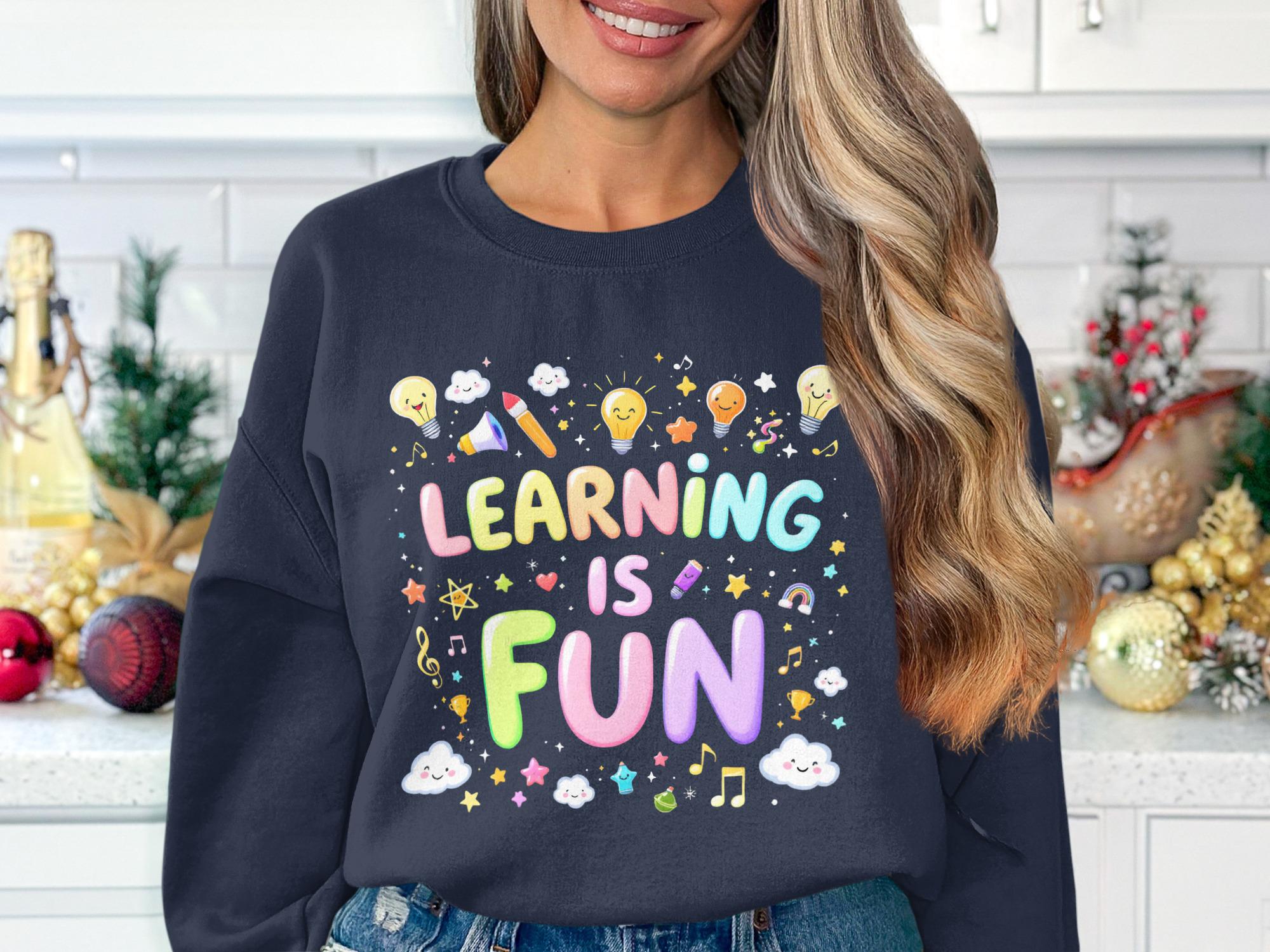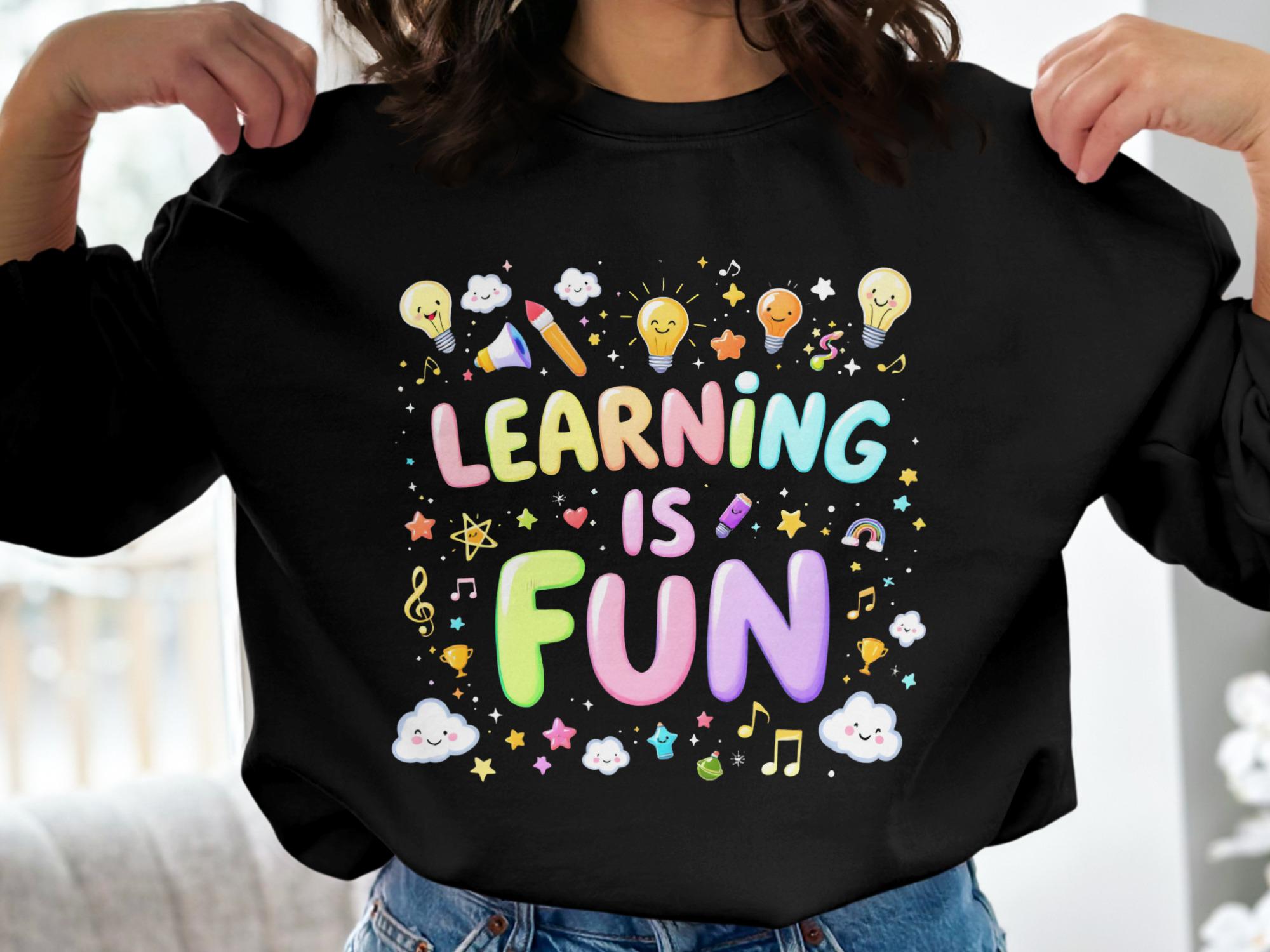 This Learning is Fun Sweatshirt features a vibrant and educational graphic that will inspire joy in learning. Perfect for kids and students, this colorful design includes fun elements like light bulbs, musical notes, and more. Ai helped create this image. Love it Guarantee: If you don't love this product, you can return it for a full refund.