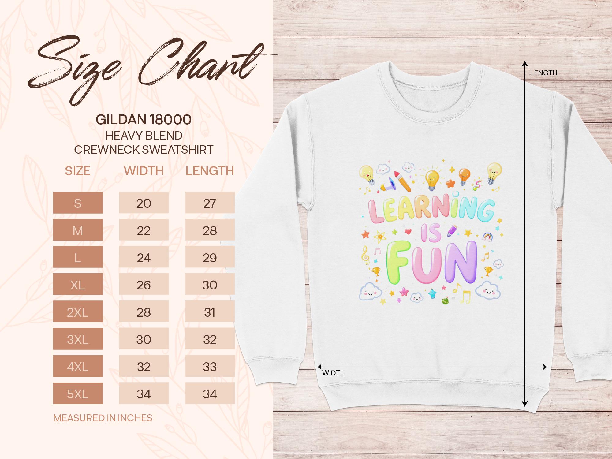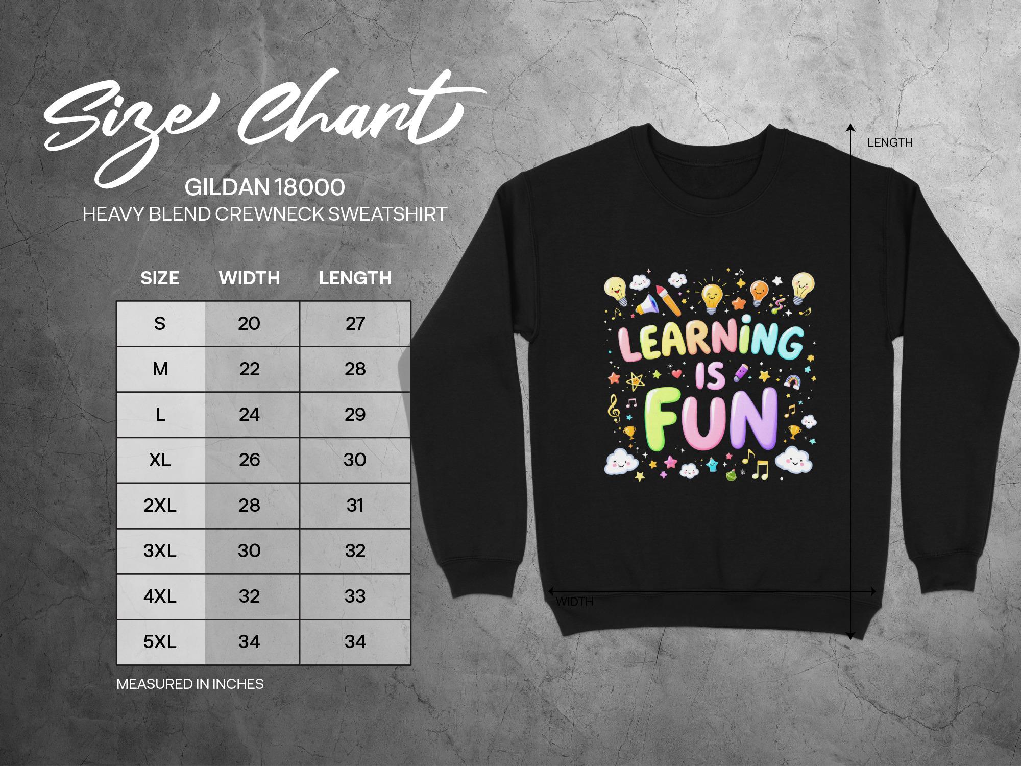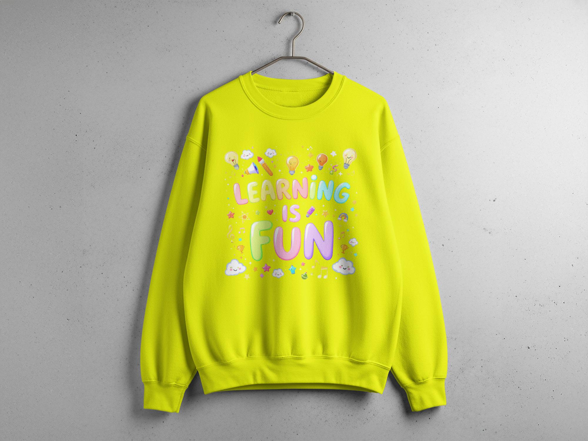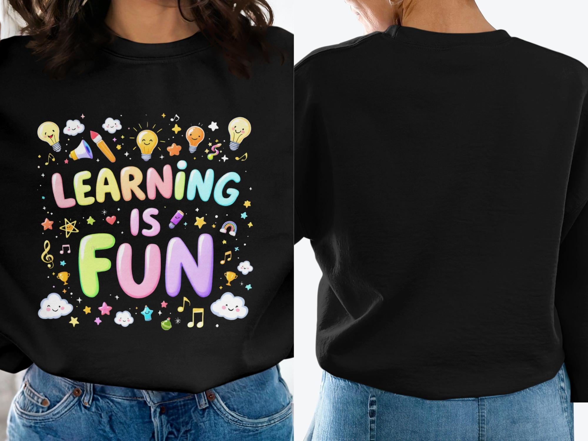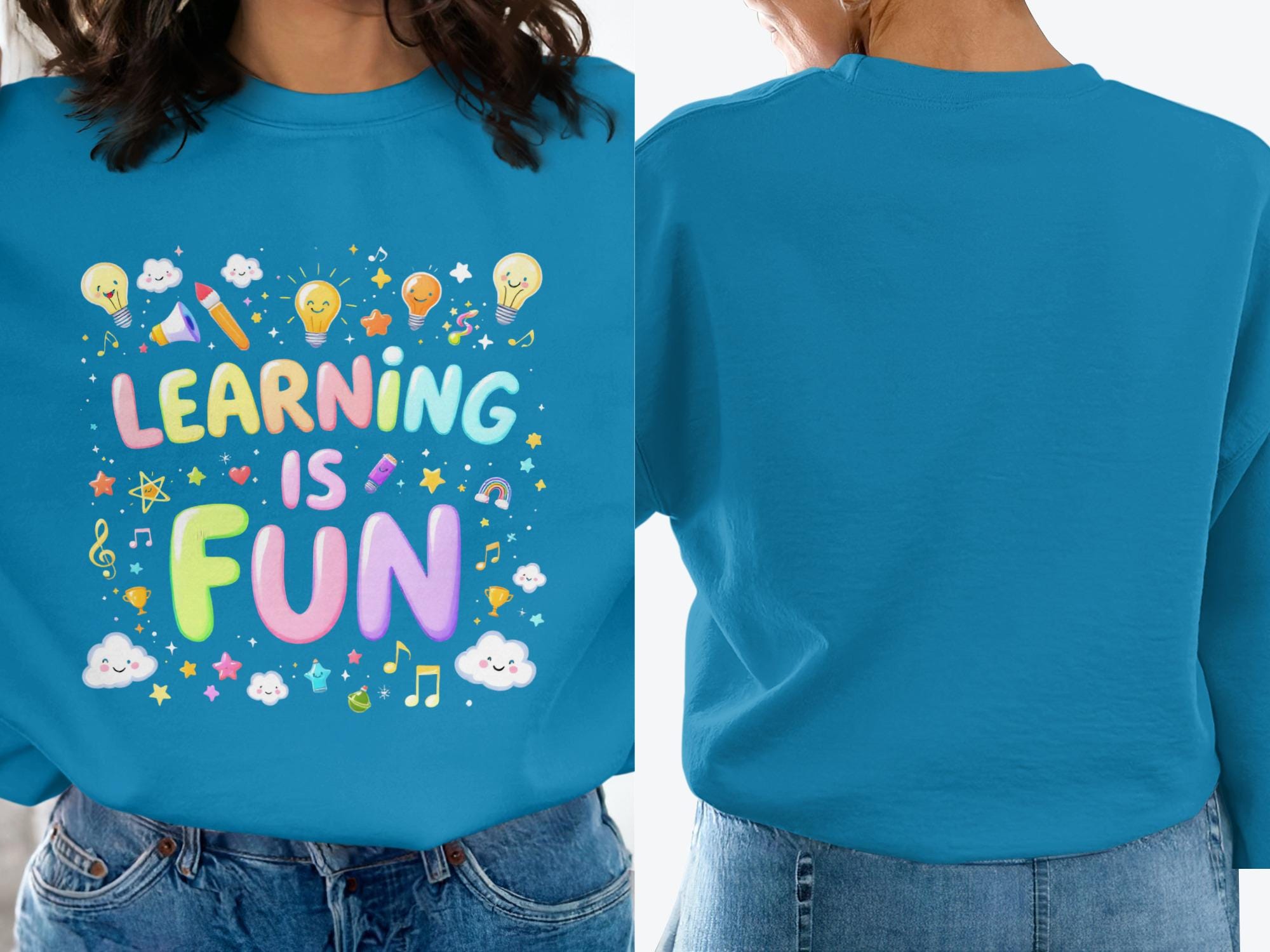 This Learning is Fun Sweatshirt features a vibrant and educational graphic that will inspire joy in learning. Perfect for kids and students, this colorful design includes fun elements like light bulbs, musical notes, and more. Ai helped create this image. Love it Guarantee: If you don't love this product, you can return it for a full refund.
