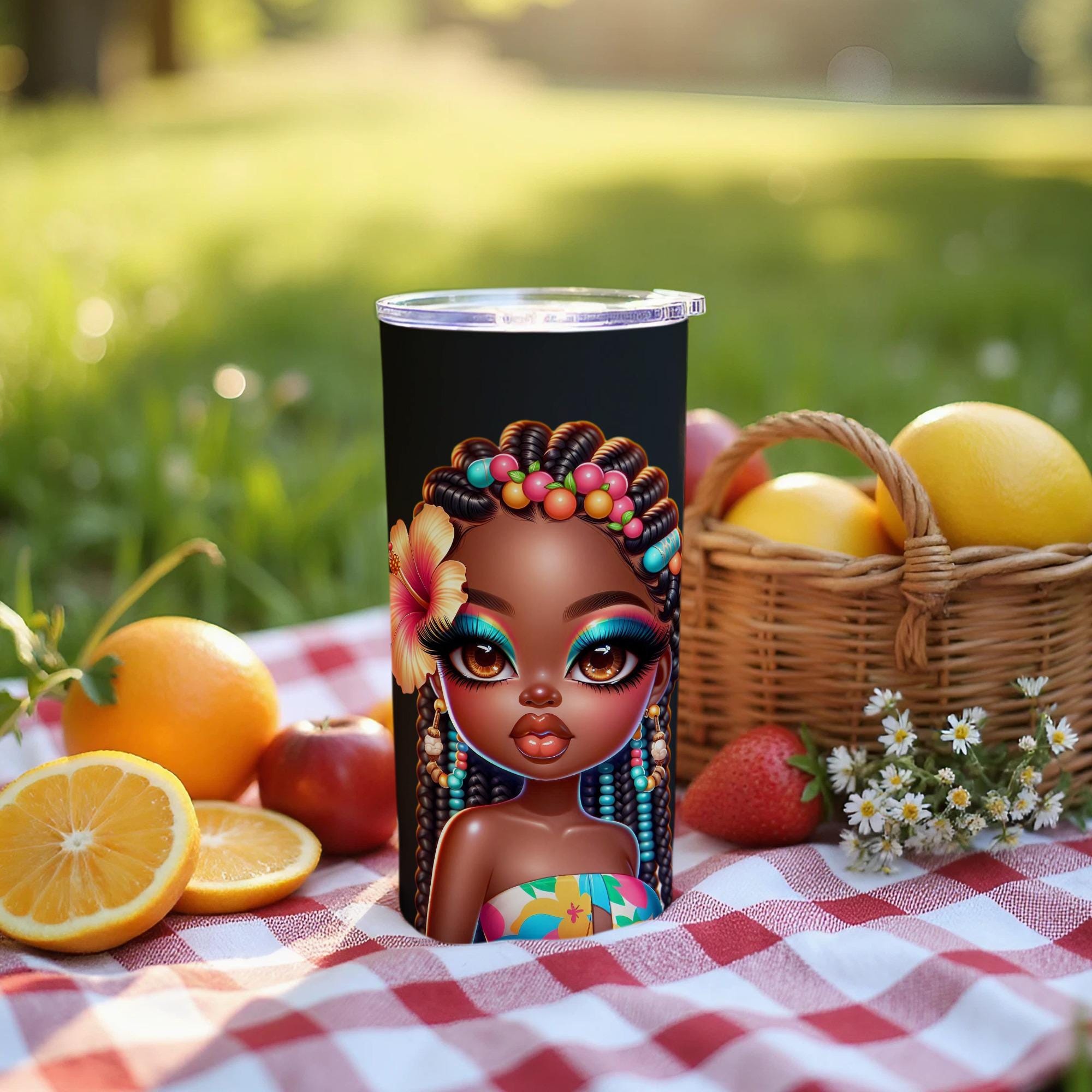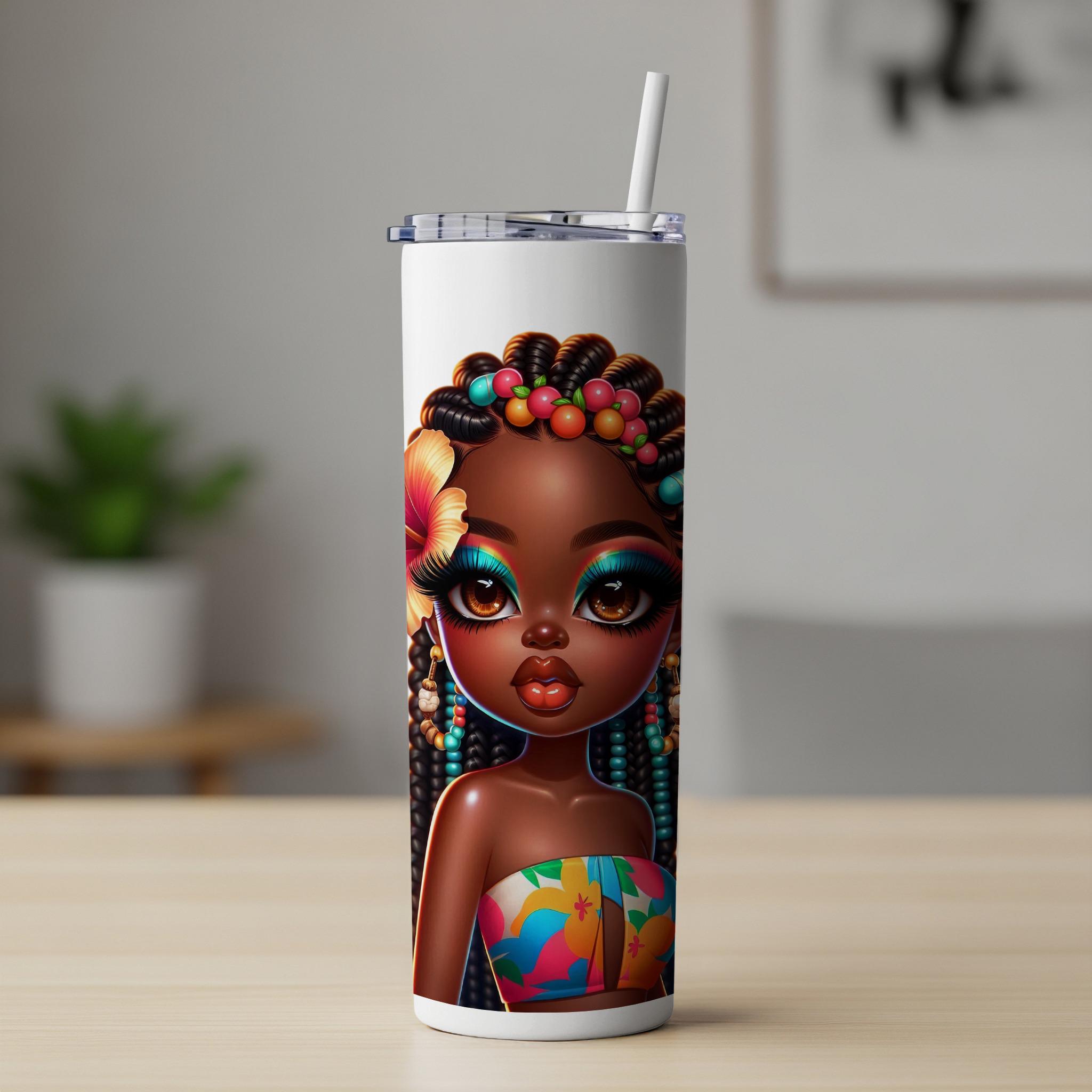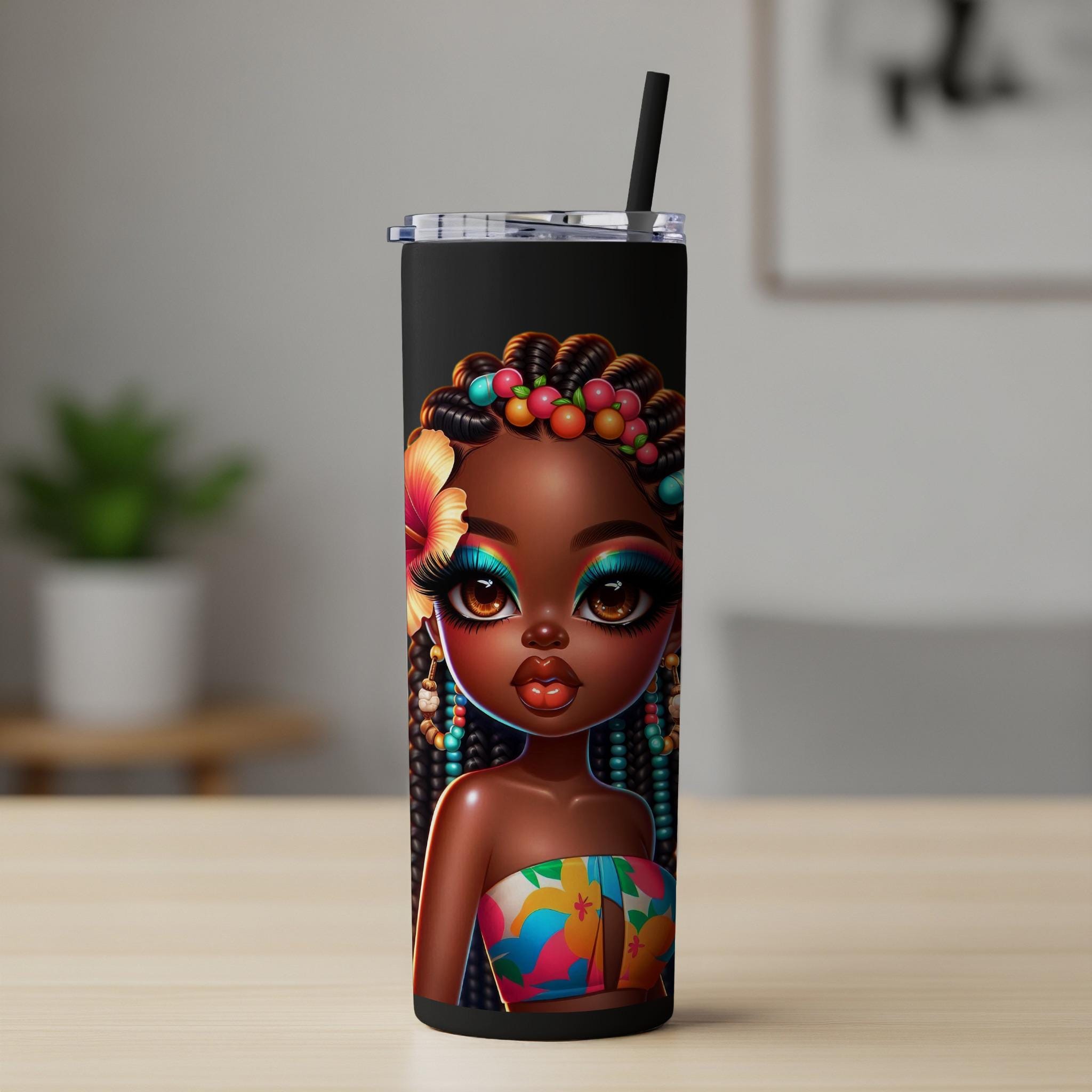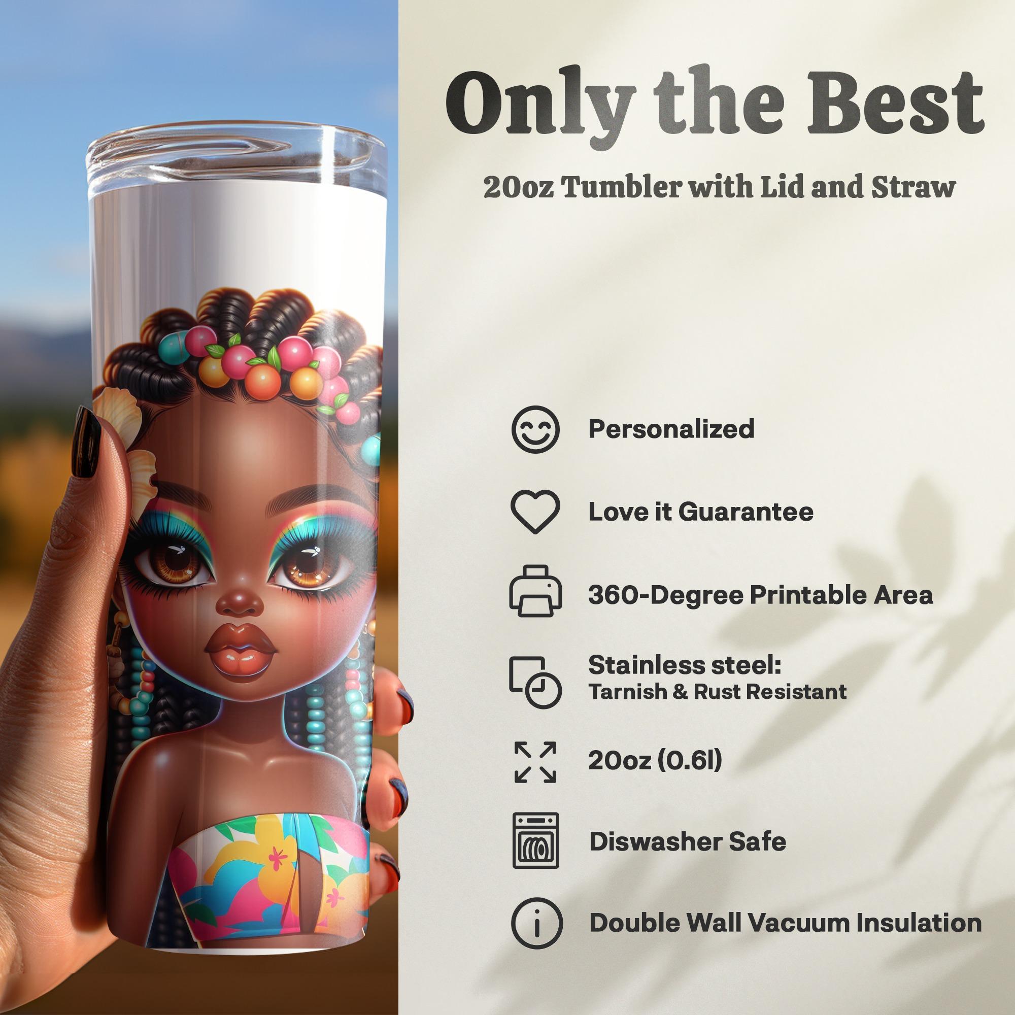 This vibrant tumbler features a stunning AI-created art doll with colorful floral braids. Perfect as a cute cartoon character cup, it makes a unique gift idea. The love it guarantee offers a full refund if the customer does not love the product.