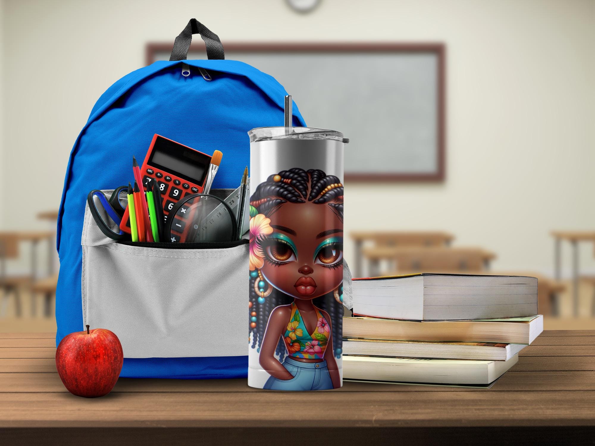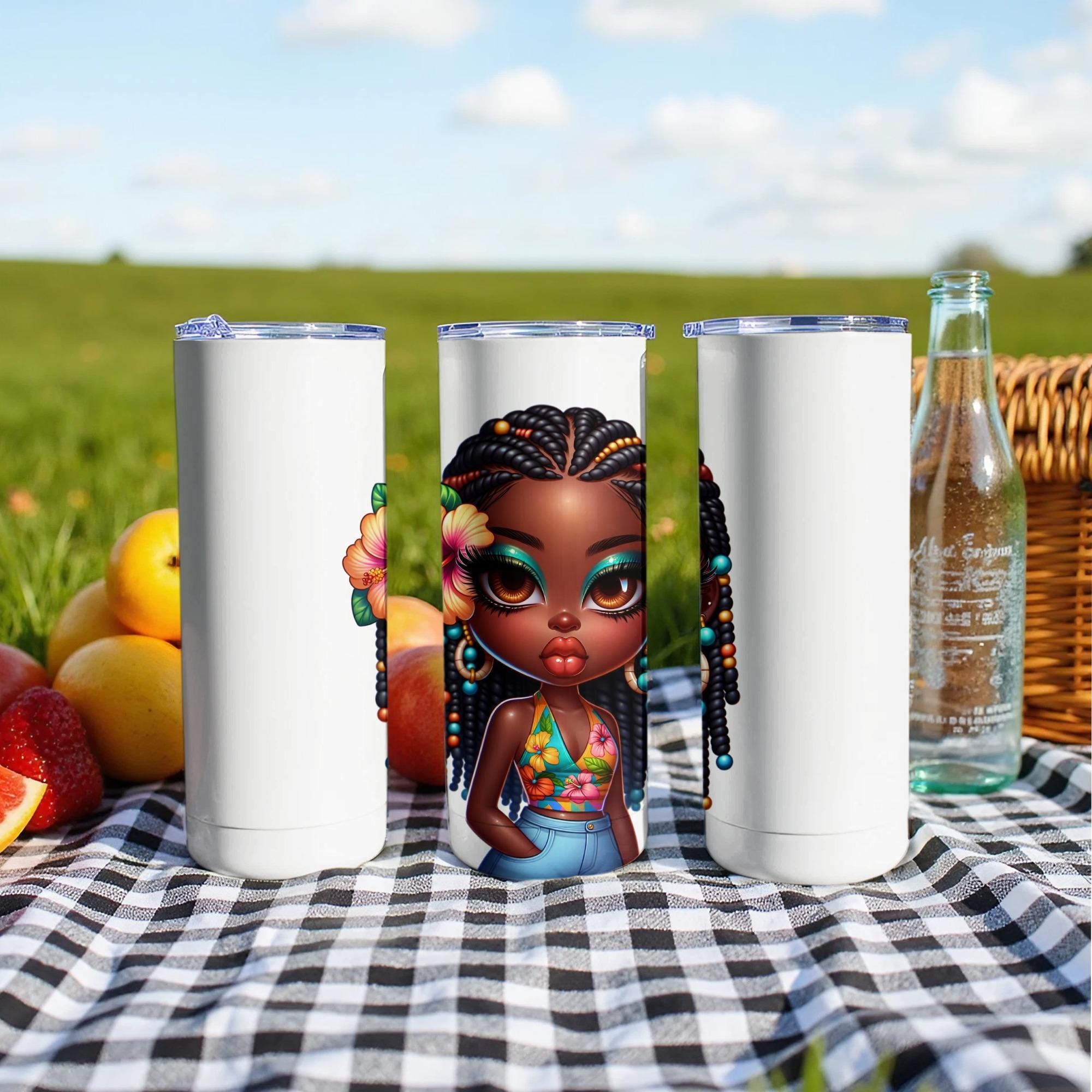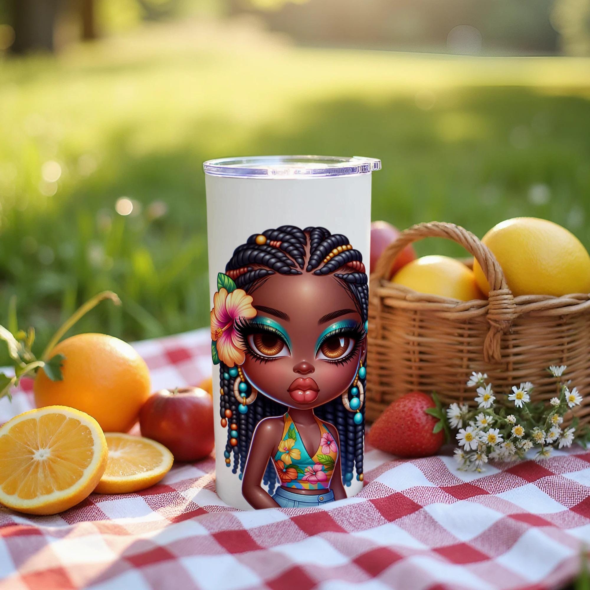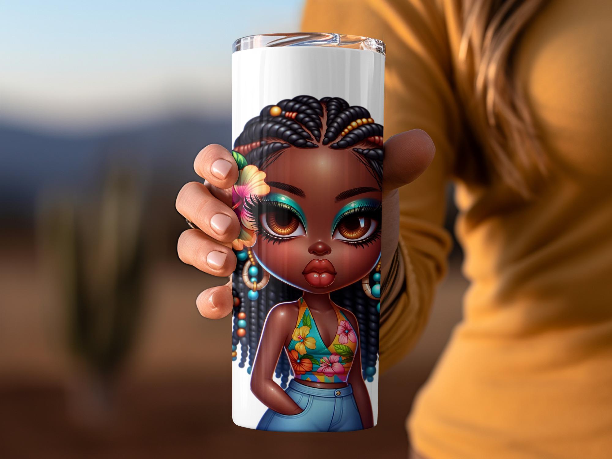 This trendy tumbler features a cute cartoon depiction of a stylish black girl. This design is perfect for anyone who loves unique and eye catching drinkware. It makes a great gift for friends, family, or yourself!