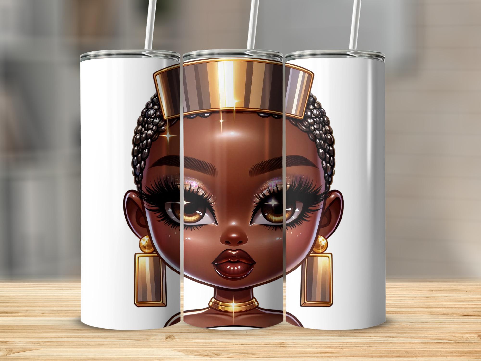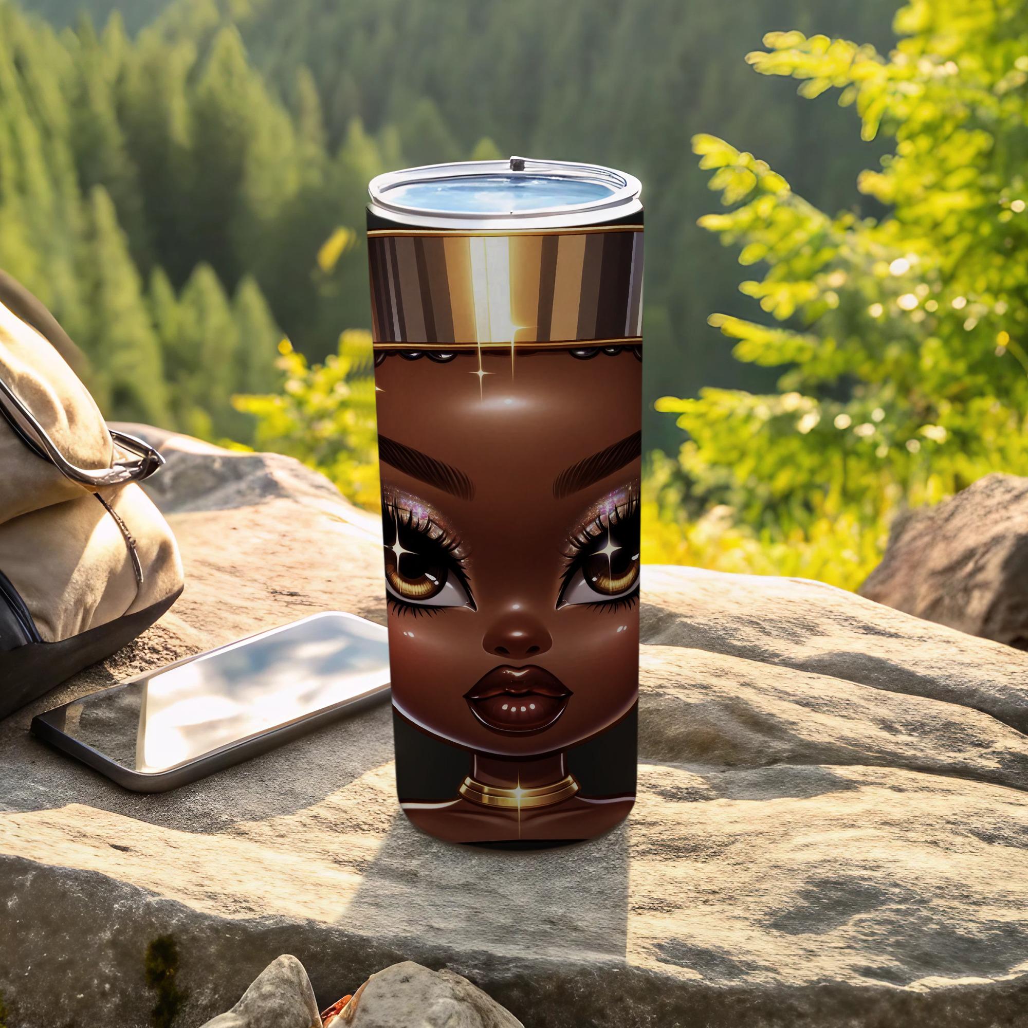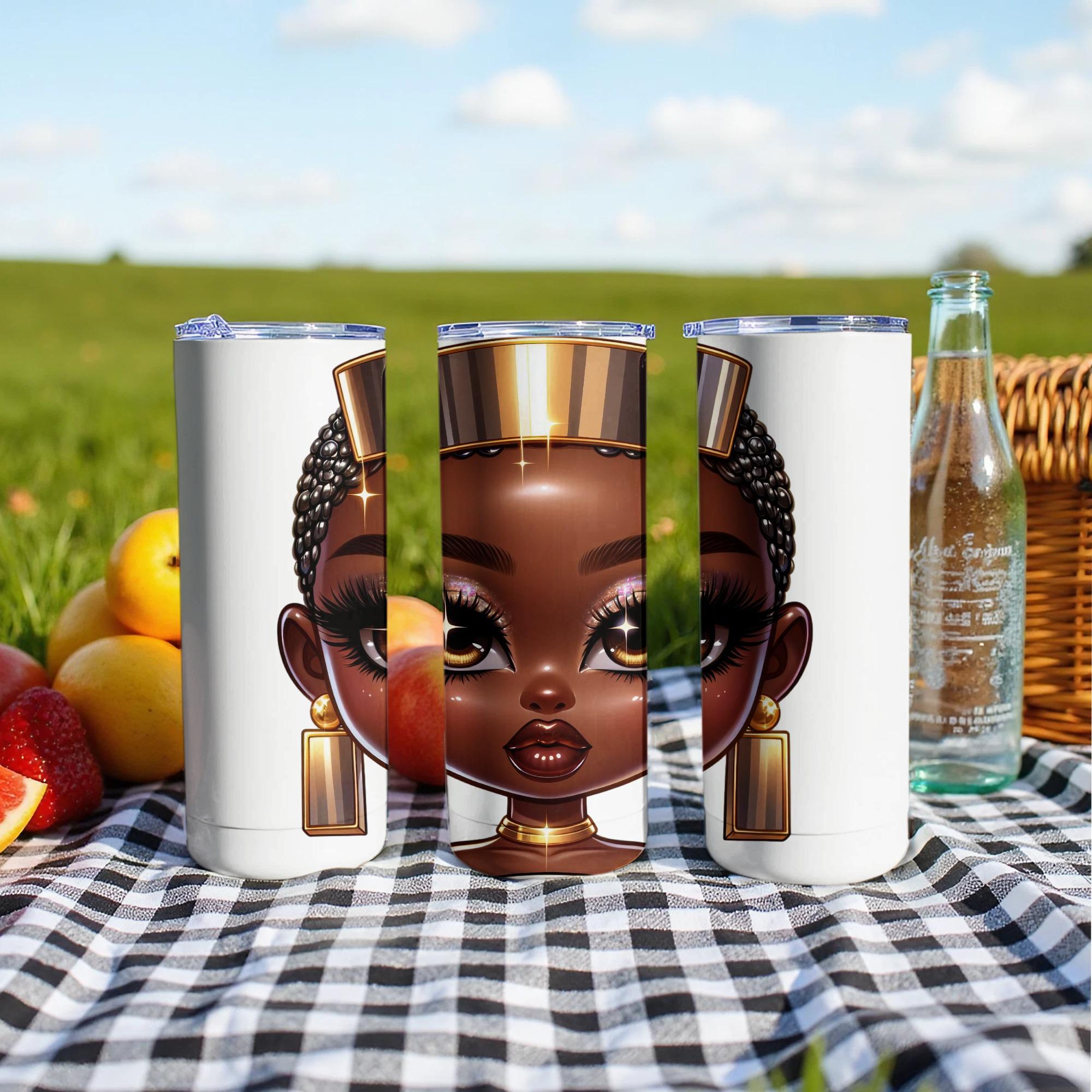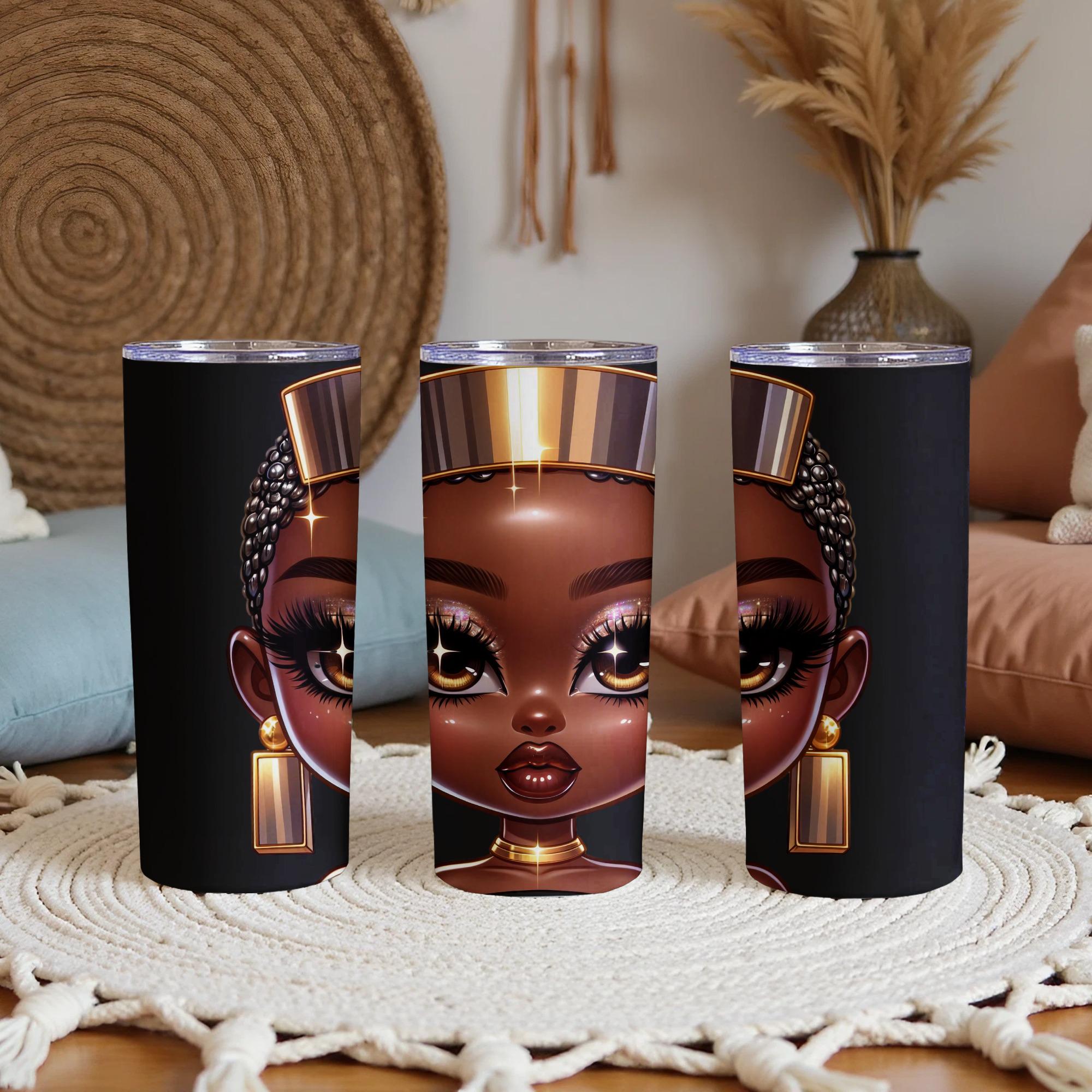 This design showcases a beautifully rendered African Queen with intricate details. Her captivating gaze and regal demeanor make this tumbler a true statement piece.