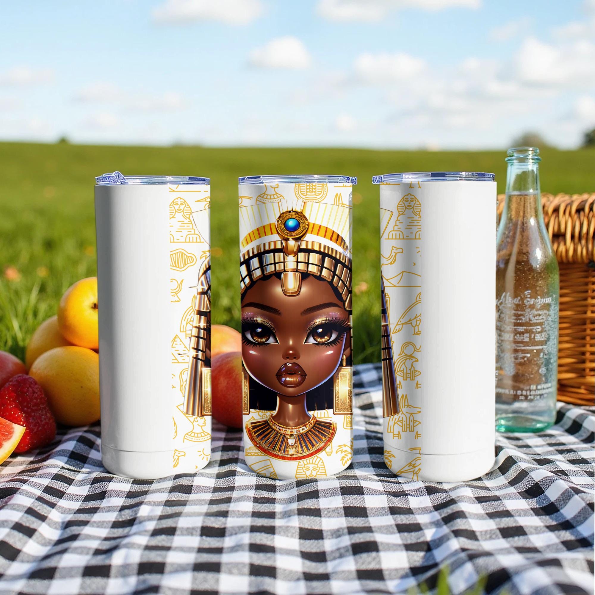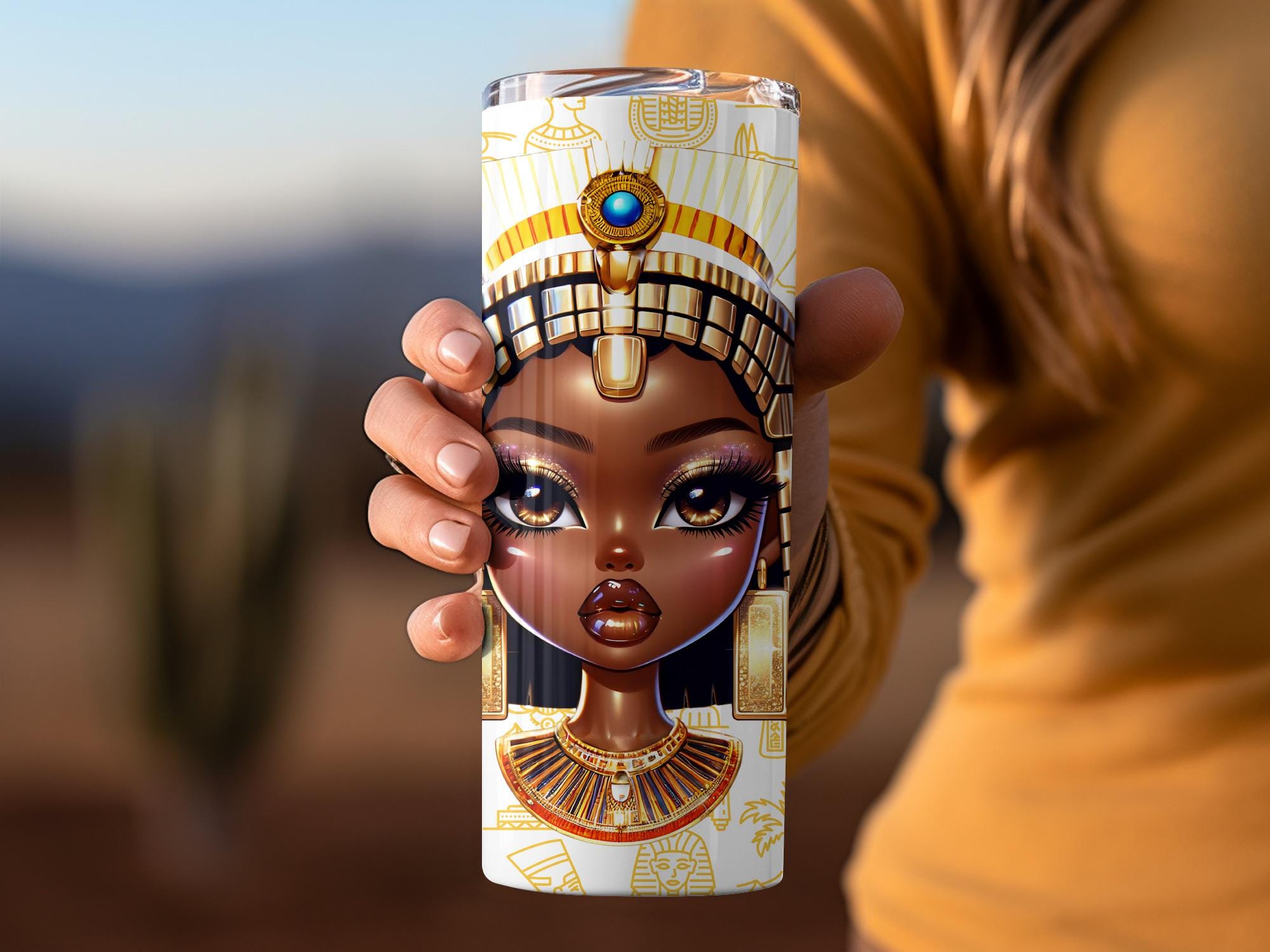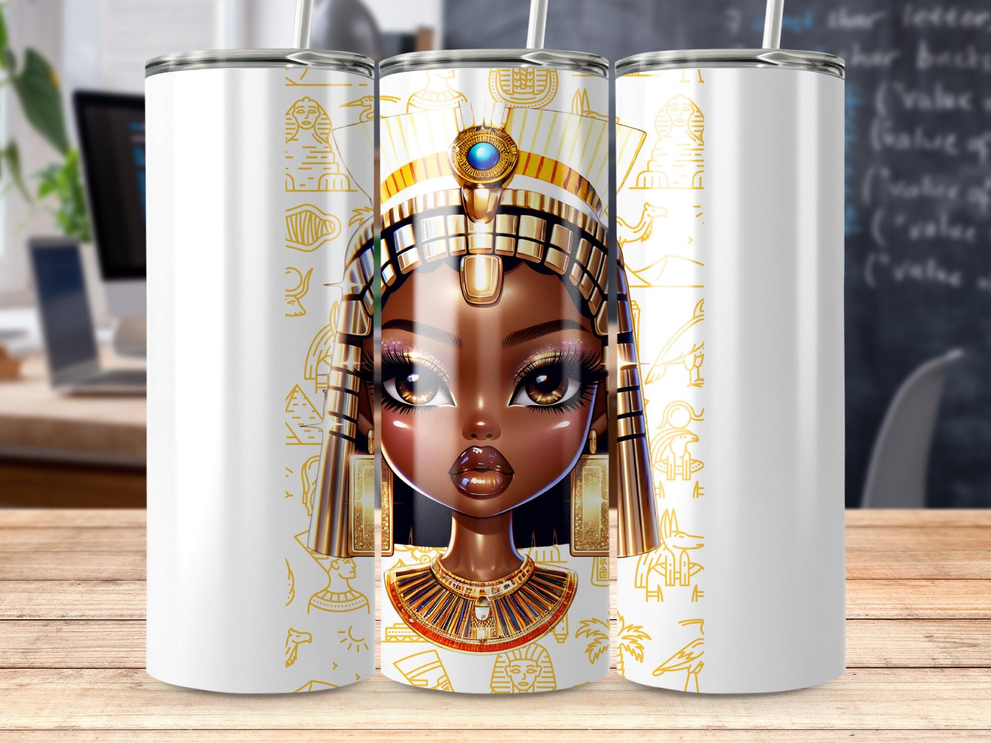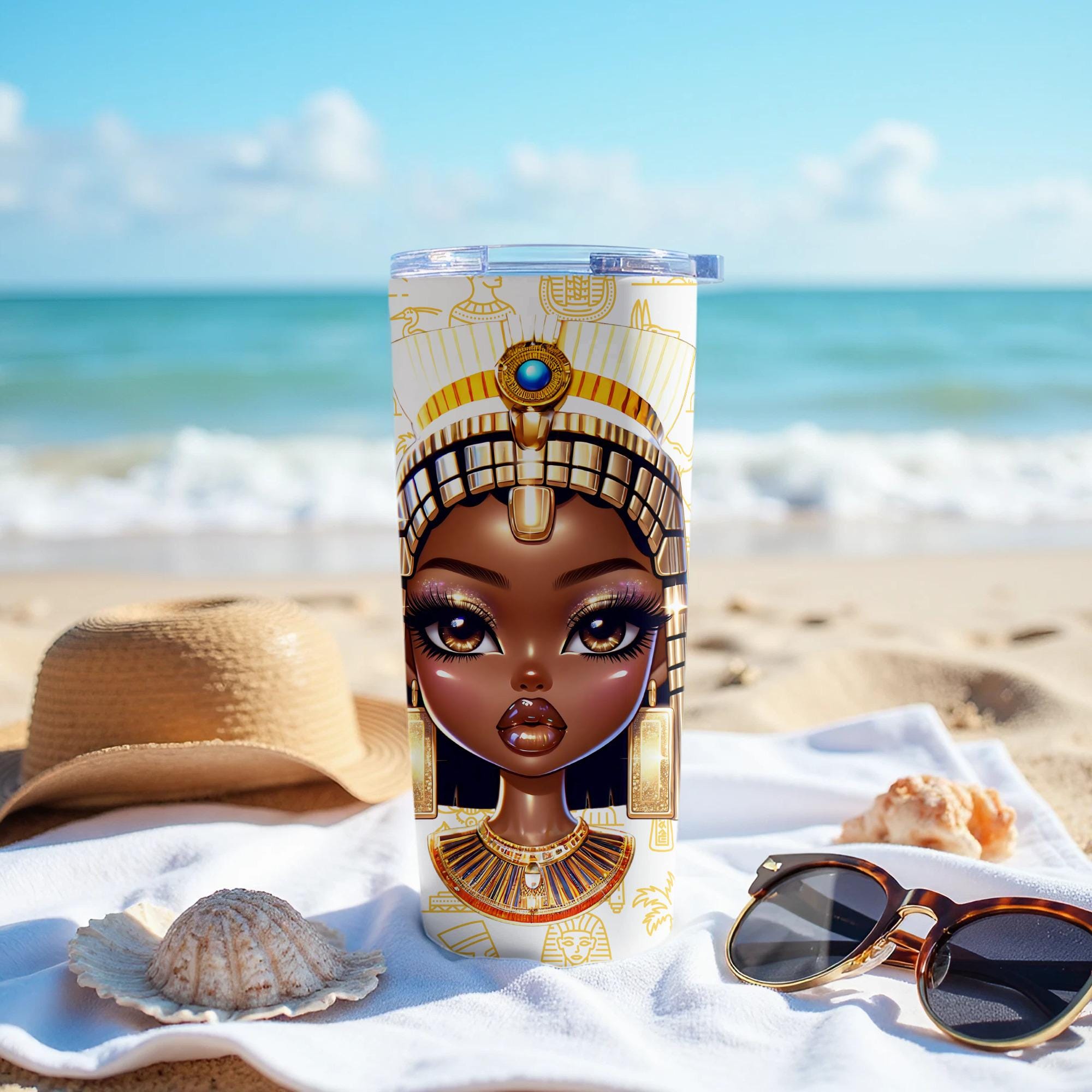 This beautiful tumbler features an artistic depiction of an Egyptian queen, reminiscent of the pharaohs of ancient Egypt. The unique design includes intricate details and vibrant colors, making it a standout piece. Enjoy your favorite beverages in style with this eye catching tumbler. Perfect as a gift or a treat for yourself.