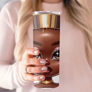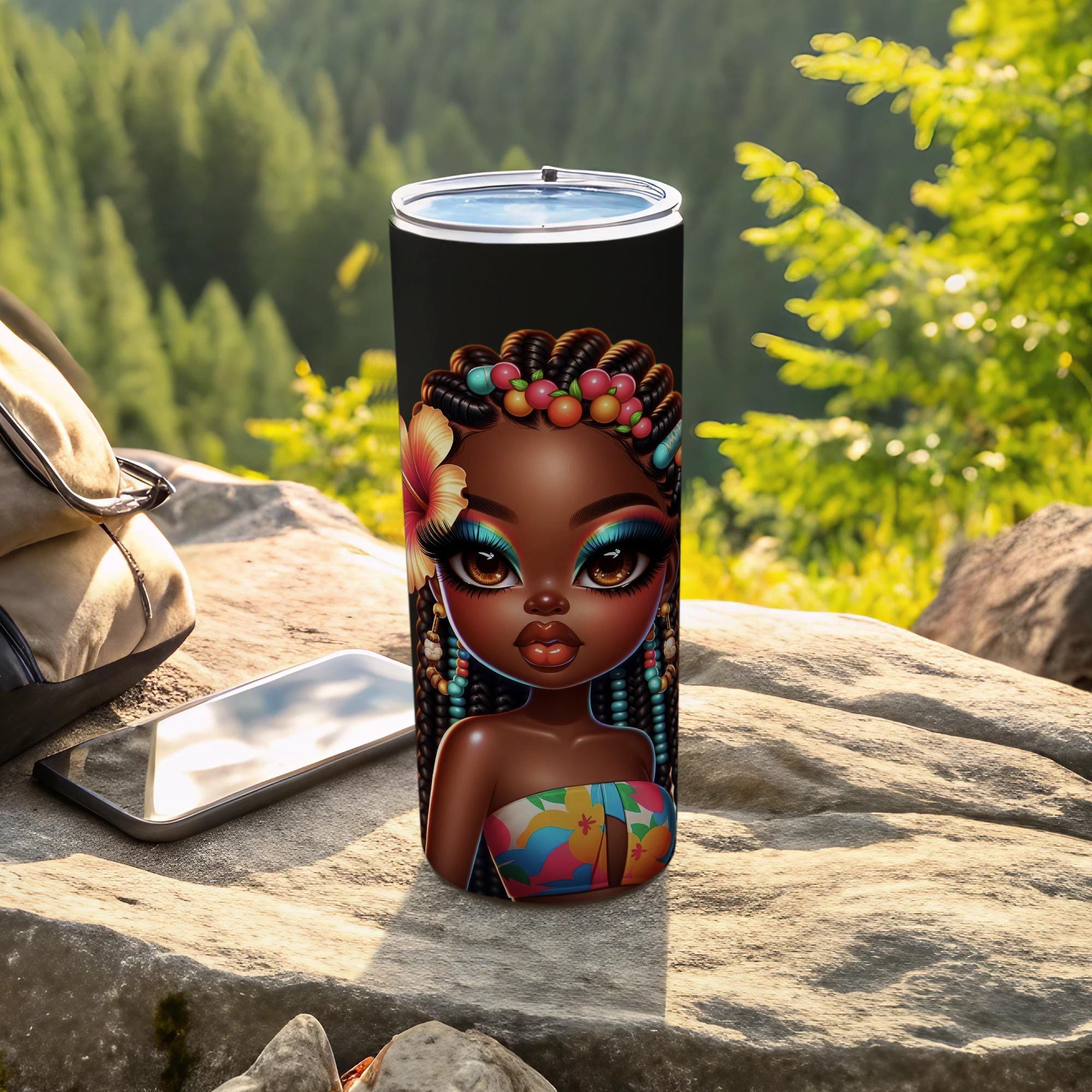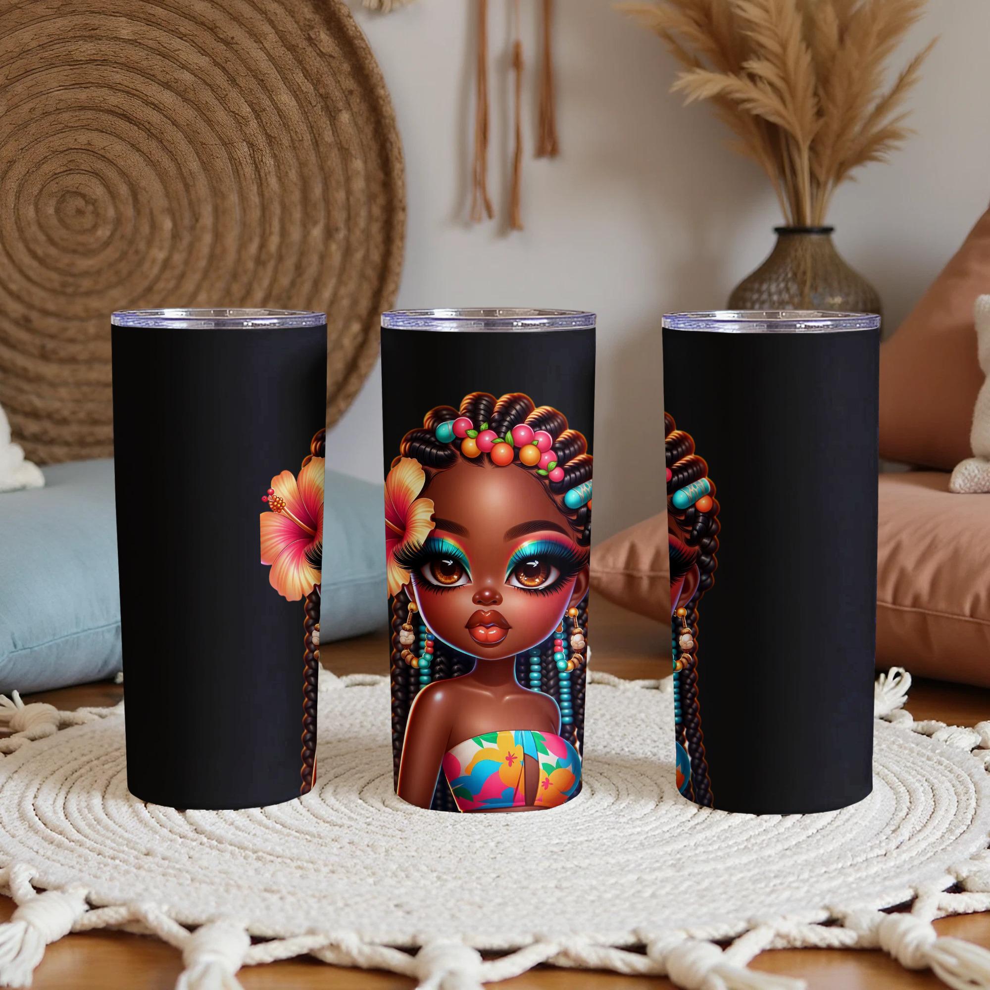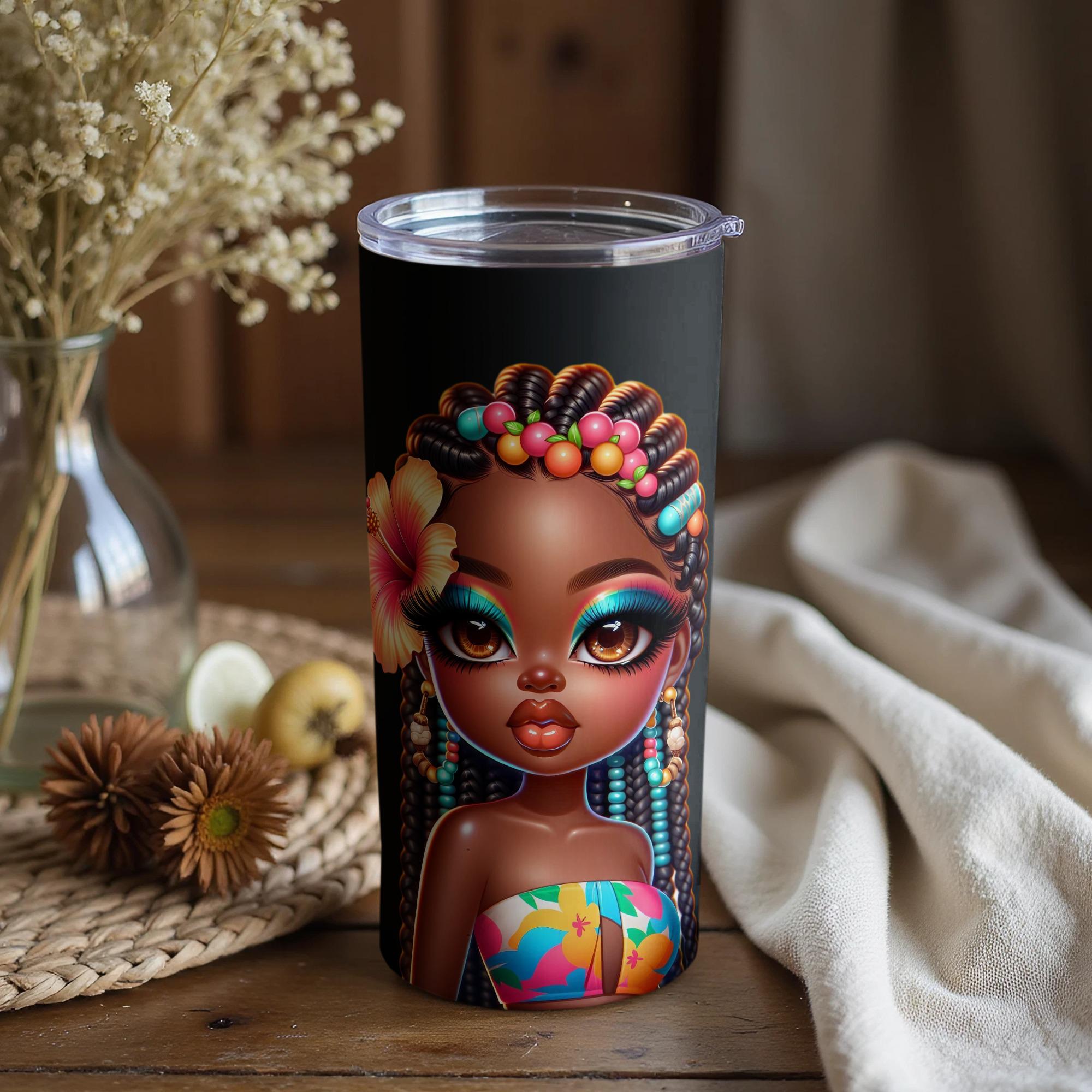 Elevate your beverage experience with this captivating tumbler, adorned with a stunning AI generated image of a beautiful African American girl. Her vibrant makeup and hibiscus flower detail create a unique and eye catching design.