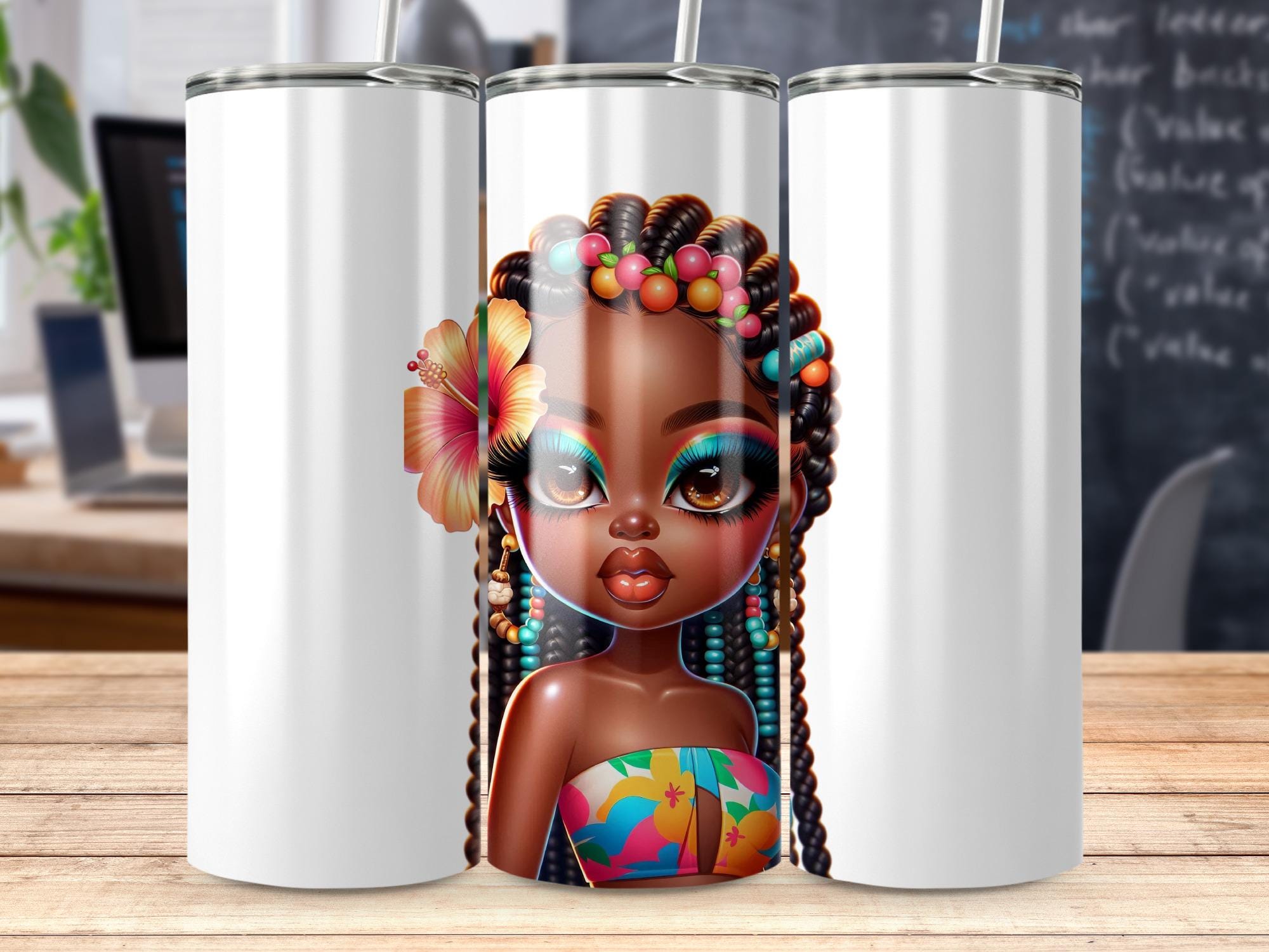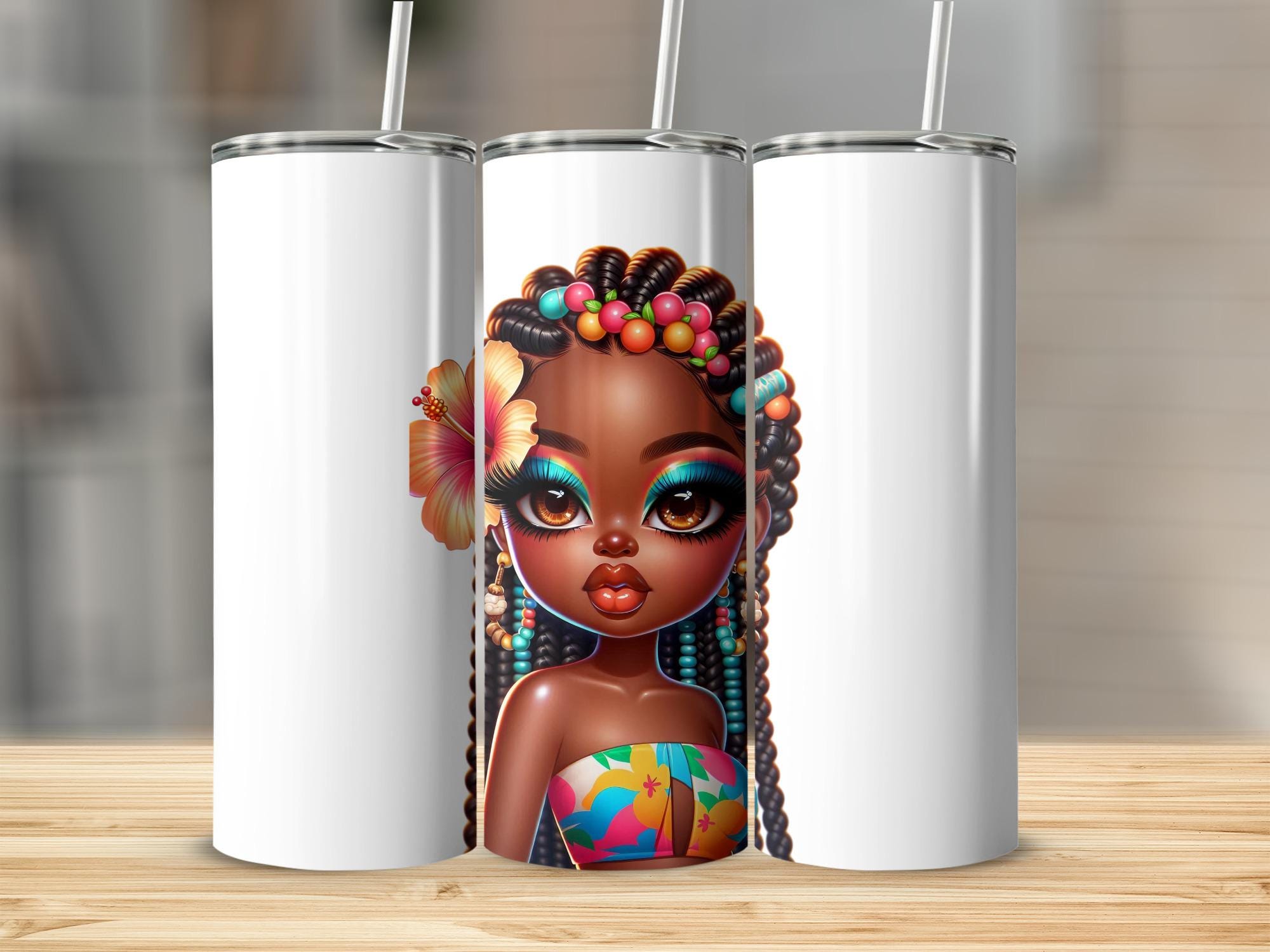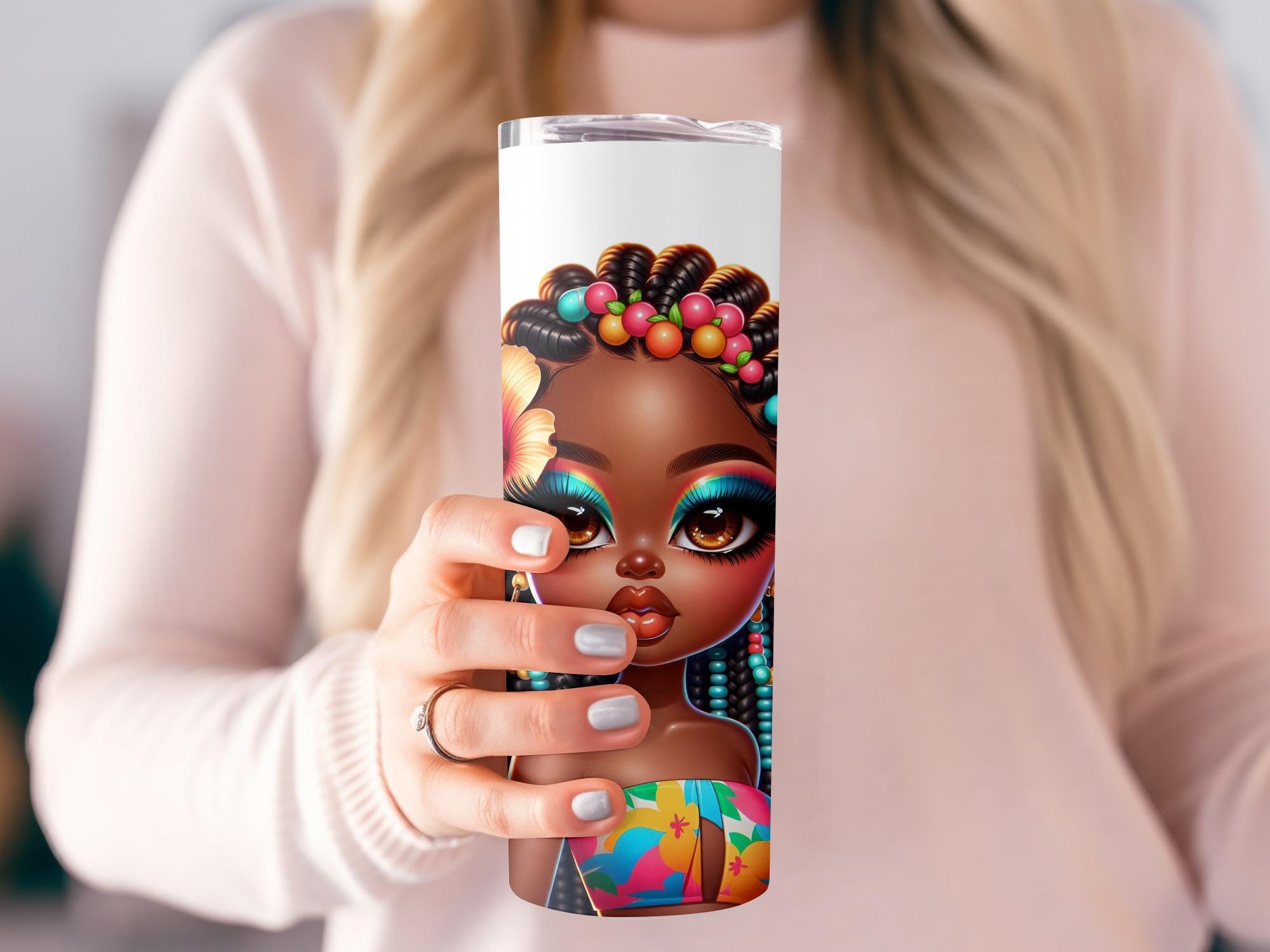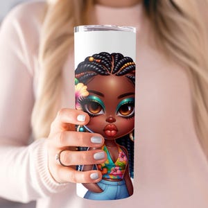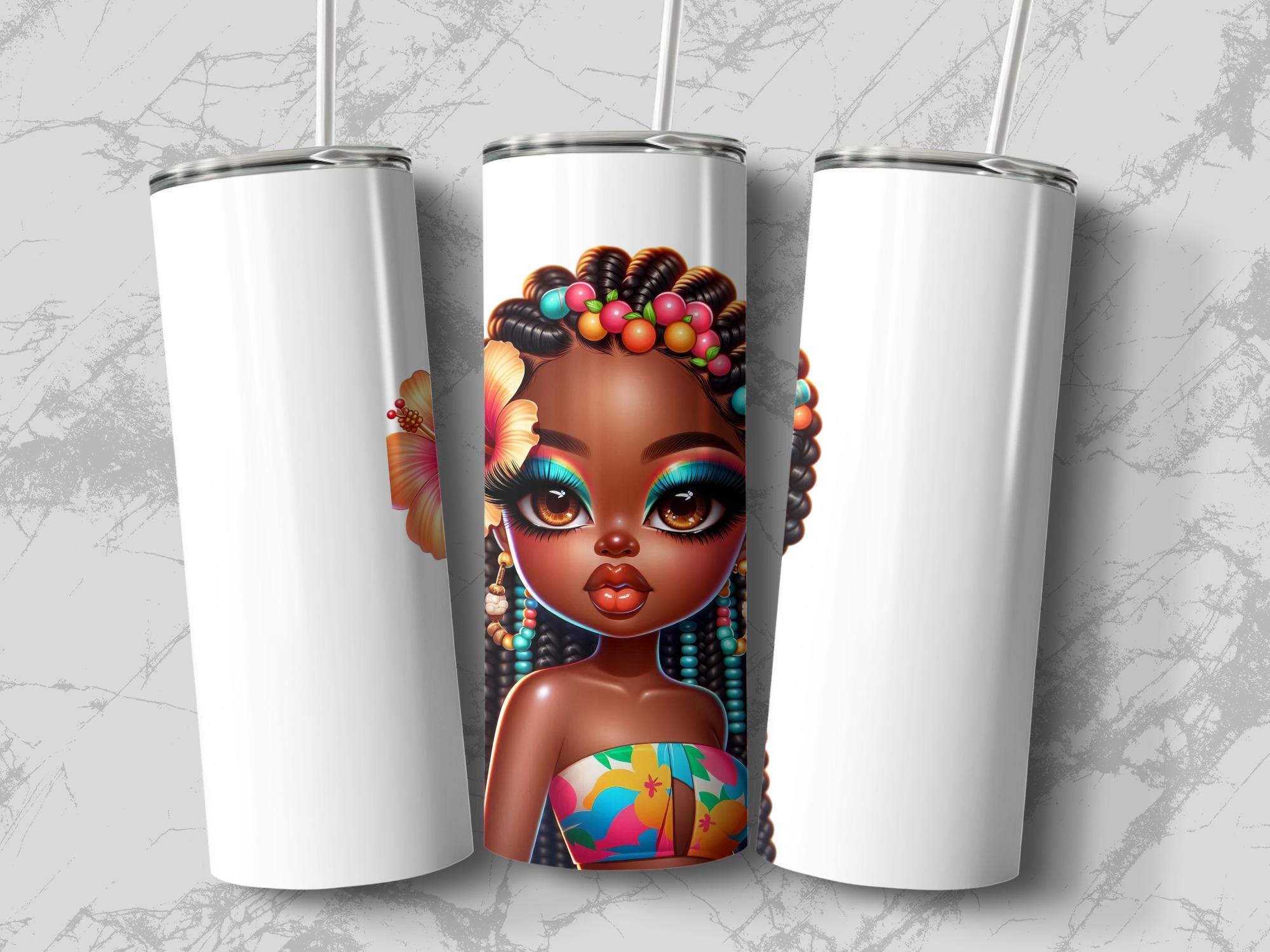 Elevate your beverage experience with this captivating tumbler, adorned with a stunning AI generated image of a beautiful African American girl. Her vibrant makeup and hibiscus flower detail create a unique and eye catching design.