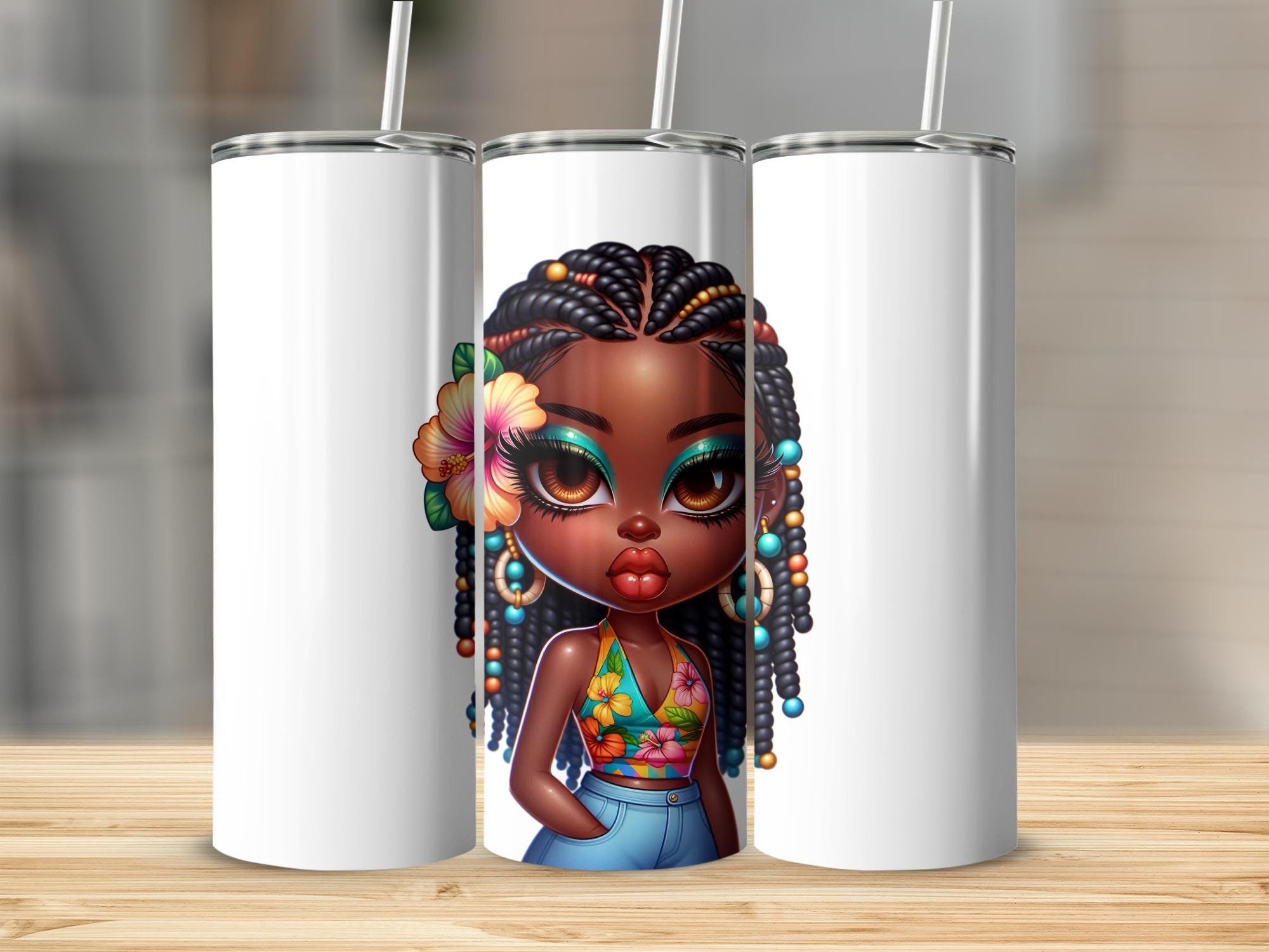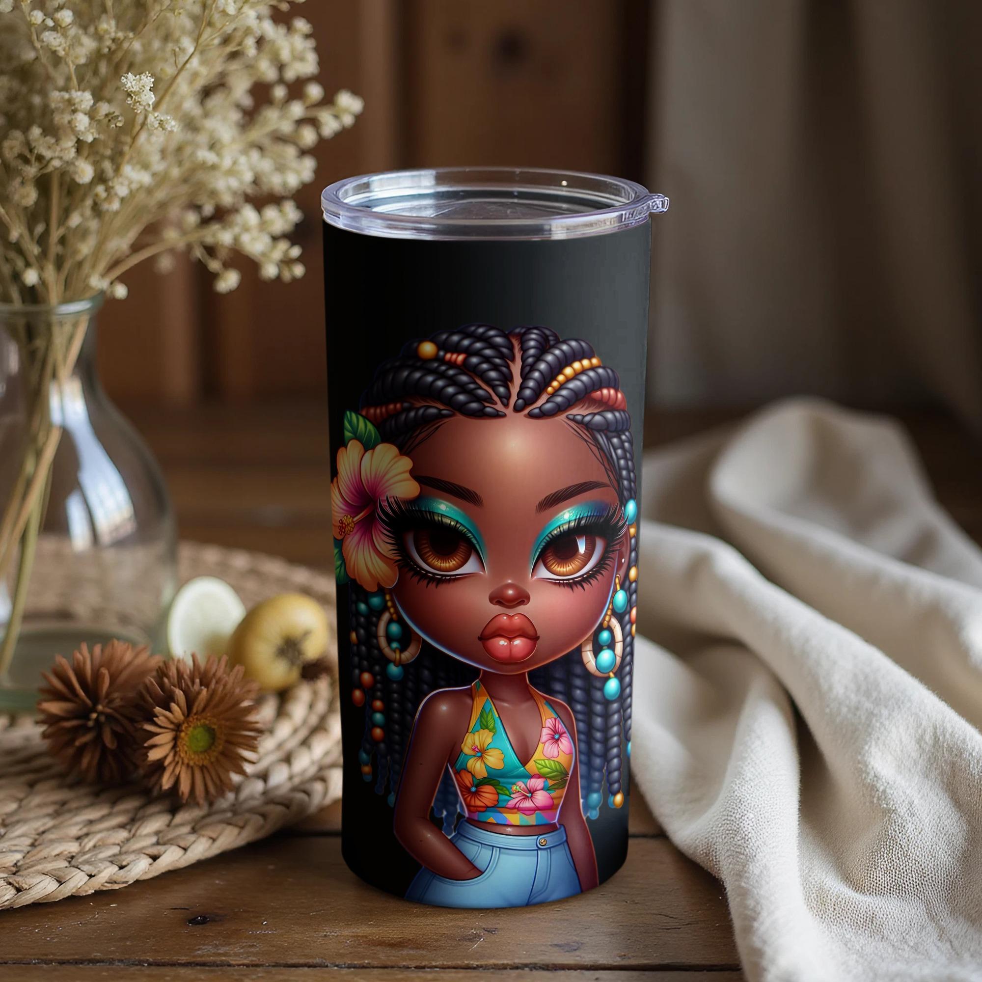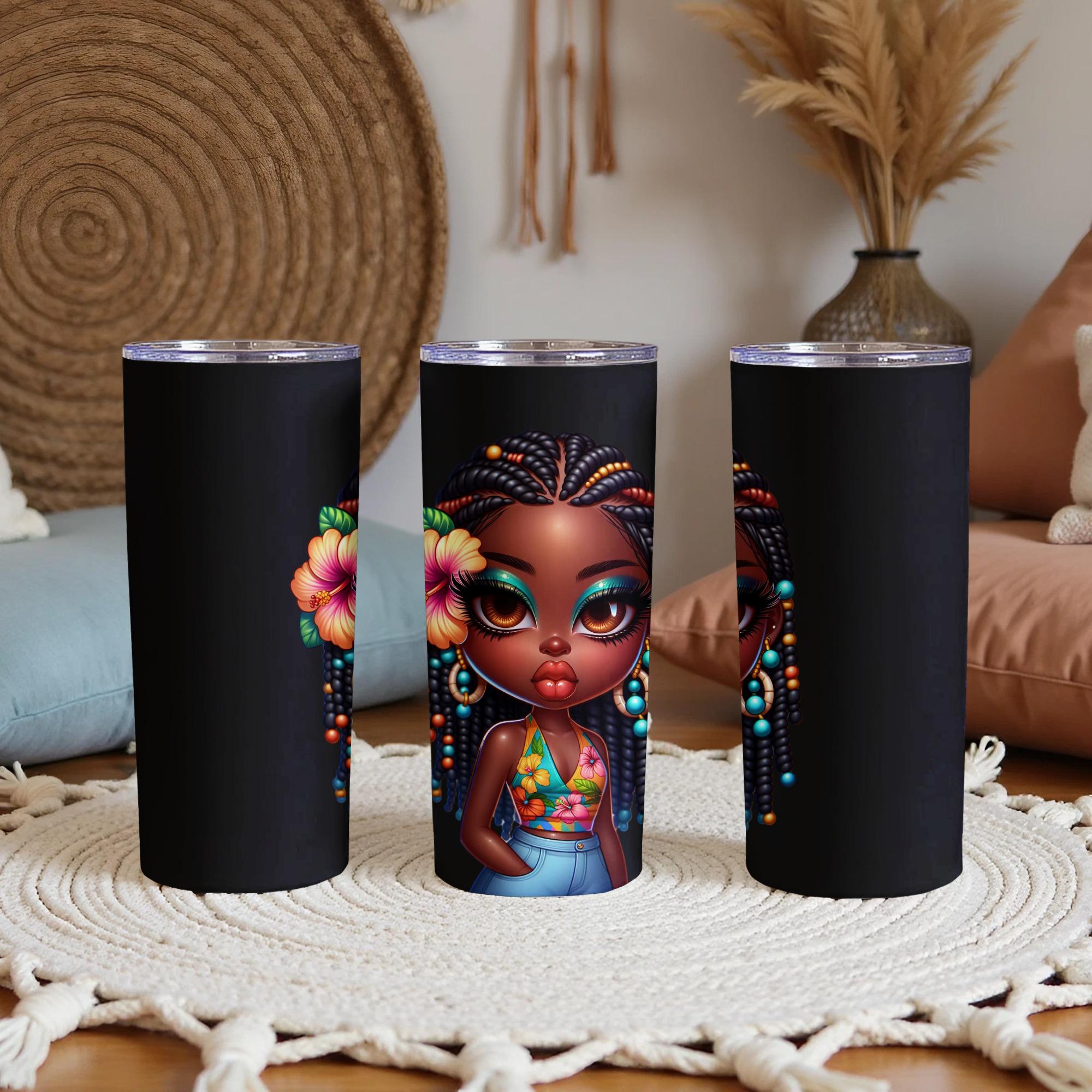 This trendy tumbler features a cute cartoon depiction of a stylish black girl. This design is perfect for anyone who loves unique and eye catching drinkware. It makes a great gift for friends, family, or yourself!