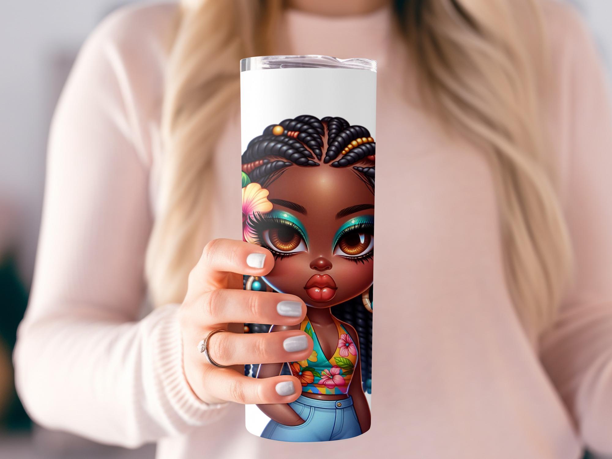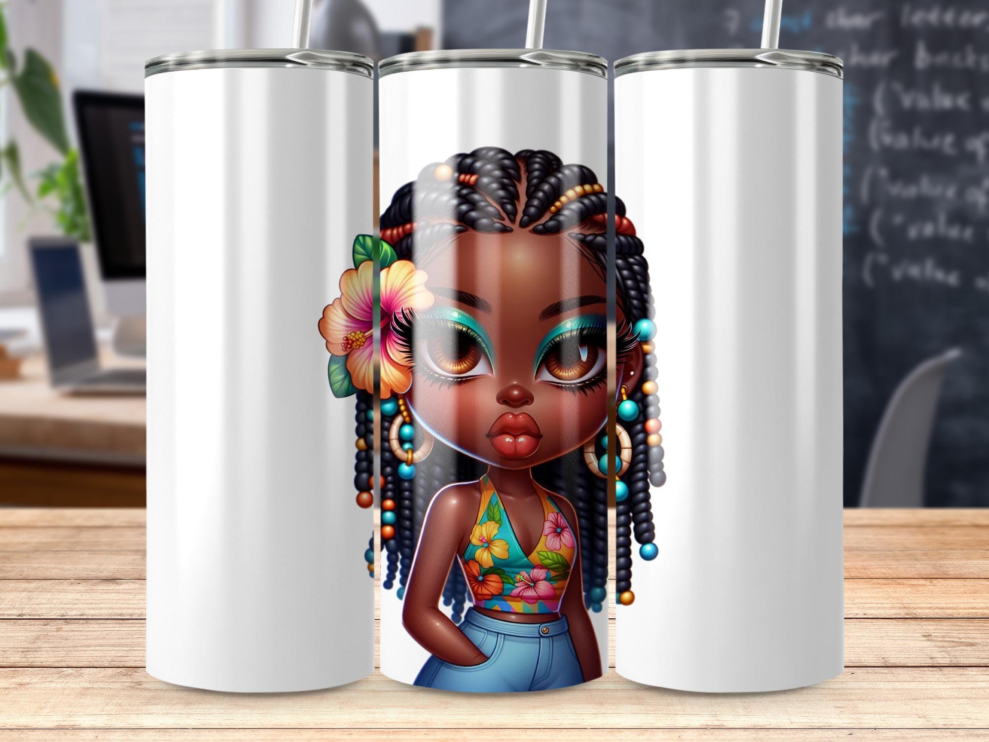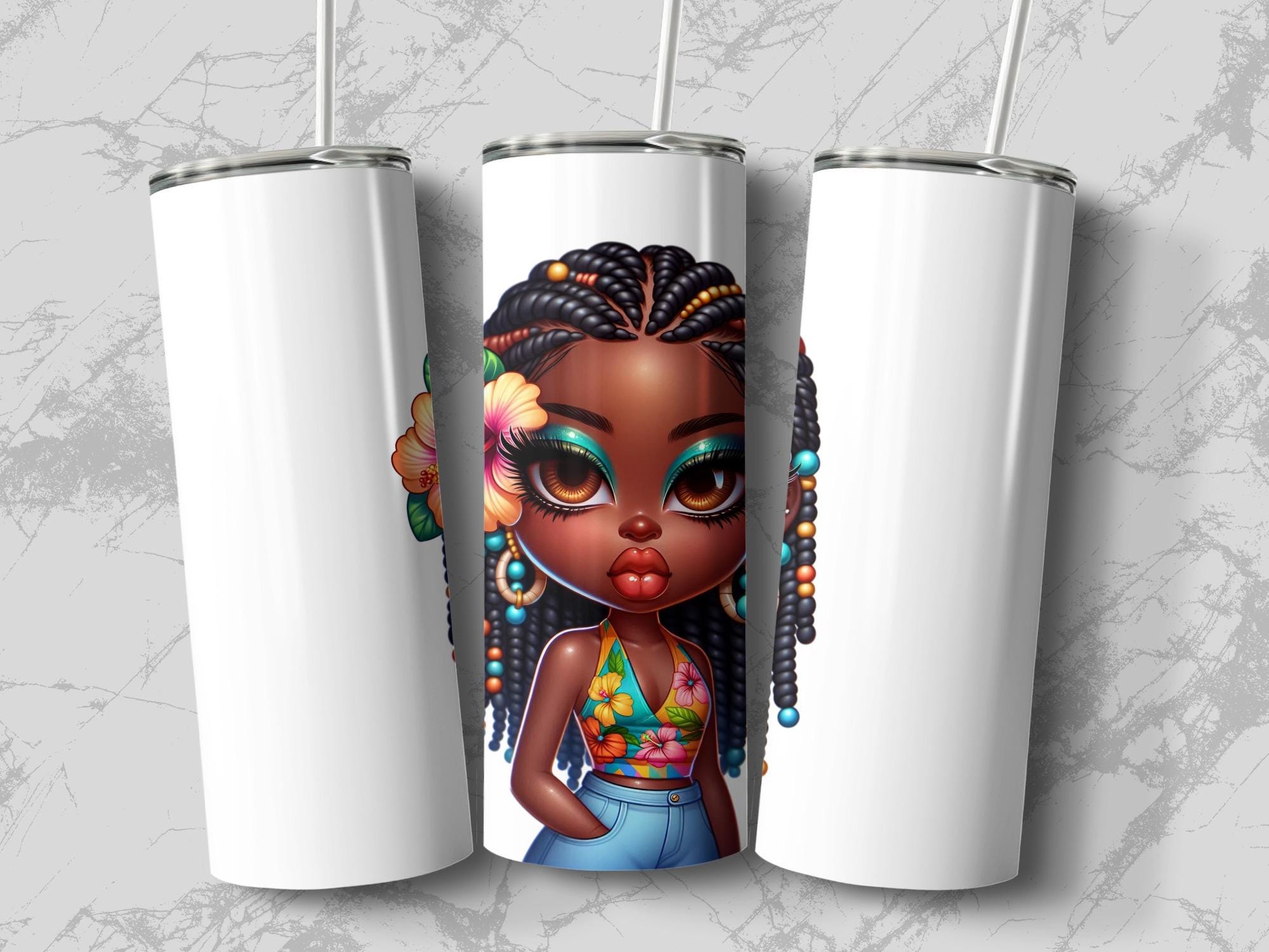 This trendy tumbler features a cute cartoon depiction of a stylish black girl. This design is perfect for anyone who loves unique and eye catching drinkware. It makes a great gift for friends, family, or yourself!