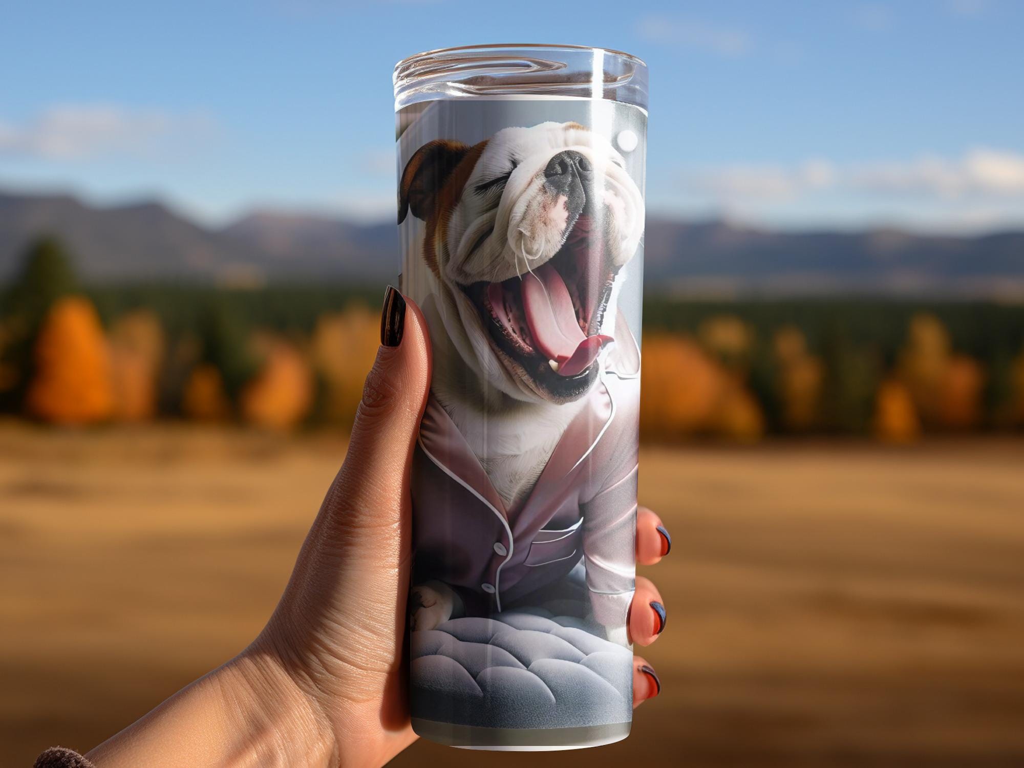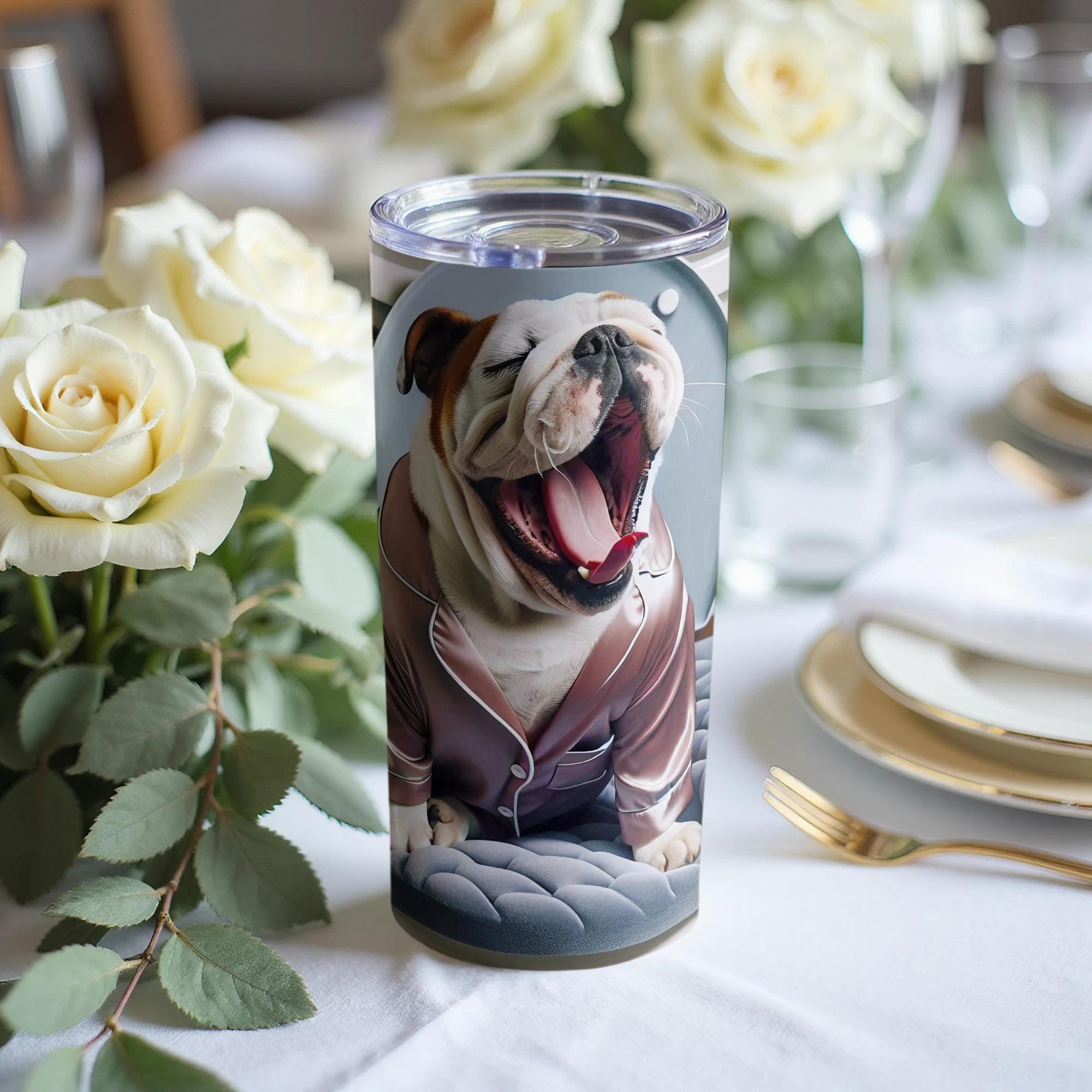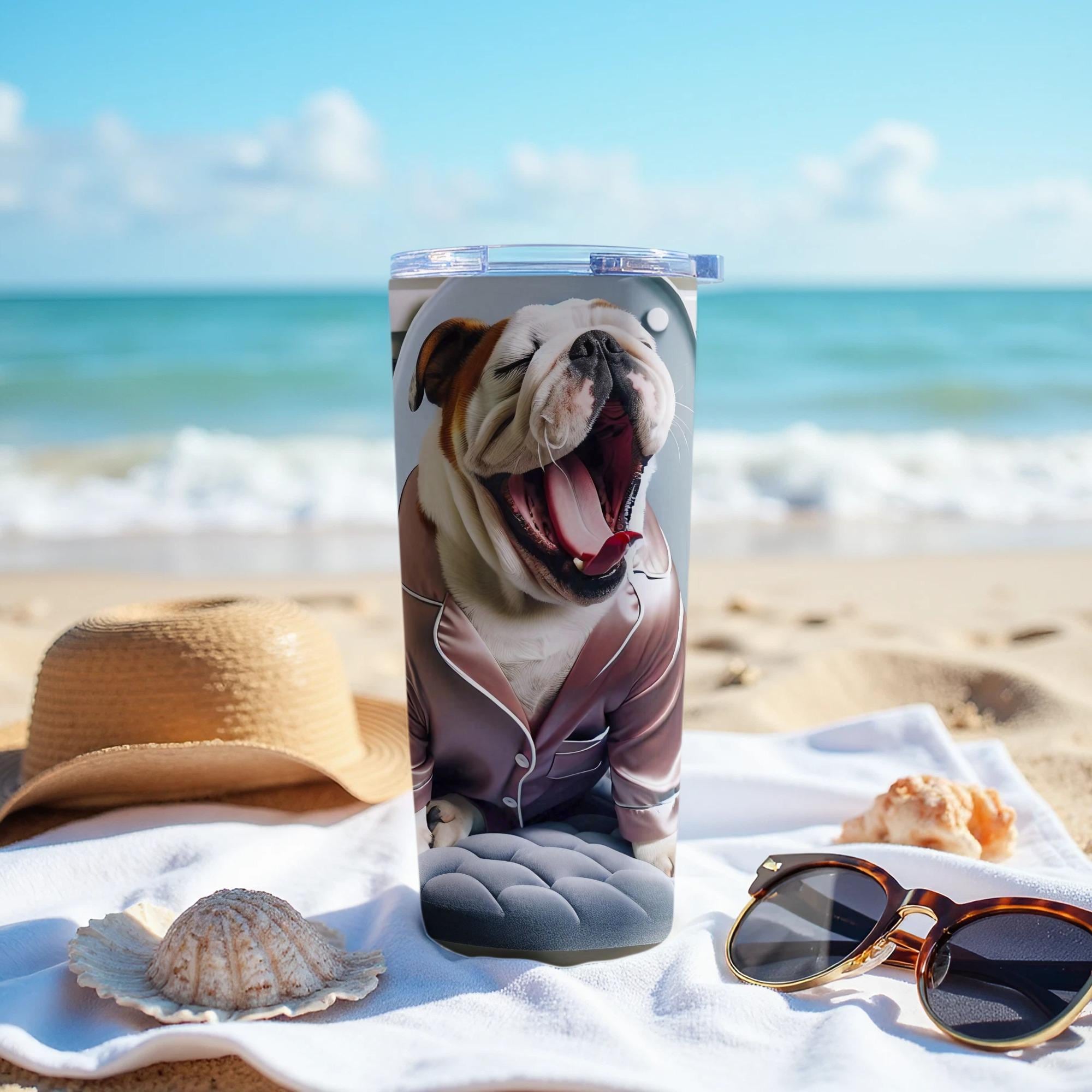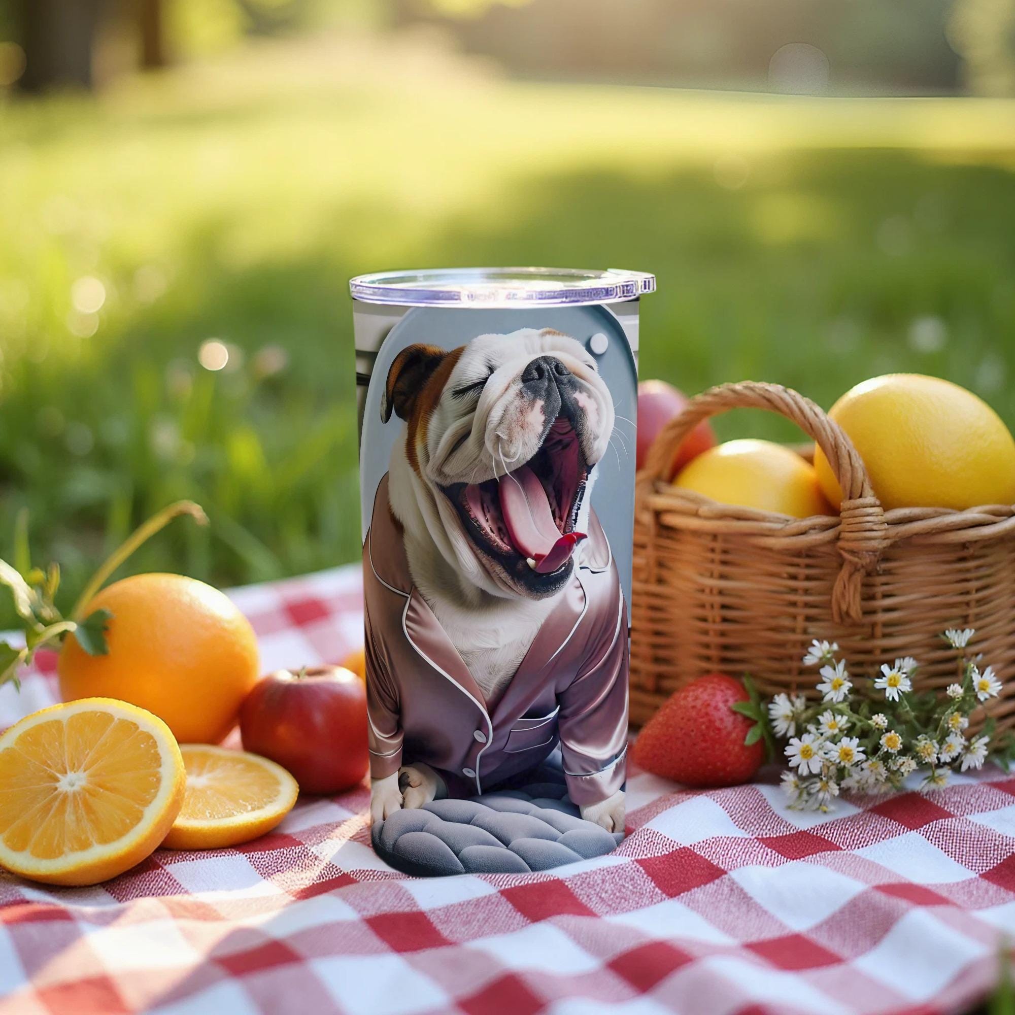 Elevate your daily hydration with this unique and eye-catching Tumbler. Featuring a hilarious image of a yawning Bulldog wearing pajamas, this tumbler is sure to bring a smile to your face every time you use it.