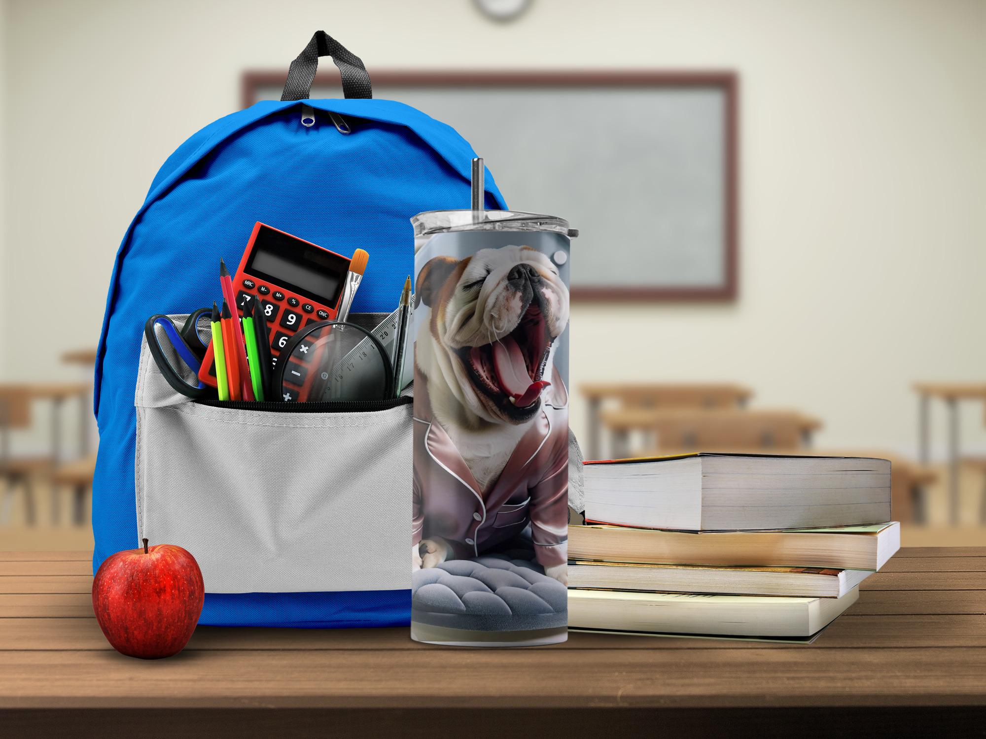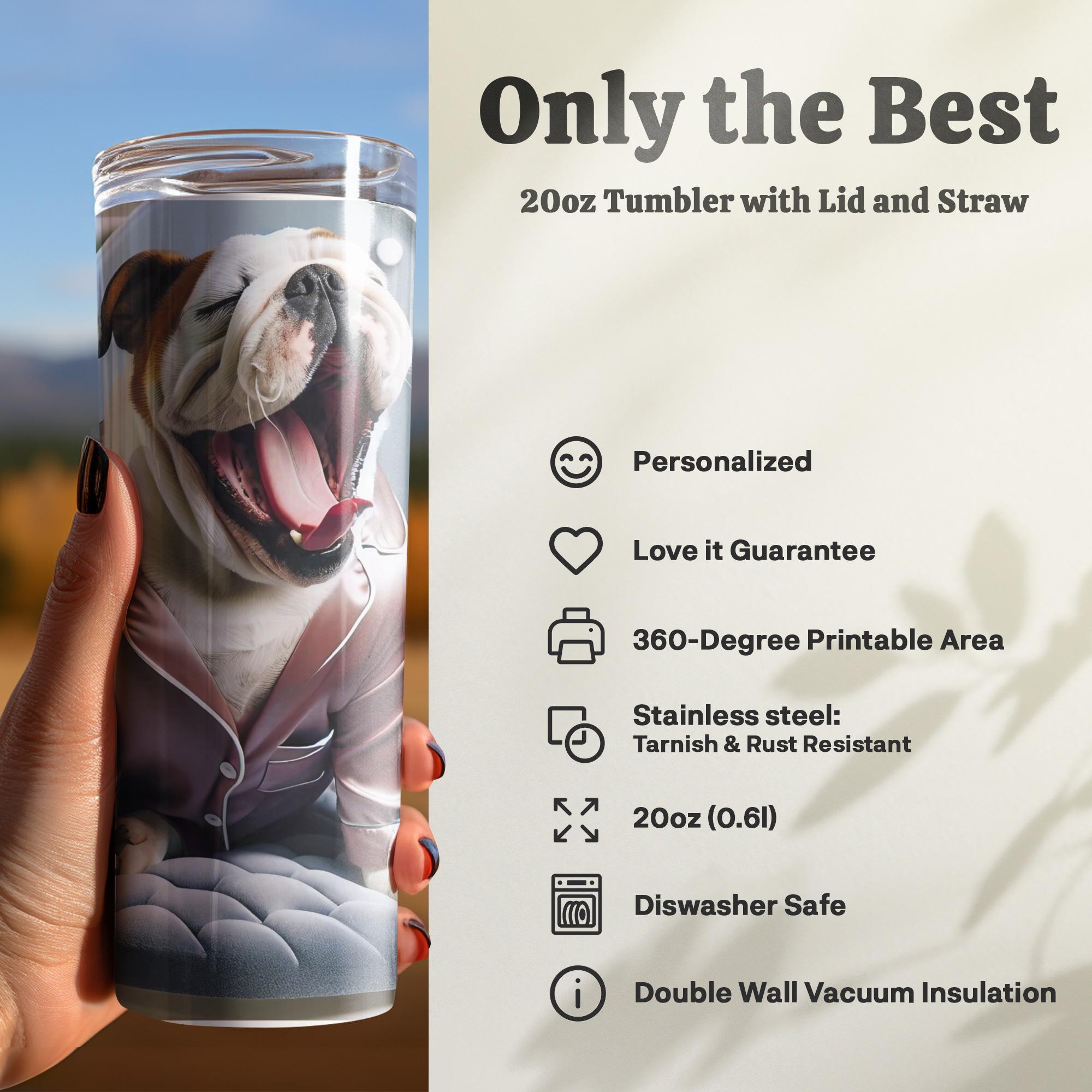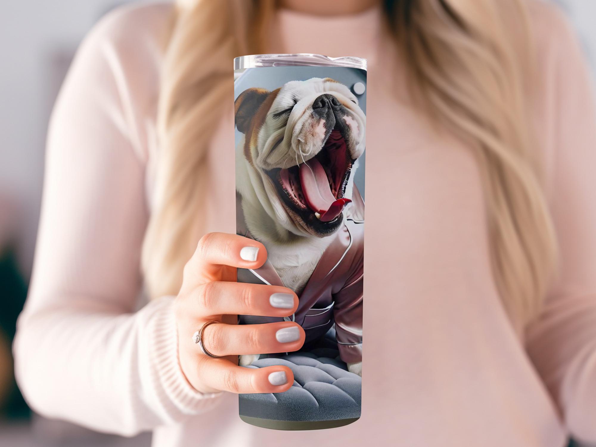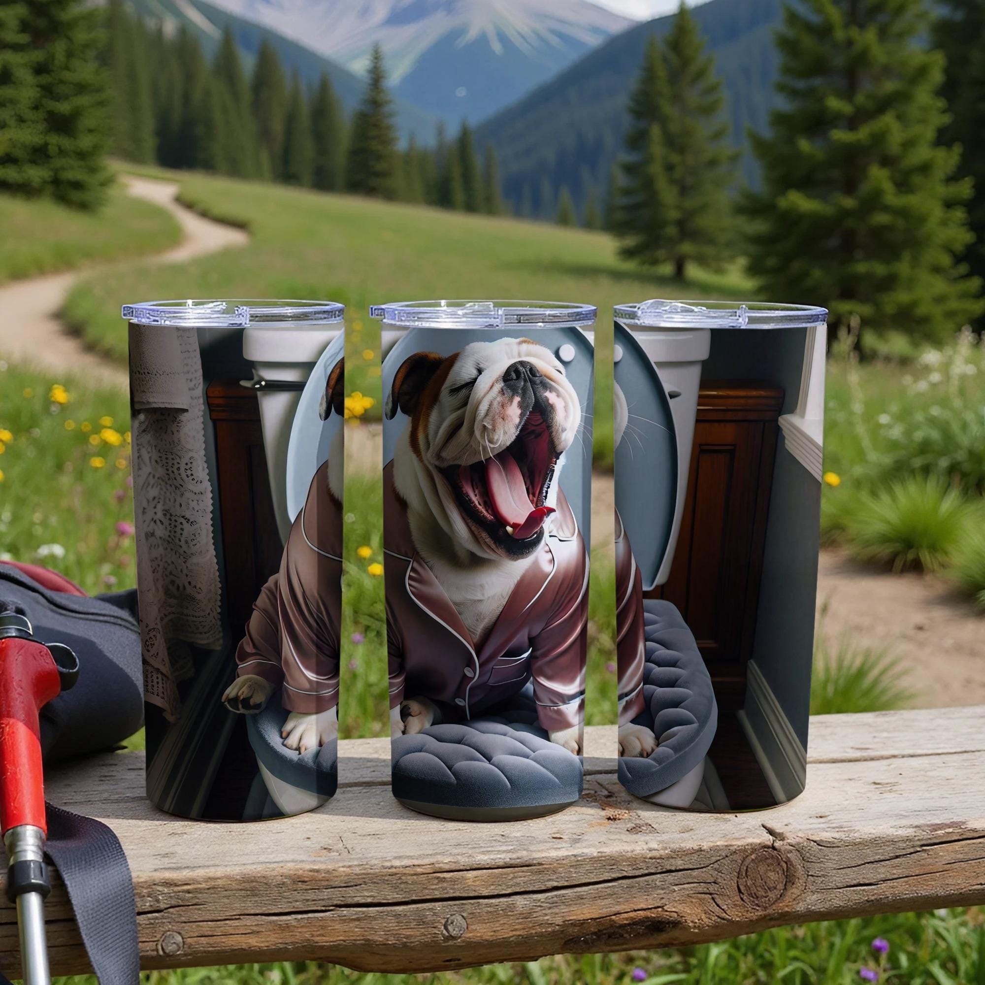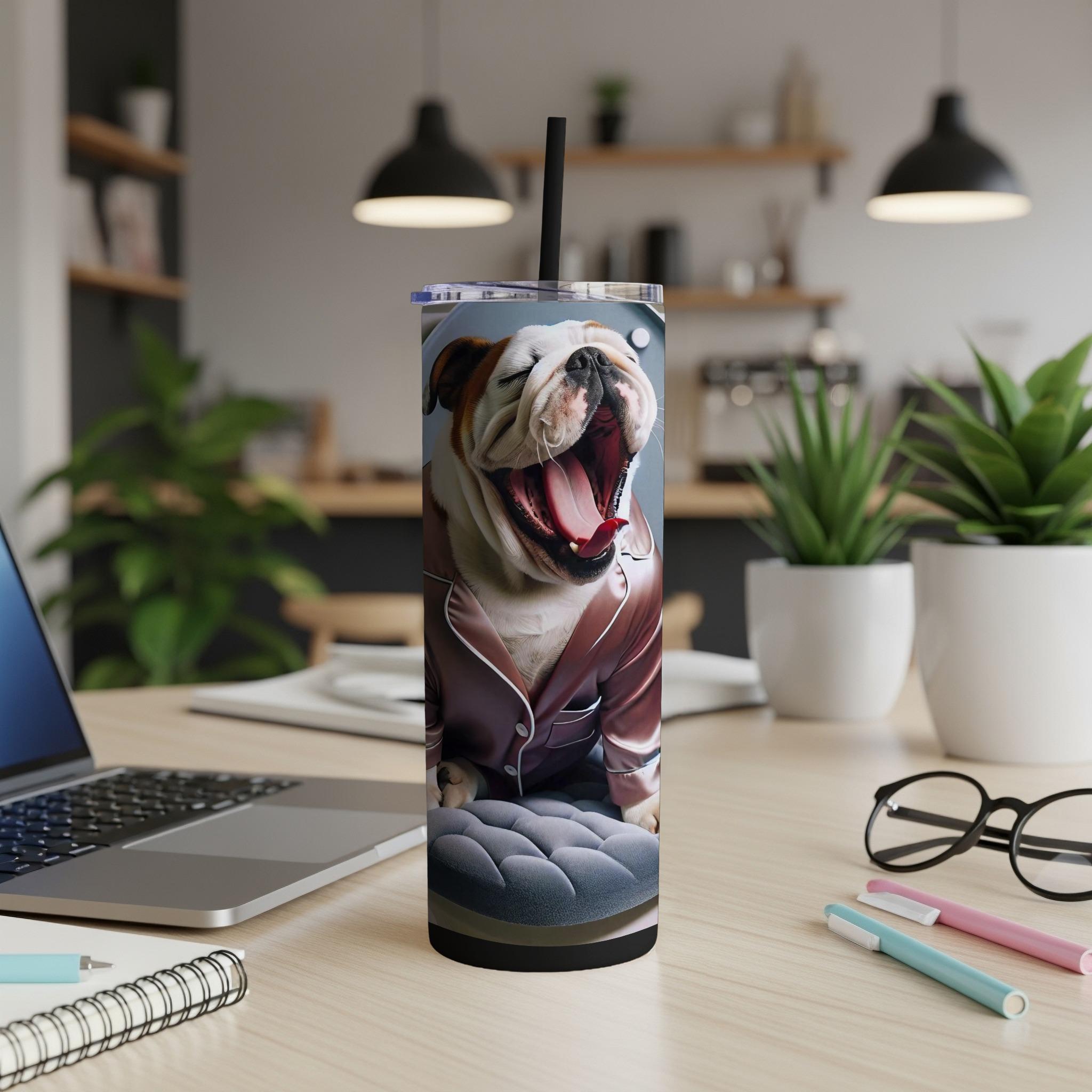 Elevate your daily hydration with this unique and eye-catching Tumbler. Featuring a hilarious image of a yawning Bulldog wearing pajamas, this tumbler is sure to bring a smile to your face every time you use it.