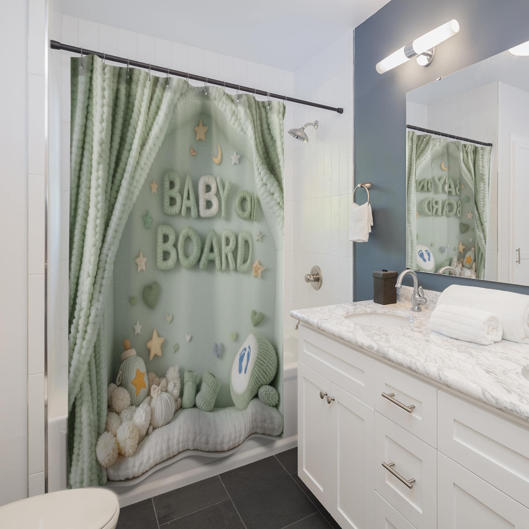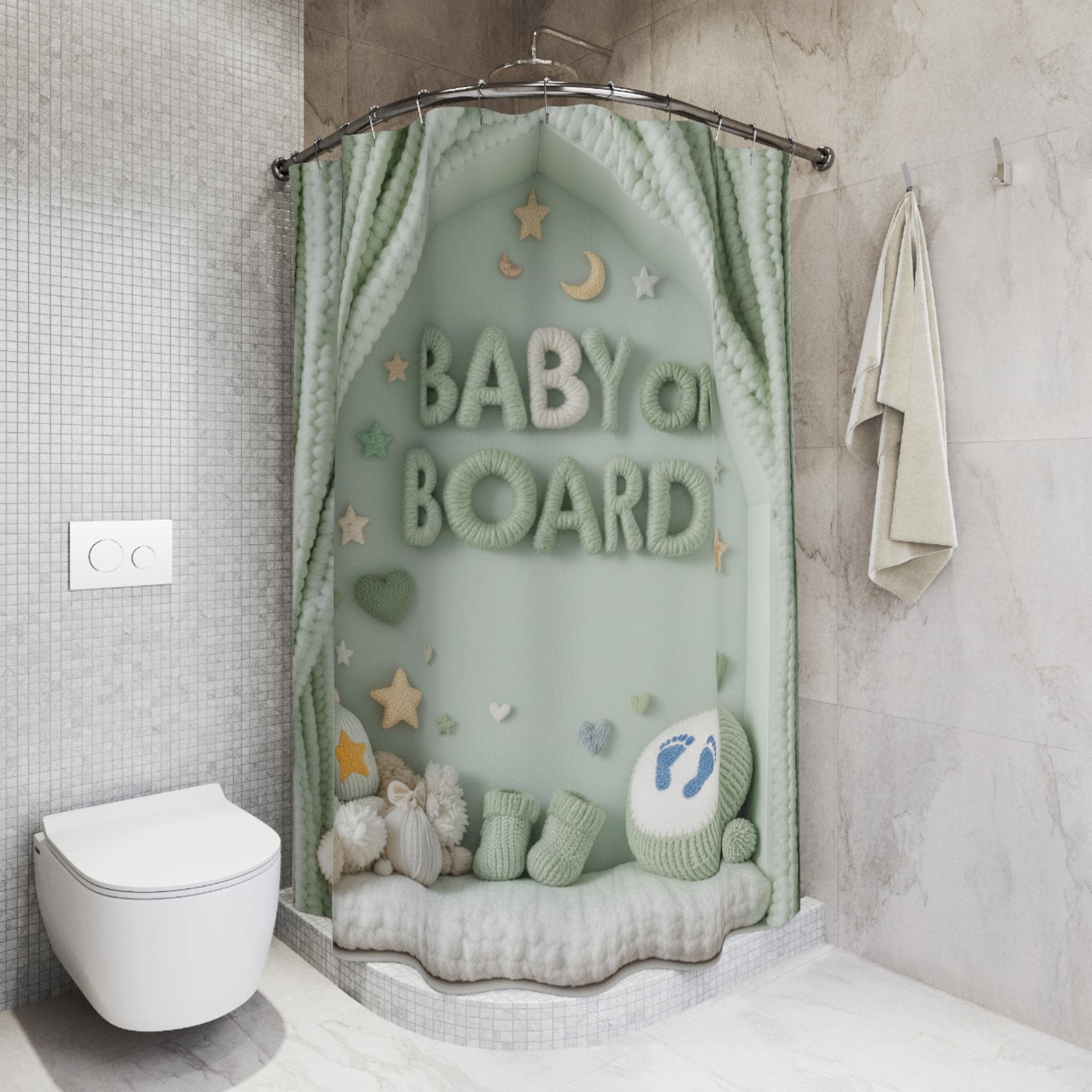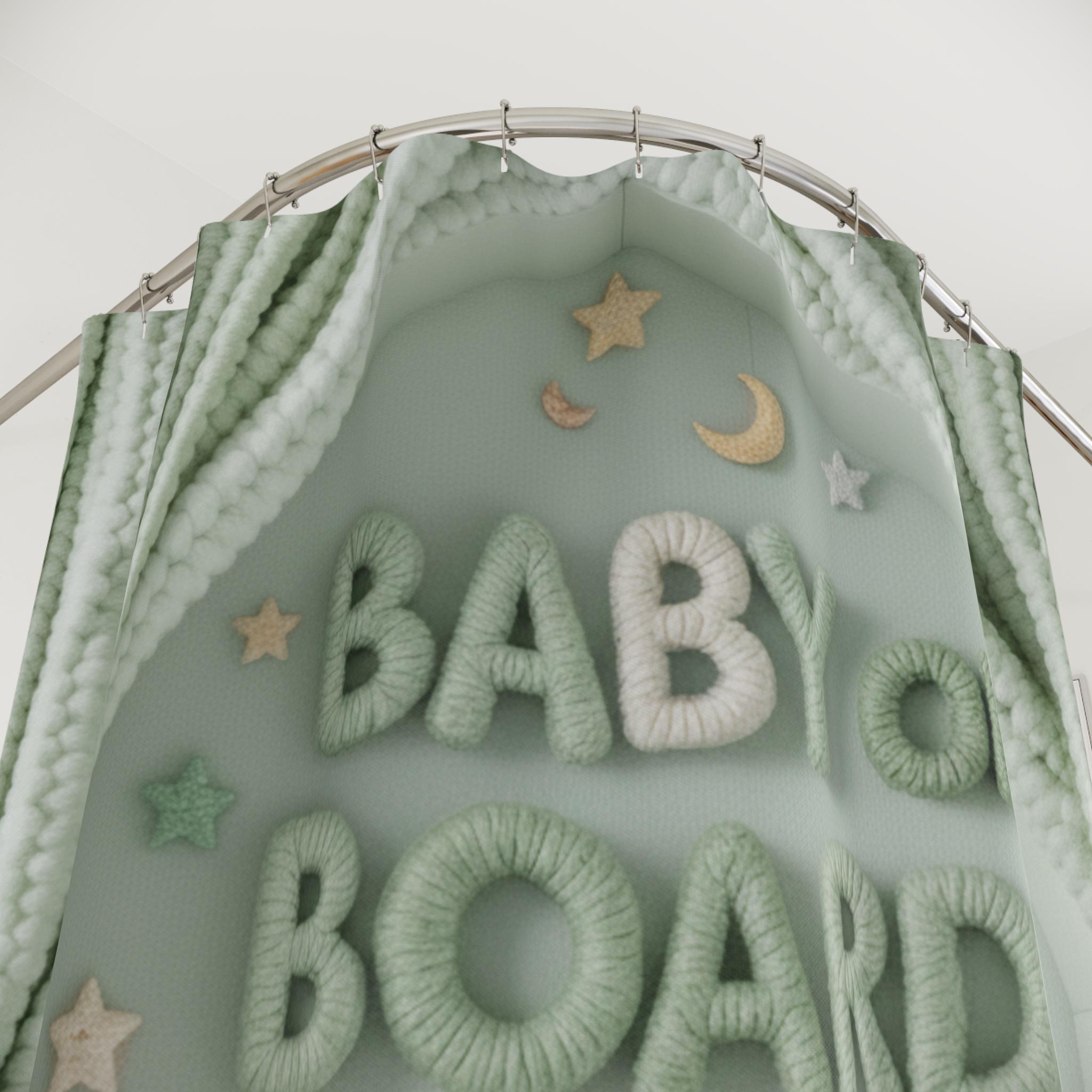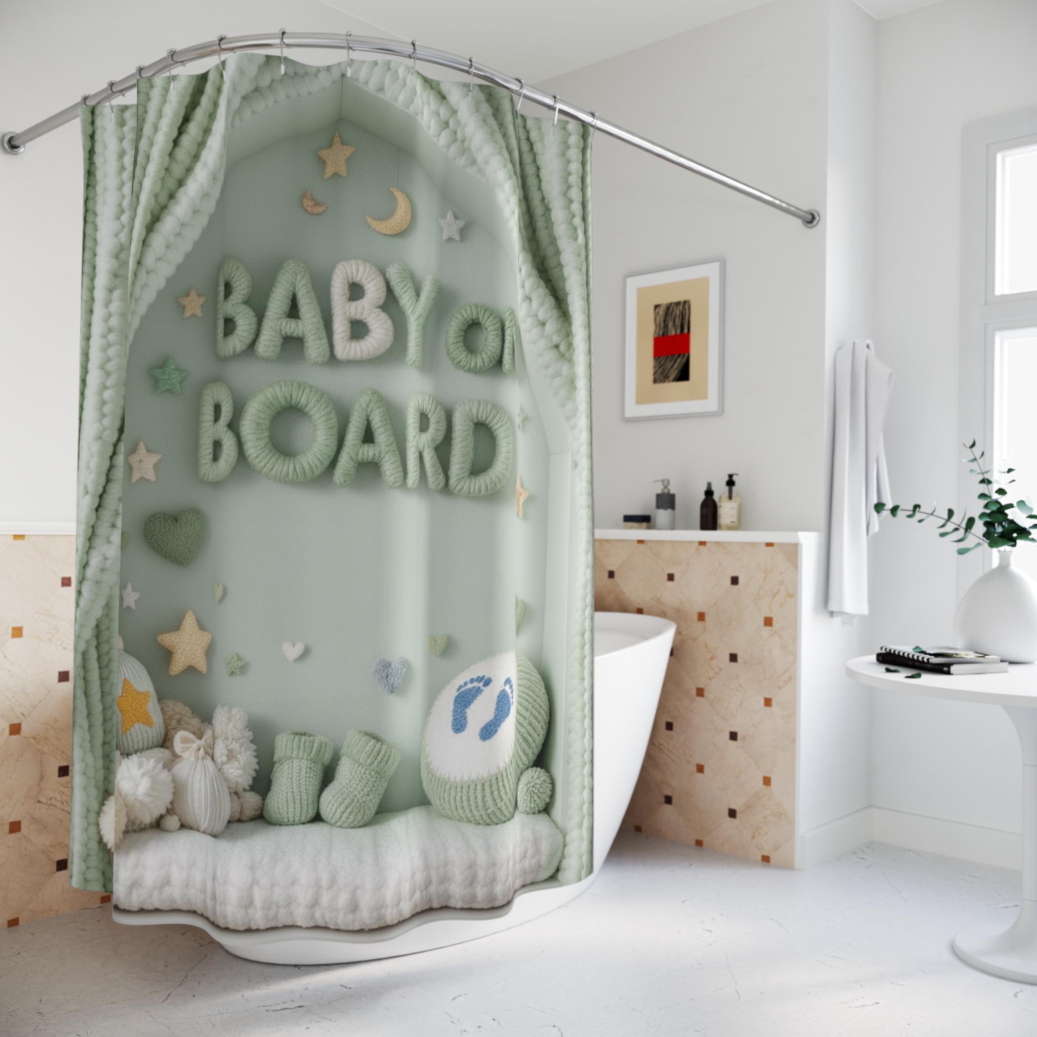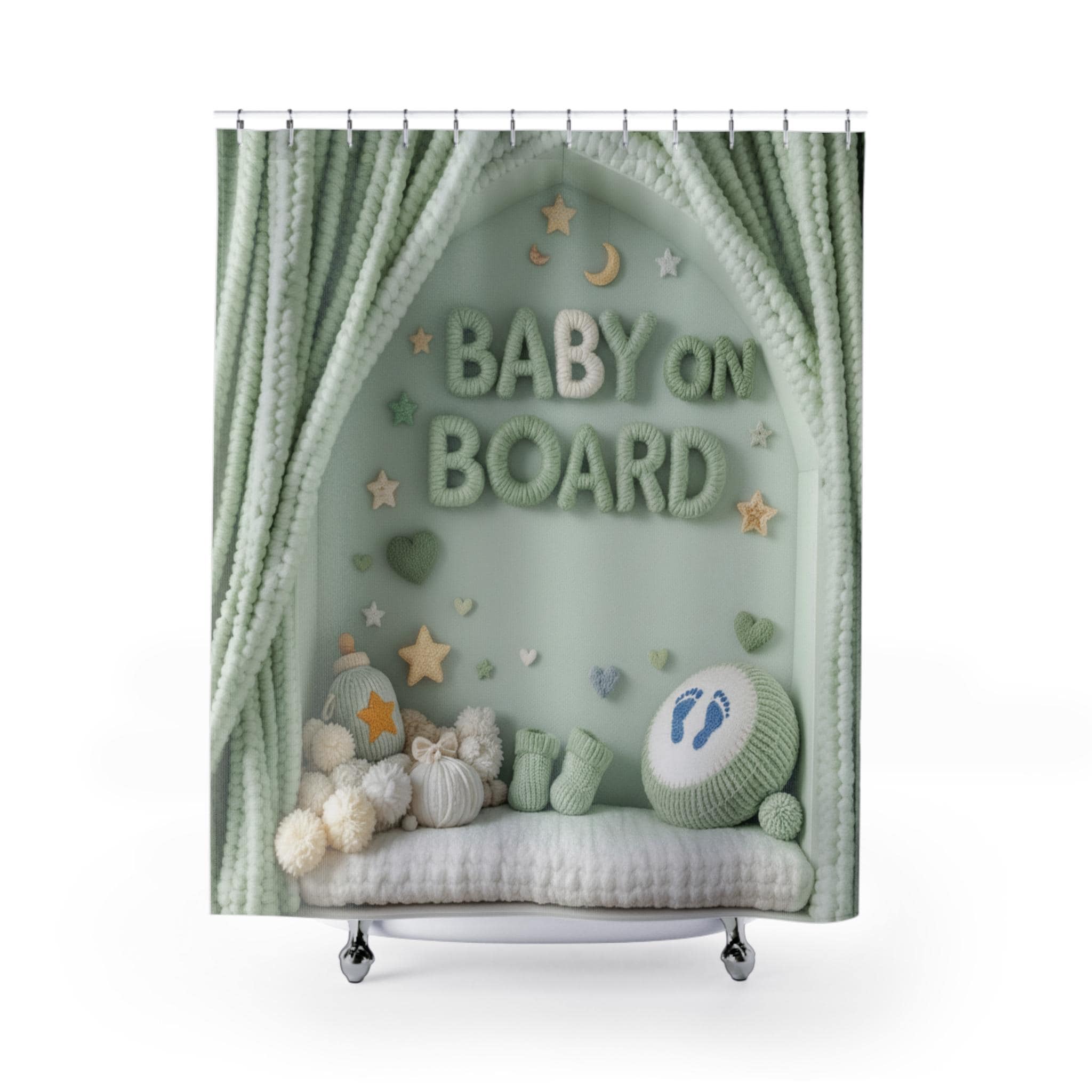 Soft, dreamy, and quietly joyful — this shower curtain turns a simple bathroom into a cozy nursery scene. Gentle sage-green tones and plush, yarn-like lettering spell out "BABY ON BOARD" beneath a scalloped canopy of knitted curtains. Tiny stars, moons, and soft pom-pom details create a calm, whimsical backdrop that soothes during quick morning routines or slow, candlelit baths. It feels like a handmade keepsake draped across your tub, bringing a touch of nursery comfort to a parent's bathroom or a baby-shower-themed powder room.